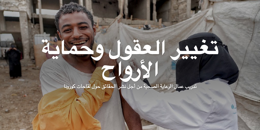 في اليمن كما في أي مكان آخر حول العالم، شكلت المعلومات المضللة على نطاق واسع حول لقاحات كورونا تهديداً رئيساً للصحة العامة، وبدعم من مركز الملك سلمان للإغاثة والأعمال الإنسانية، دربت منظمة الصحة العالمية أكثر من (1100) من العاملين الصحيين والمتطوعين المجتمعيين لنشر معلومات واقعية عن اللقاحات، مما دفع العديد من اليمنيين للاقبال عليه.