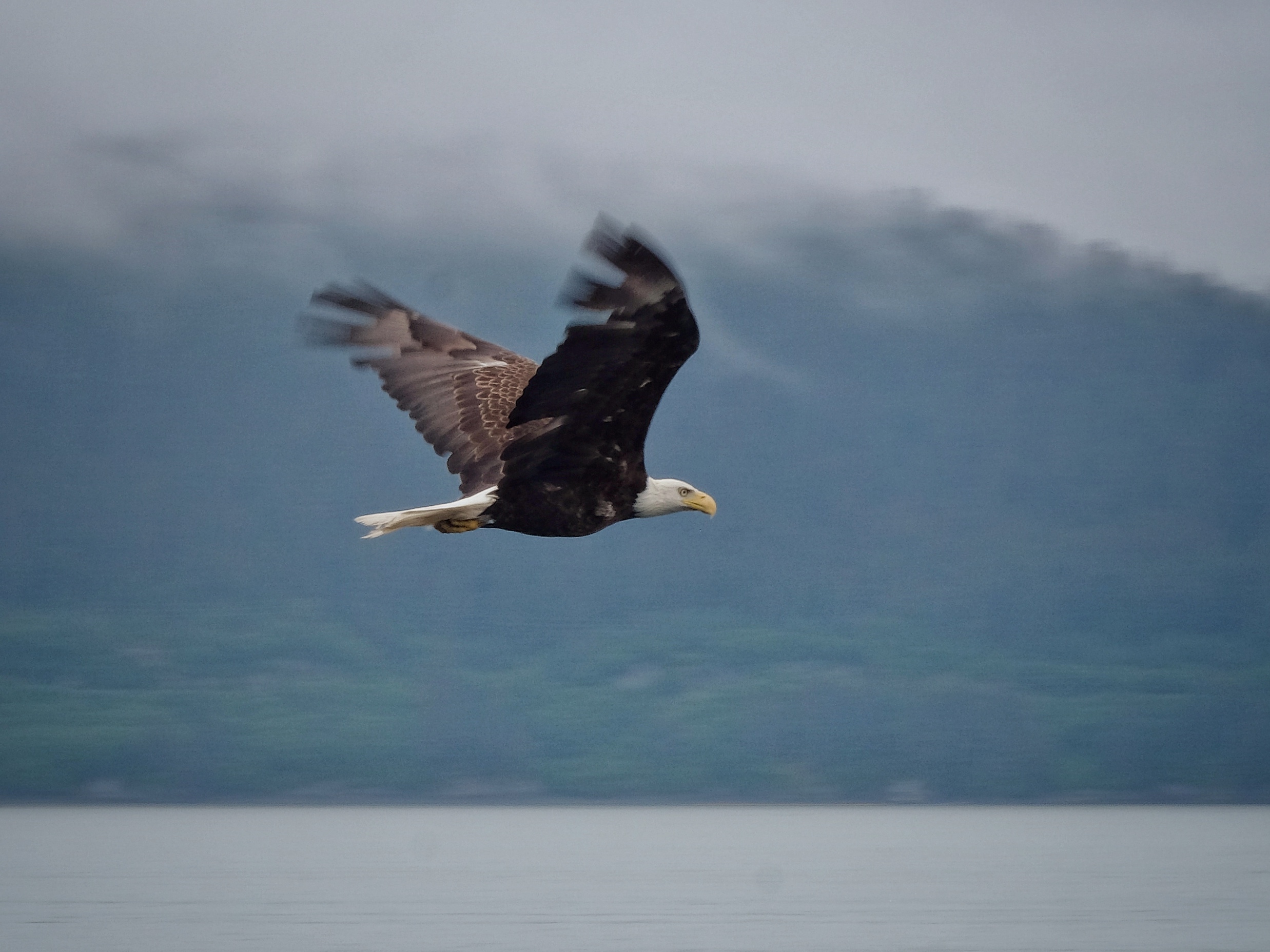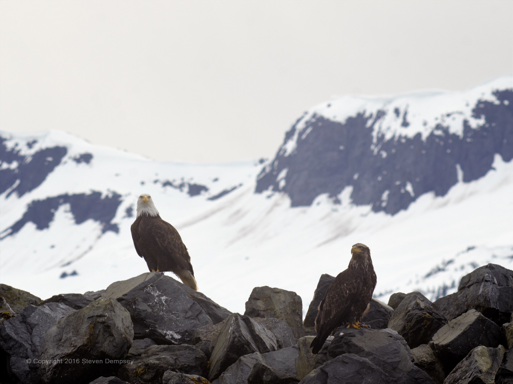 Nothing says Alaska like bald eagles and snow-covered mountains. Here, an adult and adolescent eagle wait by the harbor in Haines for discarded fish guts to emerge from fishing boats.