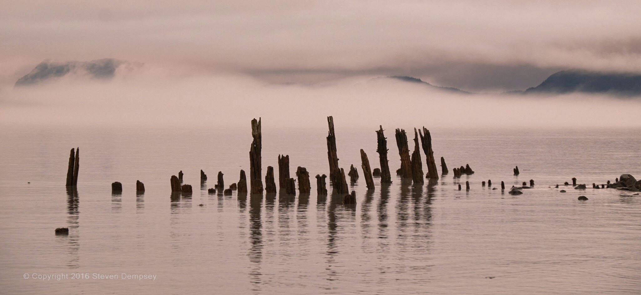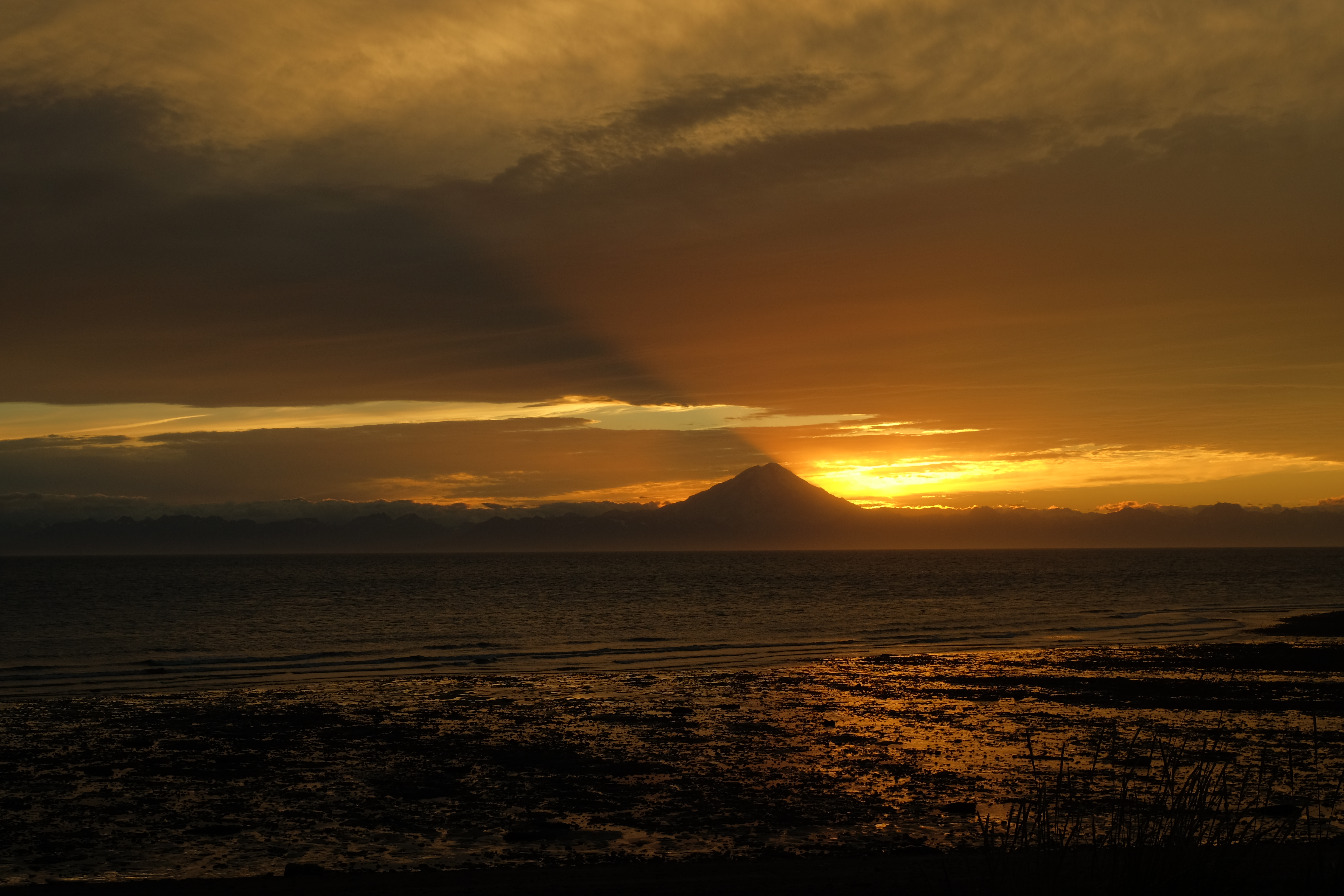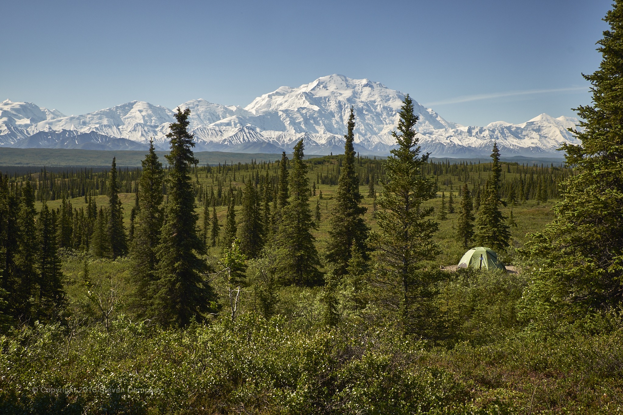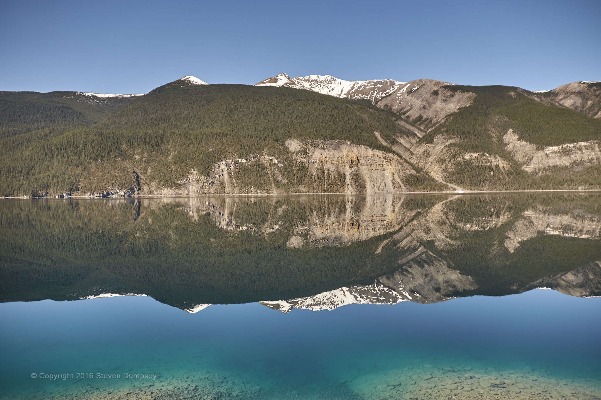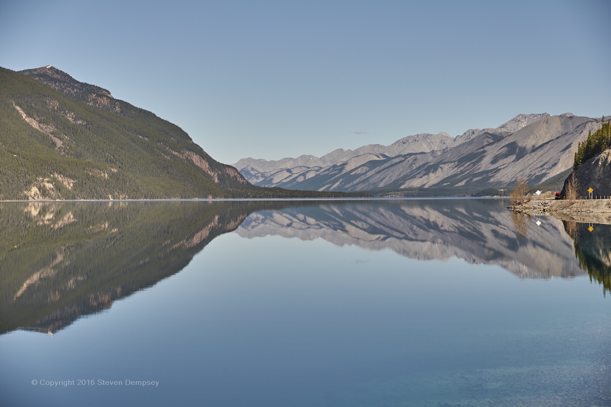 Although not located in Alaska, this is a shot of Muncho Lake in British Columbia on the way north. I was stricken by the mirror-like surface in the middle of the day! A rarity, in my experience.