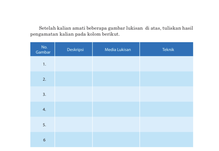 Setelah kalian menyimak, buatlah kelompok maksimal 6 orang dan buatlah apresiasi terhadap karya lukis tersebut sesuai pertanyaan dalam tabel berikut ini ( kerjakan dikertas selembar )