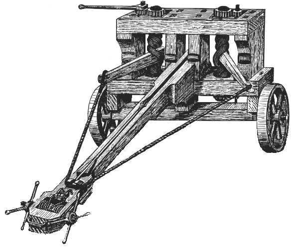 Another type of catapult is the Mangonel. It's the simplest kind of catapult and usually the first thing that comes to mind when a word catapult comes into mind. The Mangonel consists of a long wood arm with a bucket with a rope attached to the end. The arm is then pulled back then energy was stored in the tension of the rope and the arm. Then the bucket would be loaded. When released the Mangonel's arm would return to its equilibrium position, when it came in contact with the beam the arm would stop but the missiles stored in the bucket would continue to launch toward the enemy (catapult.sites).