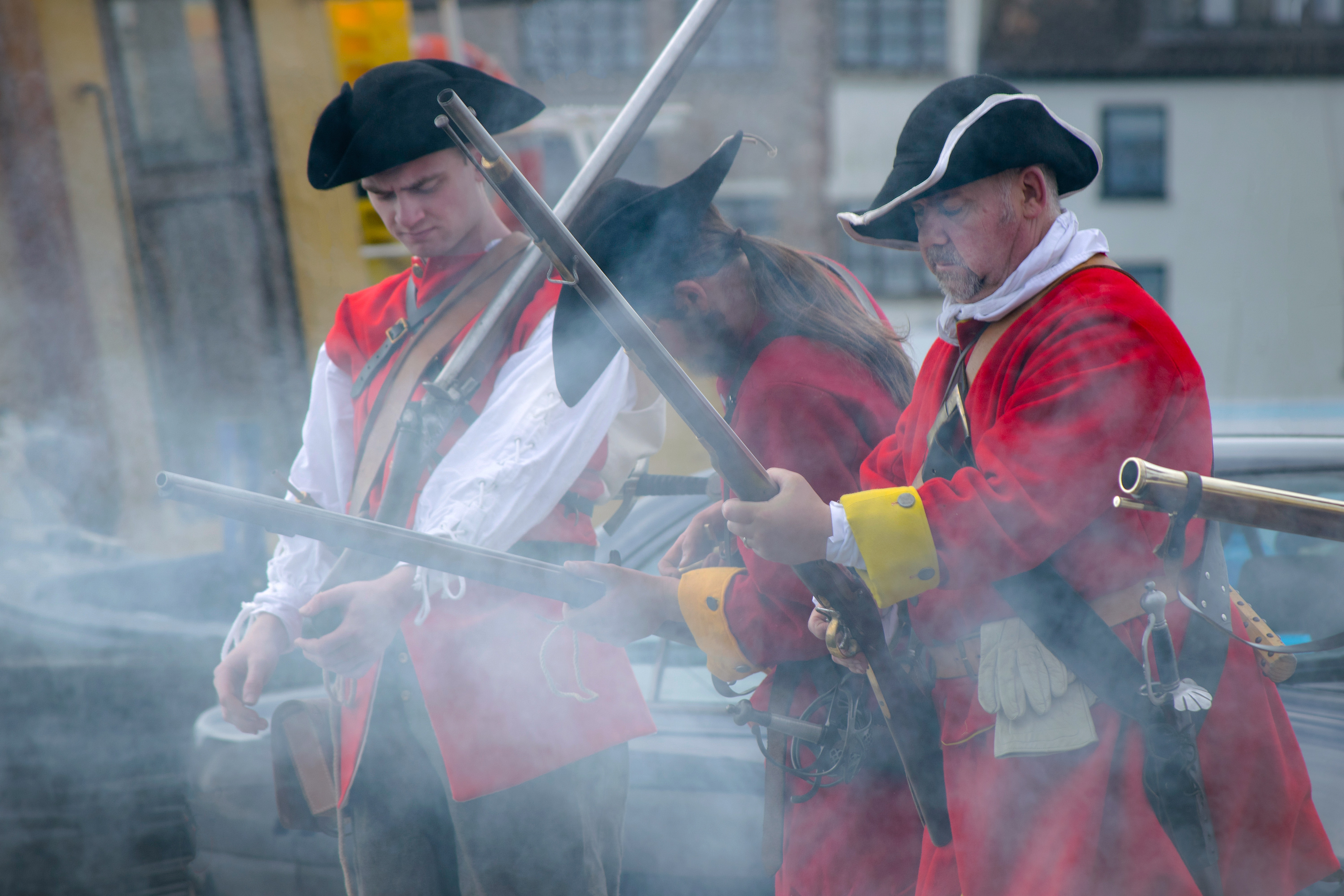 Once the guns have been discharged the musketeers quickly reload amongst a plume of smoke.
