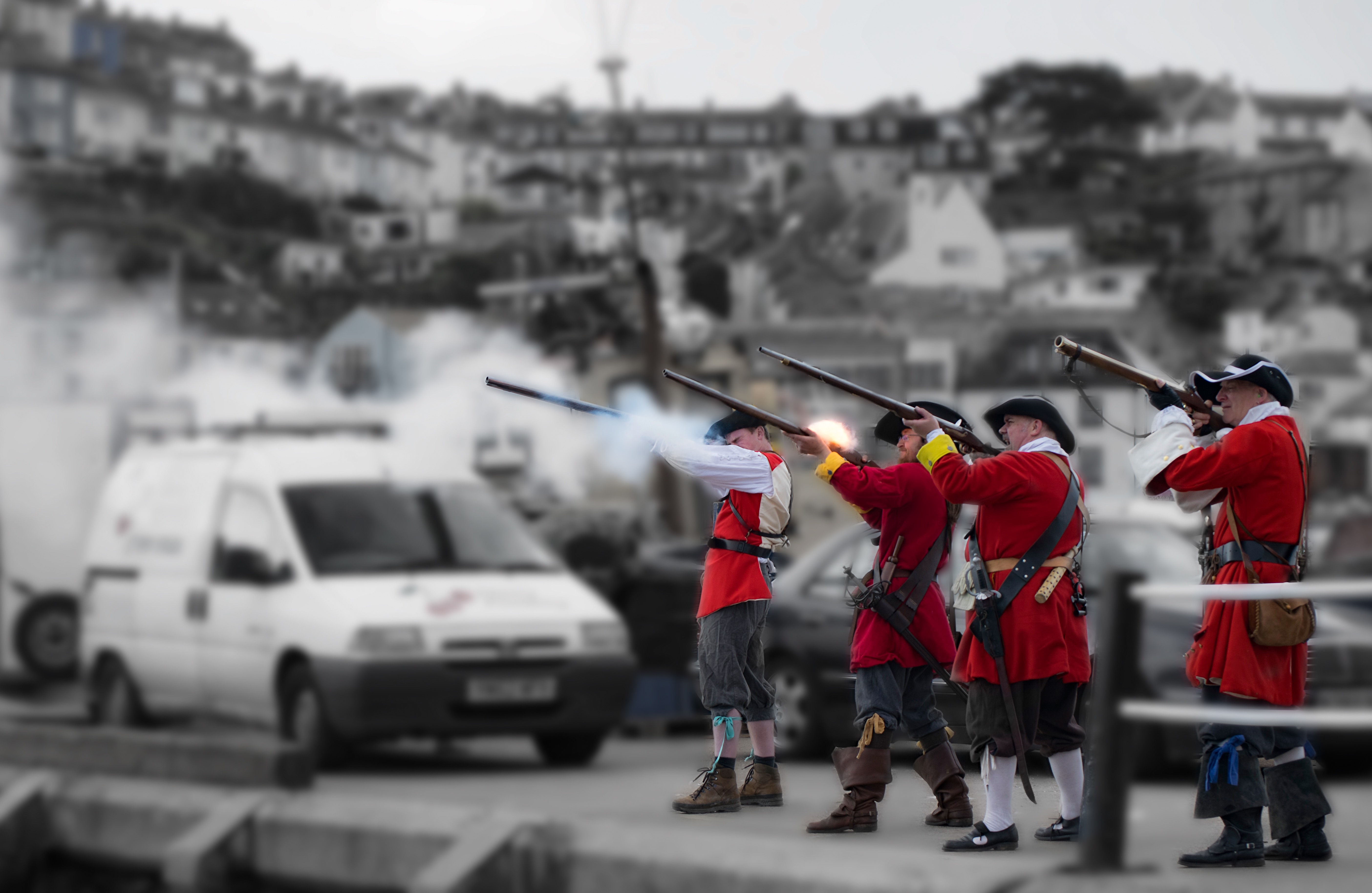 Below is a shot of the muskets just as the muskateer, second from the right shouts fire, the fire coming from the muskateer situated second from the left can be seen.