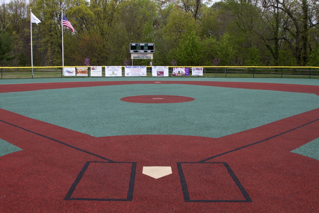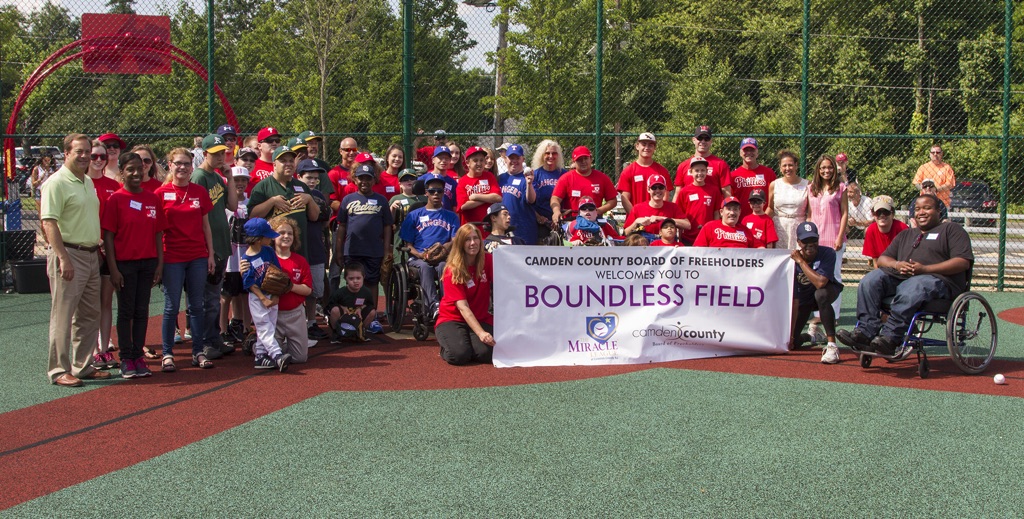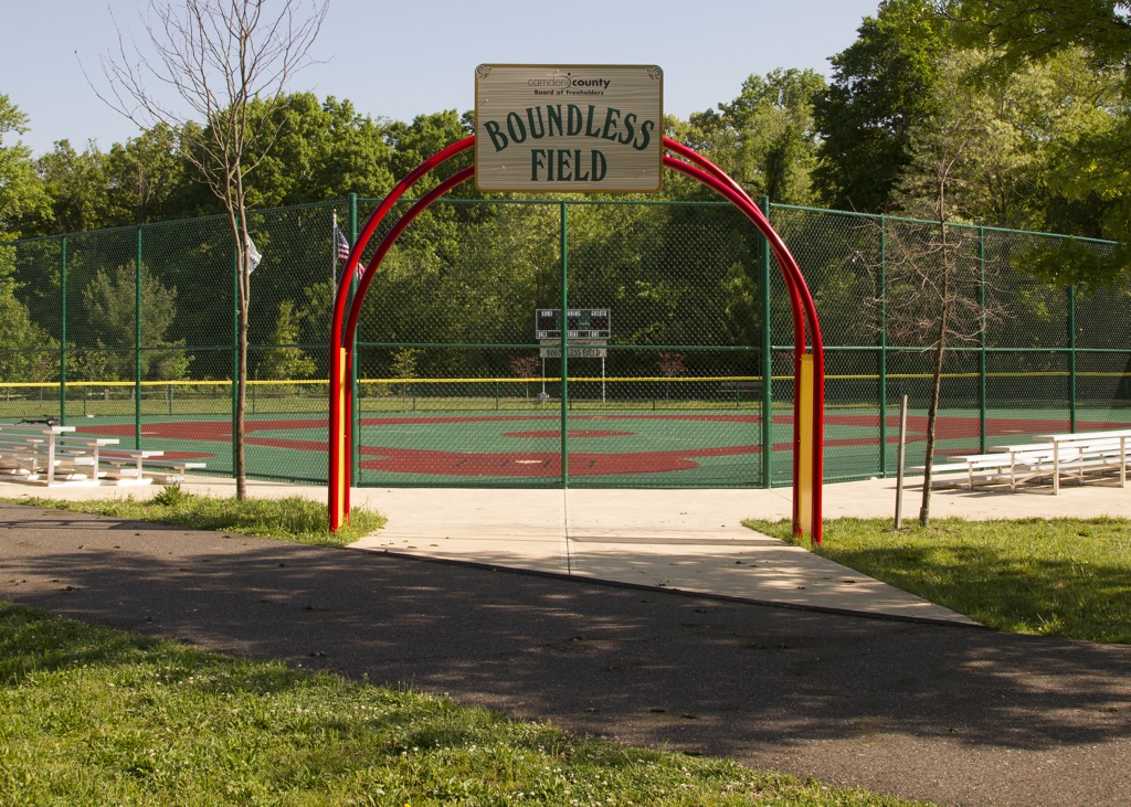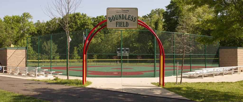 The Camden County Board of Freeholders Boundless Field is a barrier-free, handicapped accessible baseball field with a cushioned, synthetic surface that accommodates wheelchairs and walking assistance devices, while helping to prevent injuries. The Boundless Field enables children and adults with physical or mental challenges the opportunity to play baseball by providing a level playing field where they can hit, run, and catch