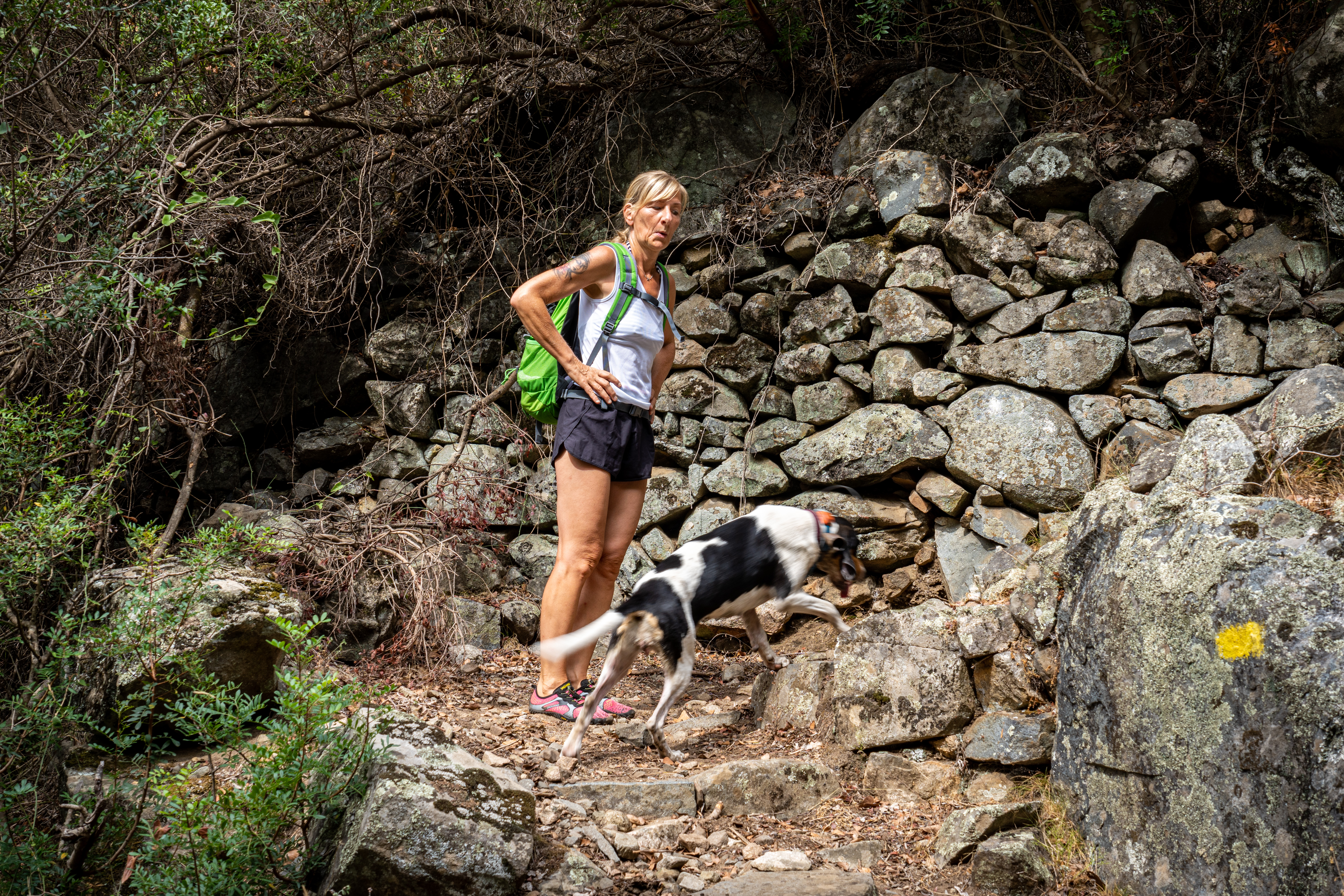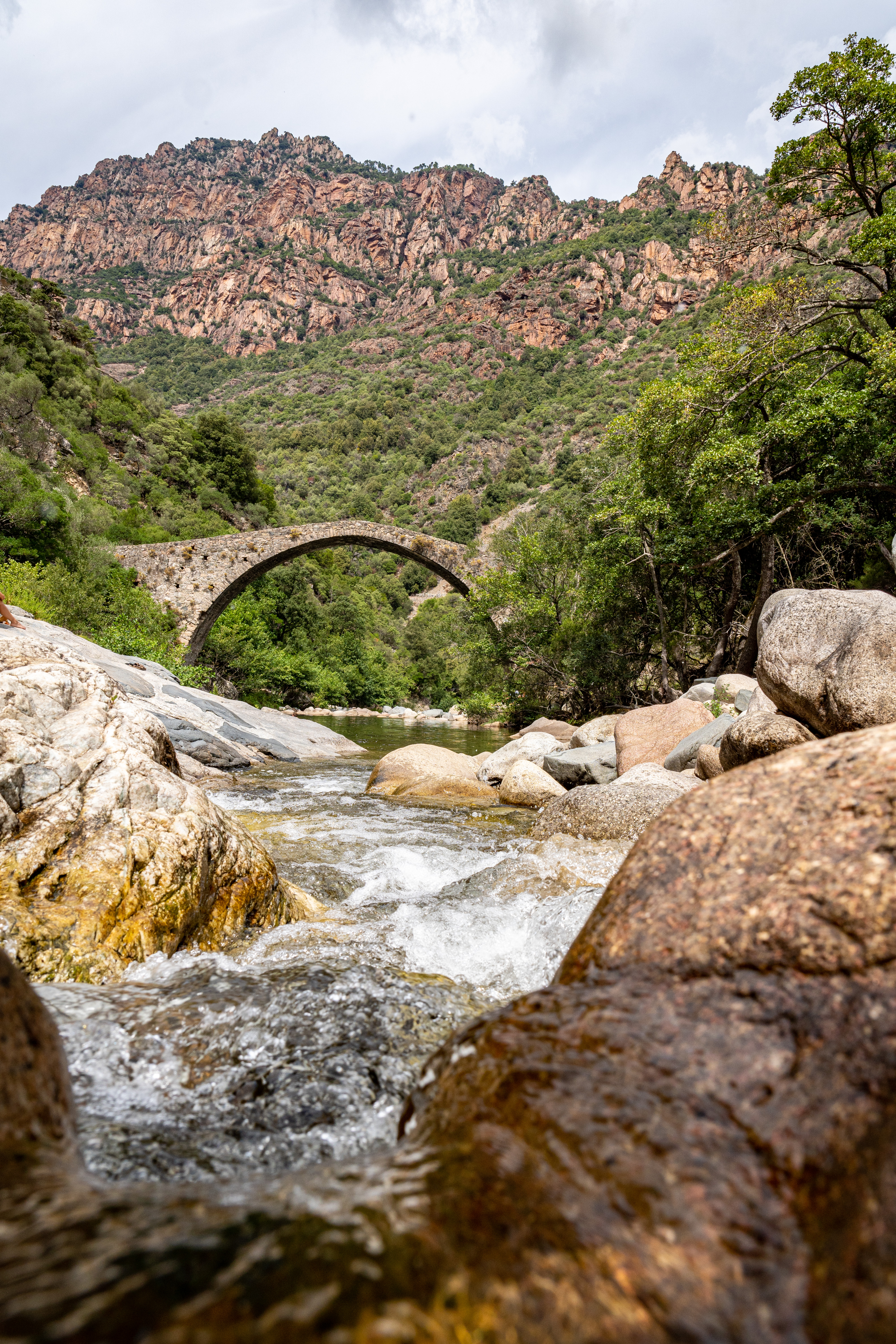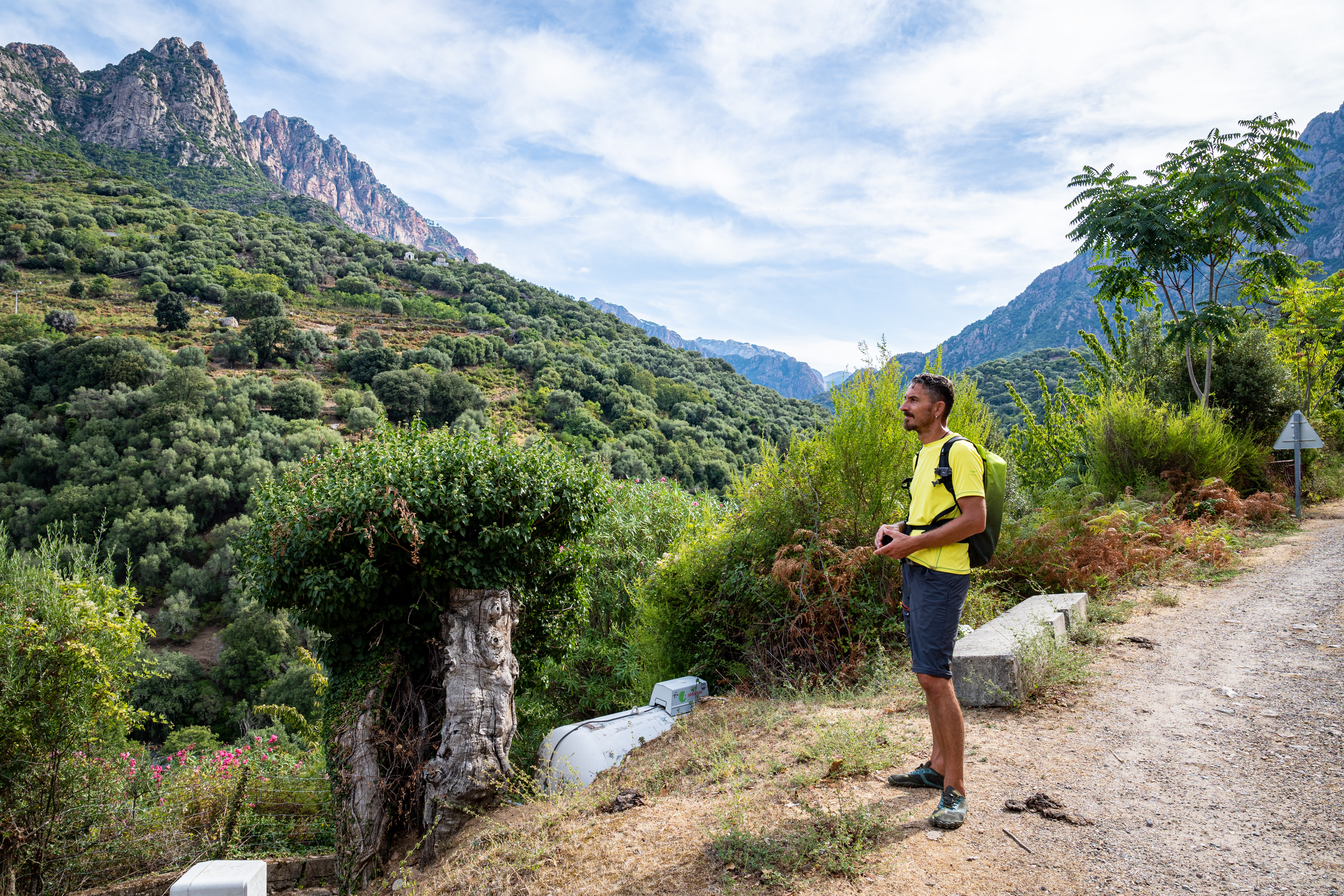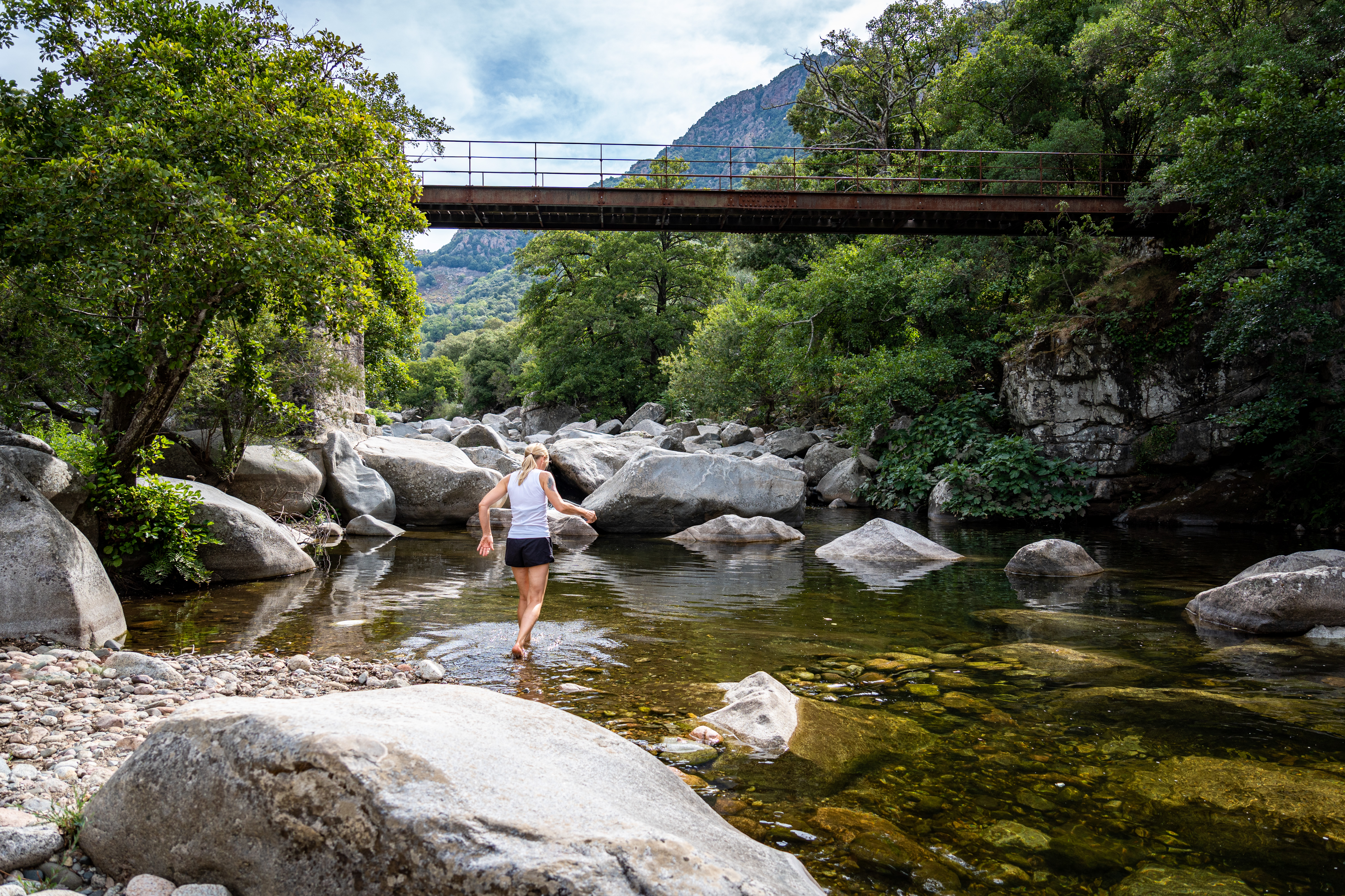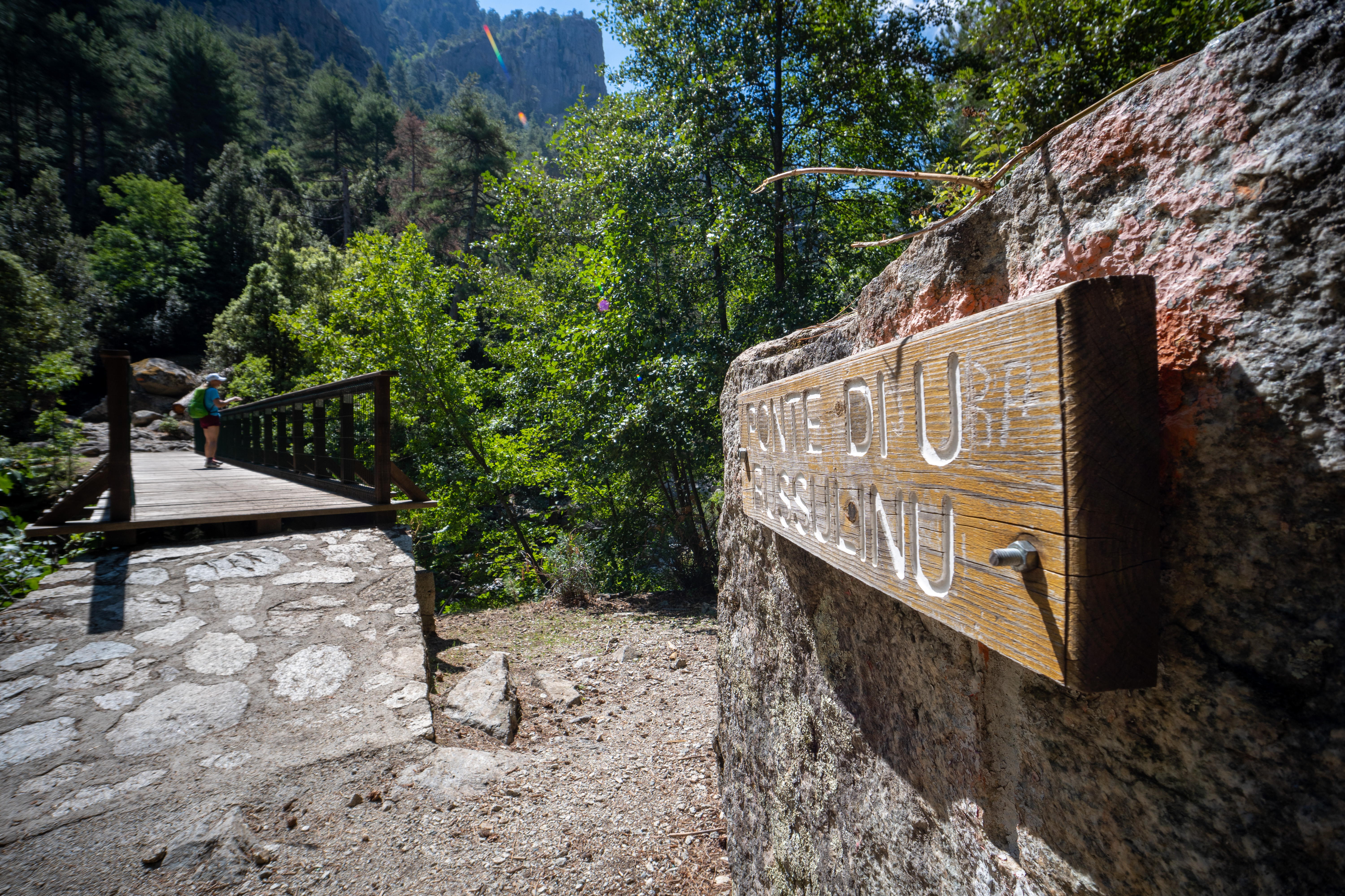 Wir haben heute wieder Wandertag. Also frühstücken wir gemütlich, da unsere Tour laut Komoot nicht allzu anstrengend werden sollte. Der Campingplatz ist in der Nähe einer imposanten Schlucht gelegen, und genau die schauen wir uns heute einmal an. Die Schlucht hat das kleine Flüsschen Rivièra de Porto gestaltet. Der Wanderwegeinstieg liegt direkt neben der Straße - also auf in den corsischen Urwald. Es ist ein schier undurchdringbares Gestrüpp aus diversen Dornenbestückten und uns unbekannten Pflanzen. Überall liegt Kuhdung, aha die scheint es hier im Wald zu geben?! Von Wildschweinen haben wir auch gelesen, aber die treffen wir heute zum Glück leider nicht. Dafür begegnet uns ein merkwürdiger Hund mit Glöckchen und Peilsender? Wir haben Fragen, aber keiner da der uns versteht. Wir erreichen gegen 11:30 den winzigen Ort Ota - für Mittagessen ist es noch zu früh. Also weiter zum Ziel unserer Wanderung, eine alte Rundbogenbrücke über den Riviera de Porta.