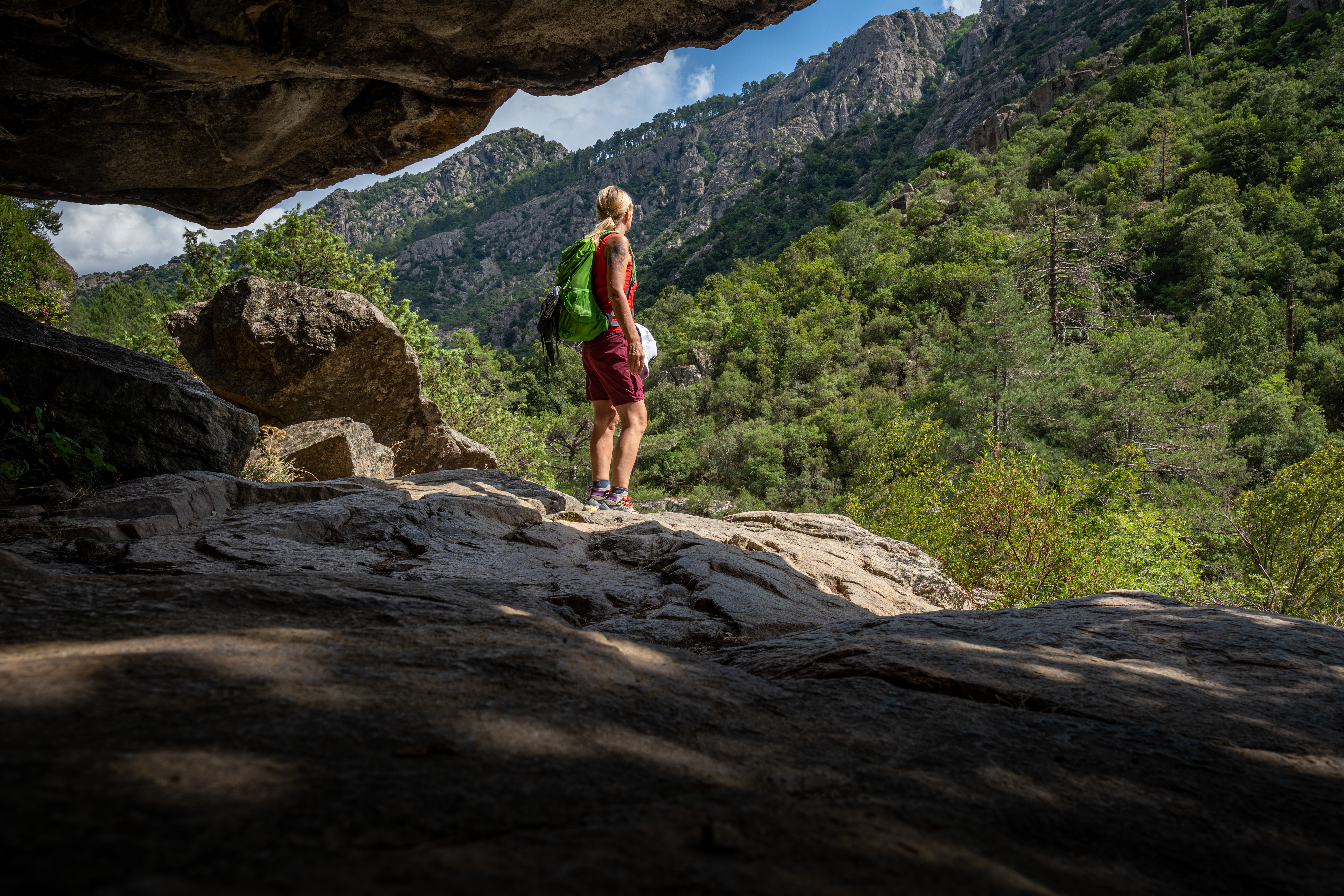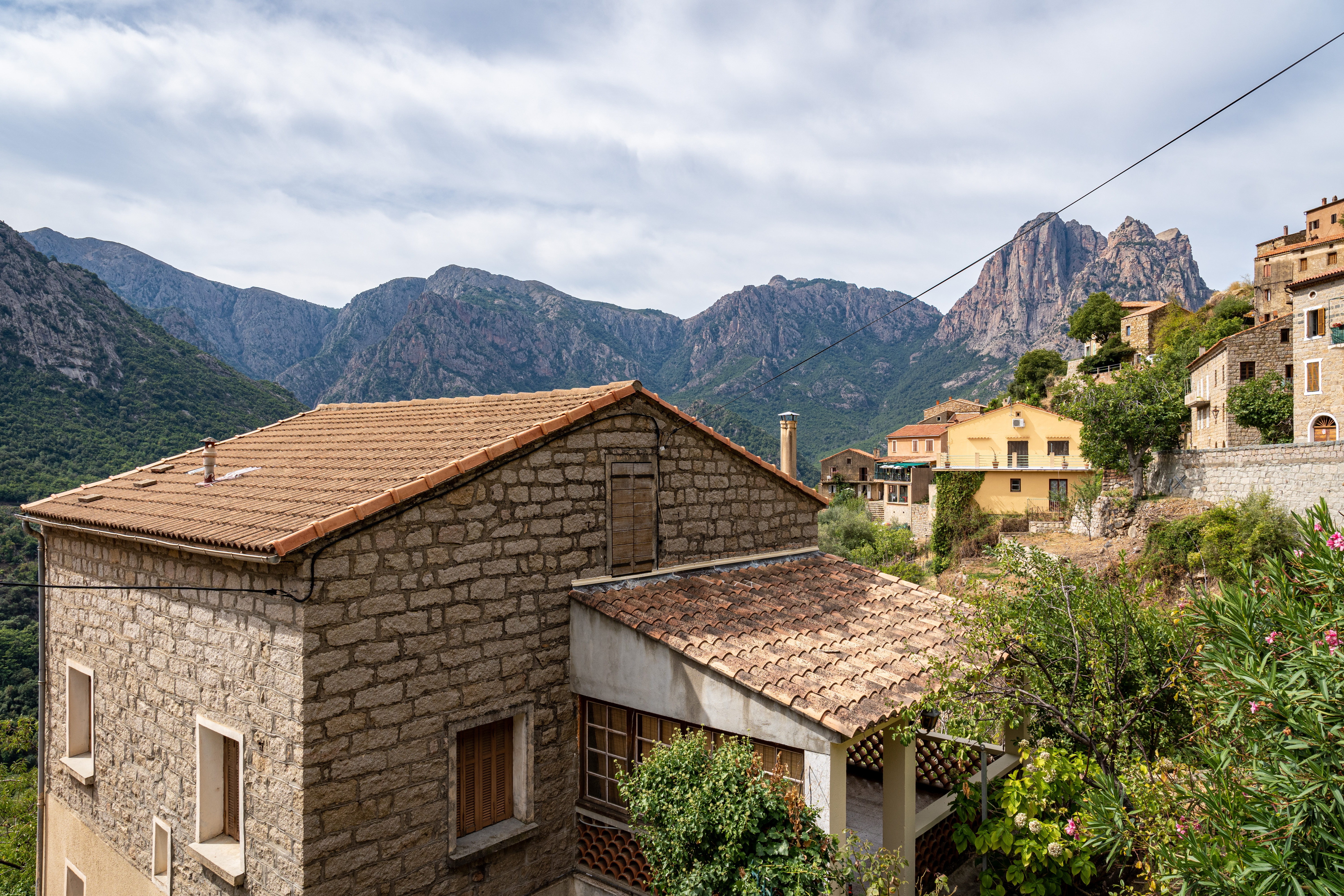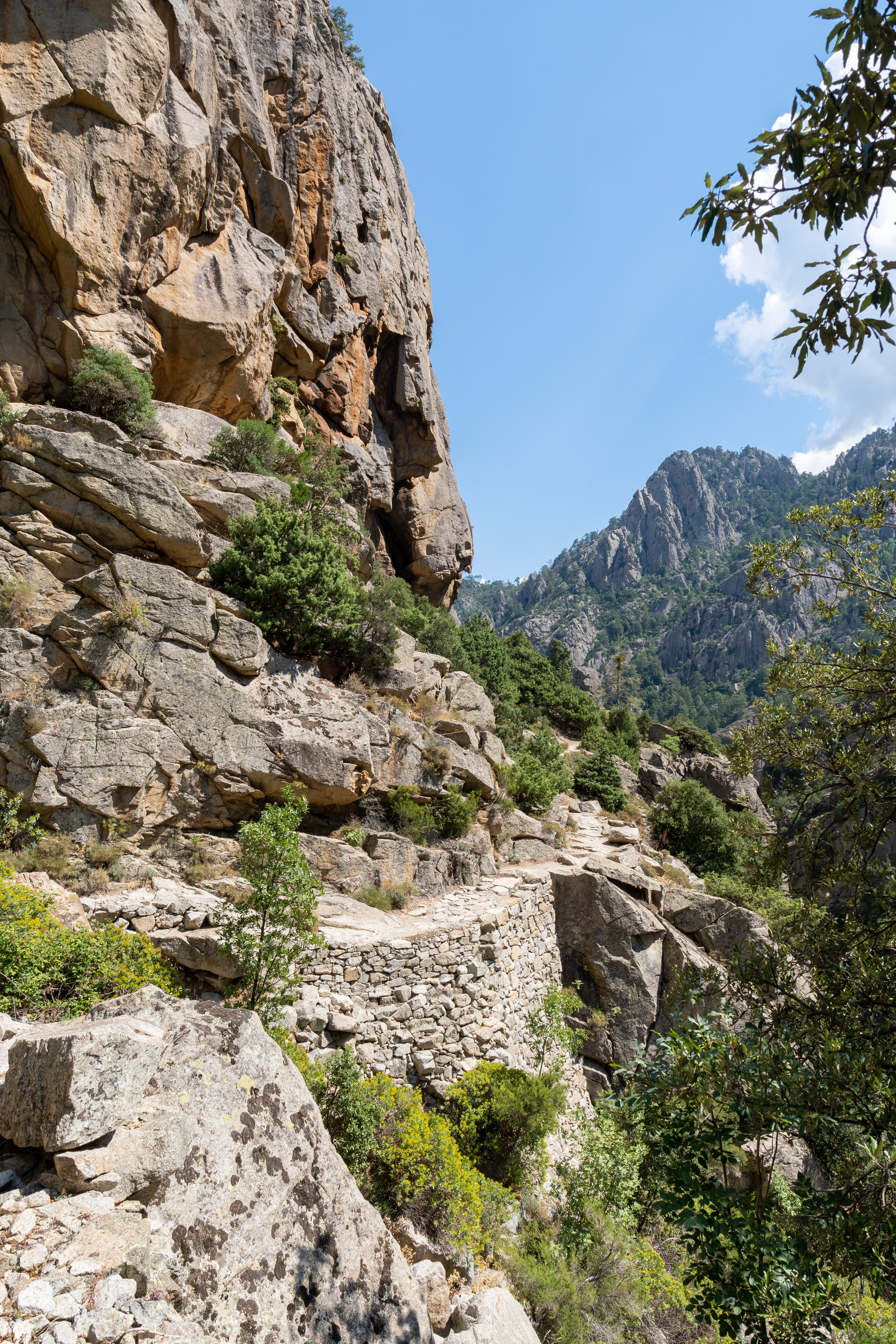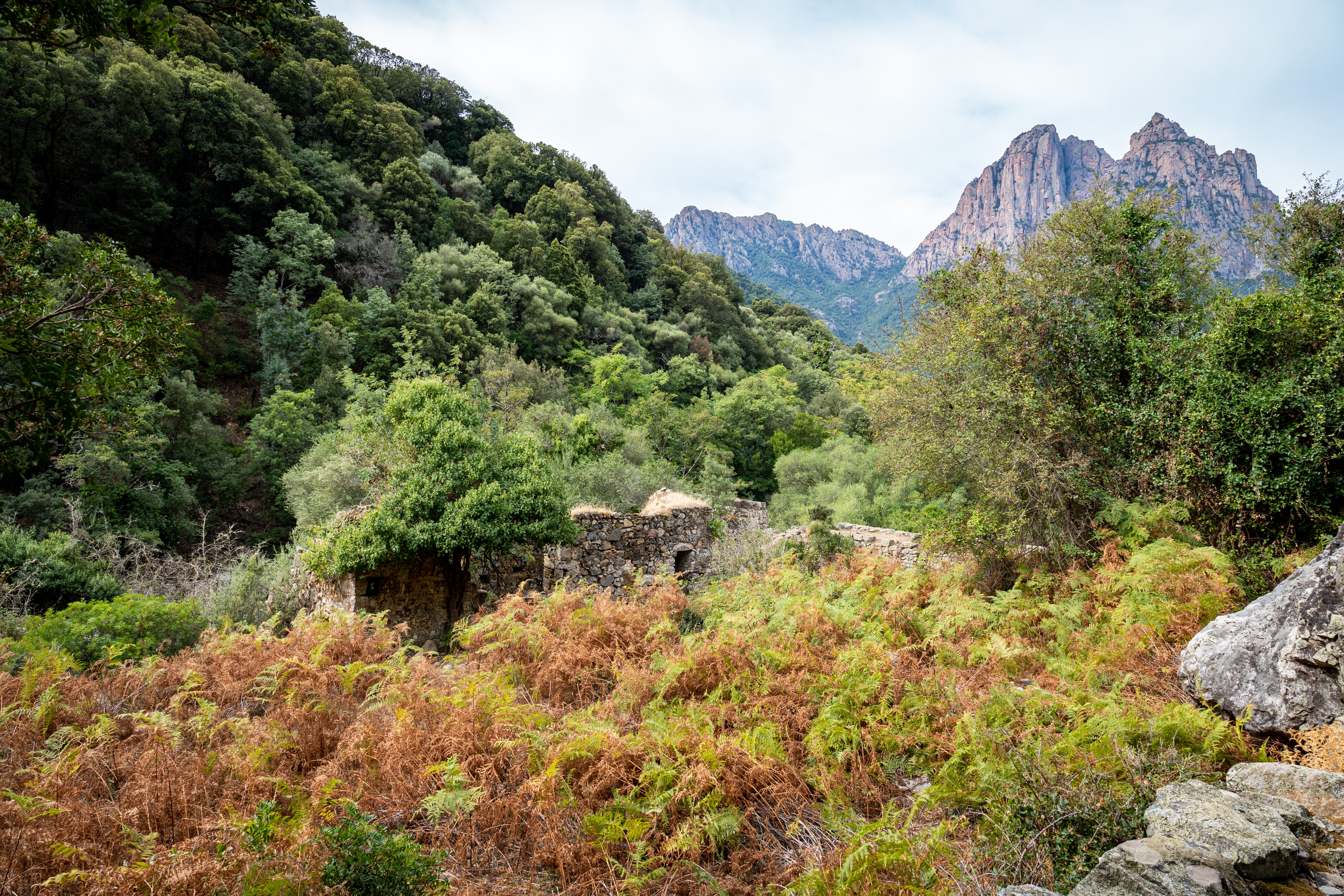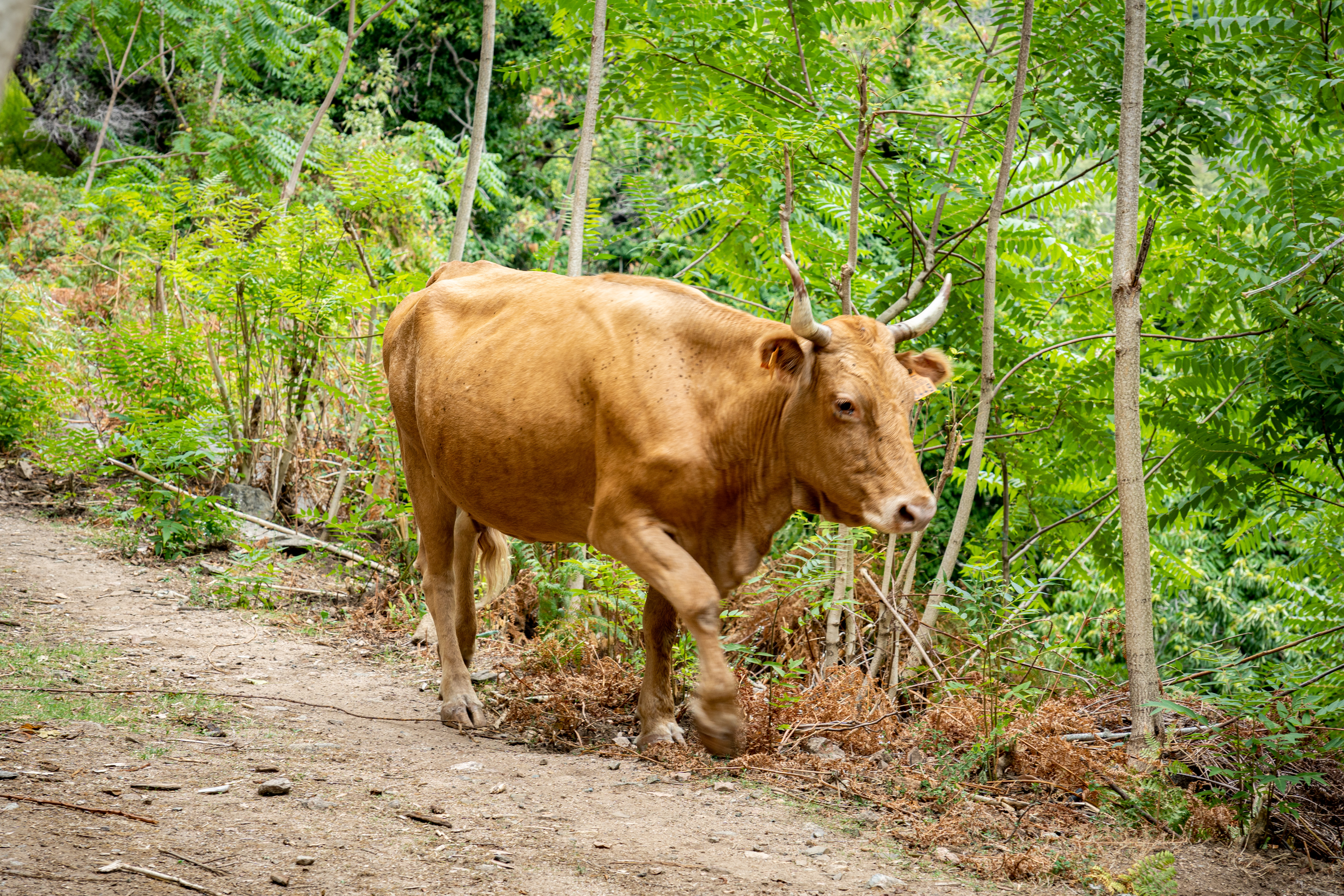 Wir haben heute wieder Wandertag. Also frühstücken wir gemütlich, da unsere Tour laut Komoot nicht allzu anstrengend werden sollte. Der Campingplatz ist in der Nähe einer imposanten Schlucht gelegen, und genau die schauen wir uns heute einmal an. Die Schlucht hat das kleine Flüsschen Rivièra de Porto gestaltet. Der Wanderwegeinstieg liegt direkt neben der Straße - also auf in den corsischen Urwald. Es ist ein schier undurchdringbares Gestrüpp aus diversen Dornenbestückten und uns unbekannten Pflanzen. Überall liegt Kuhdung, aha die scheint es hier im Wald zu geben?! Von Wildschweinen haben wir auch gelesen, aber die treffen wir heute zum Glück leider nicht. Dafür begegnet uns ein merkwürdiger Hund mit Glöckchen und Peilsender? Wir haben Fragen, aber keiner da der uns versteht. Wir erreichen gegen 11:30 den winzigen Ort Ota - für Mittagessen ist es noch zu früh. Also weiter zum Ziel unserer Wanderung, eine alte Rundbogenbrücke über den Riviera de Porta.