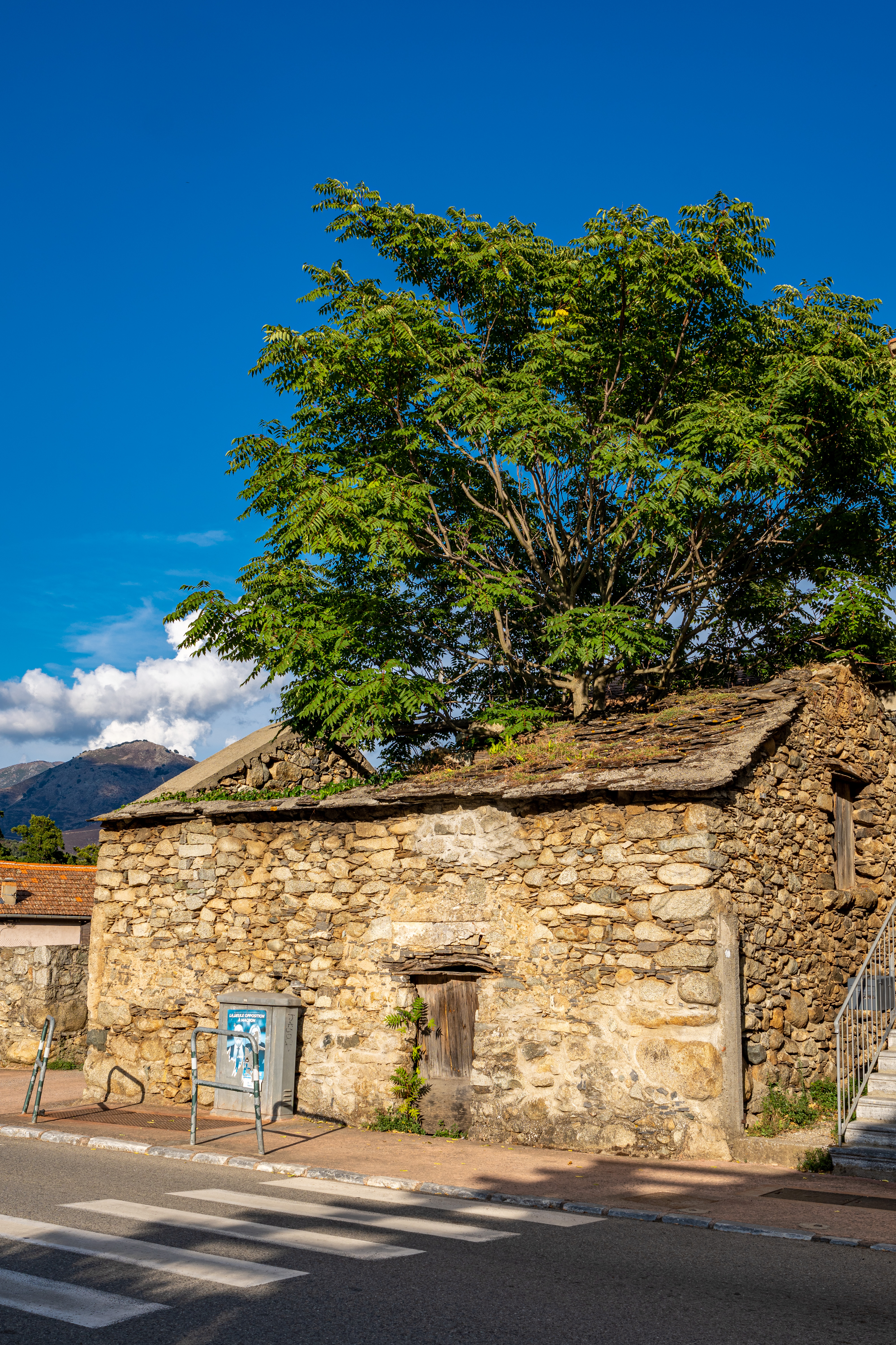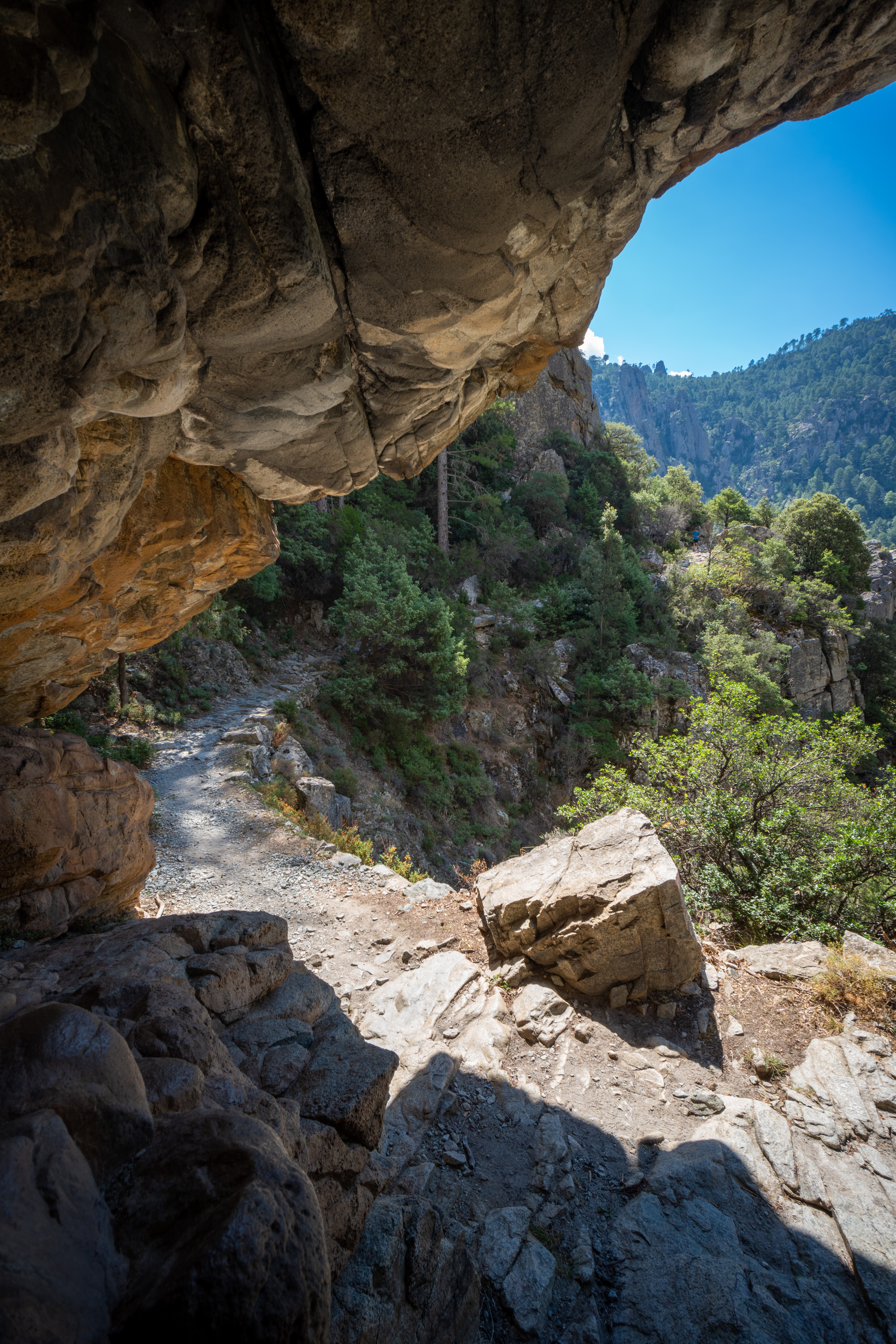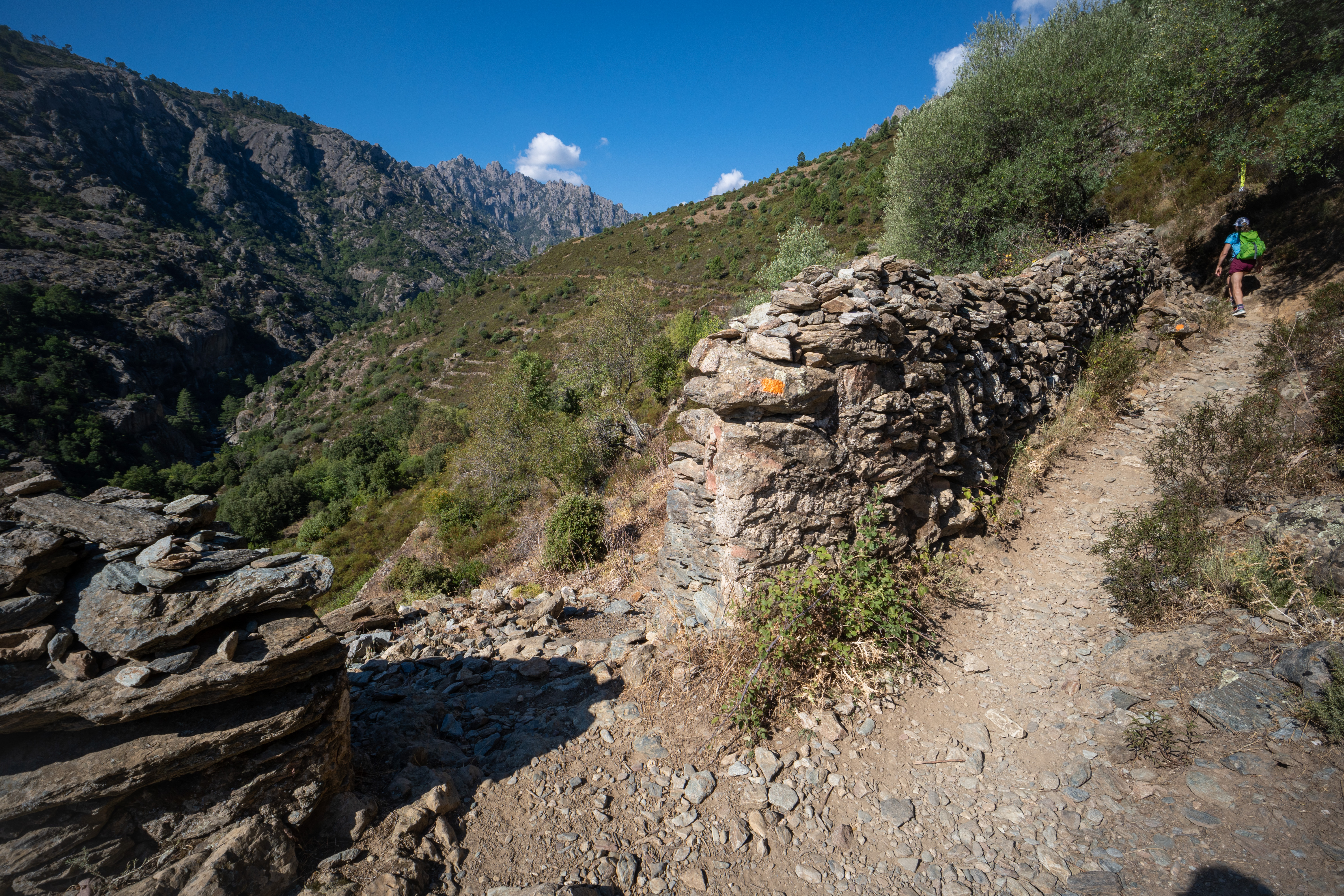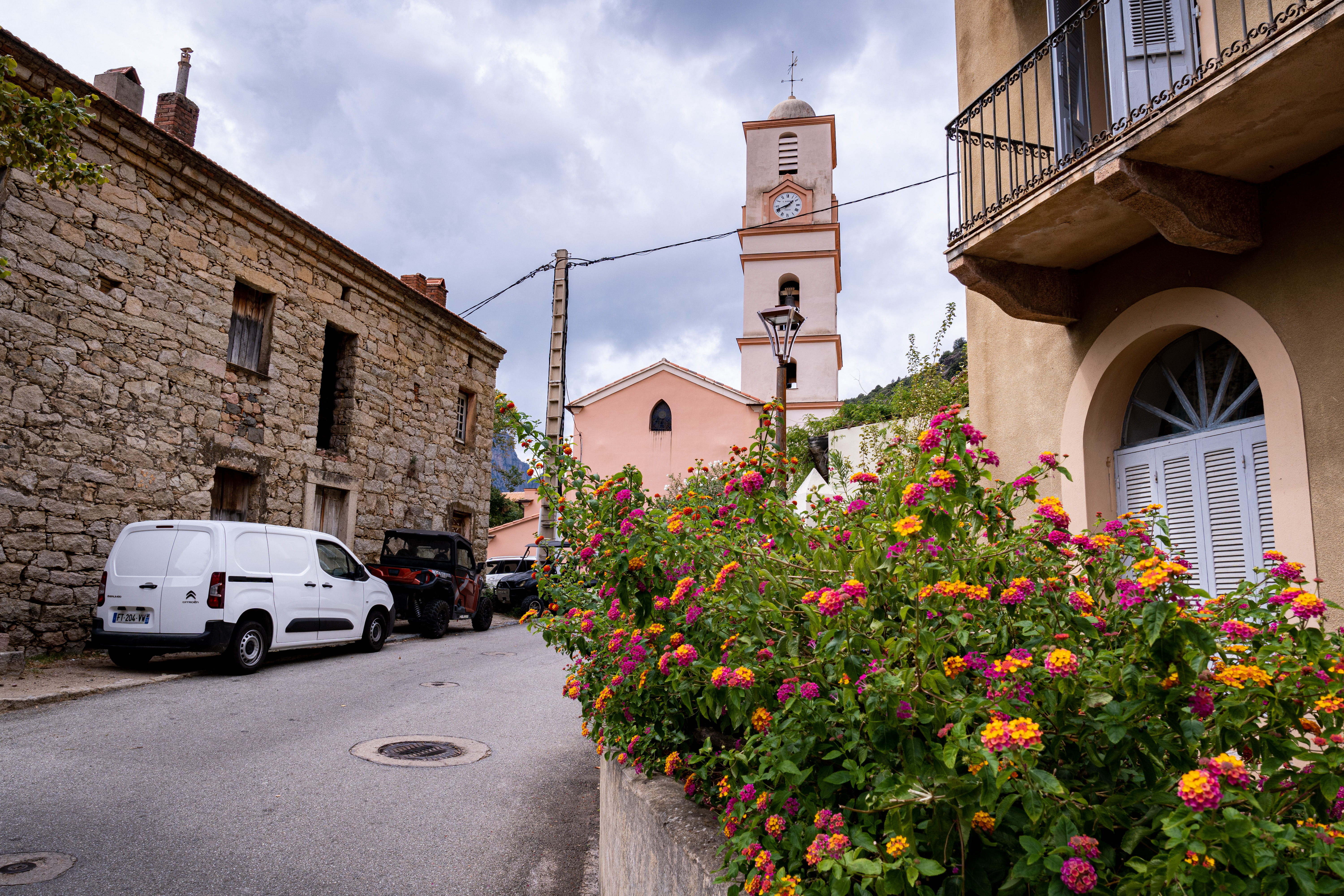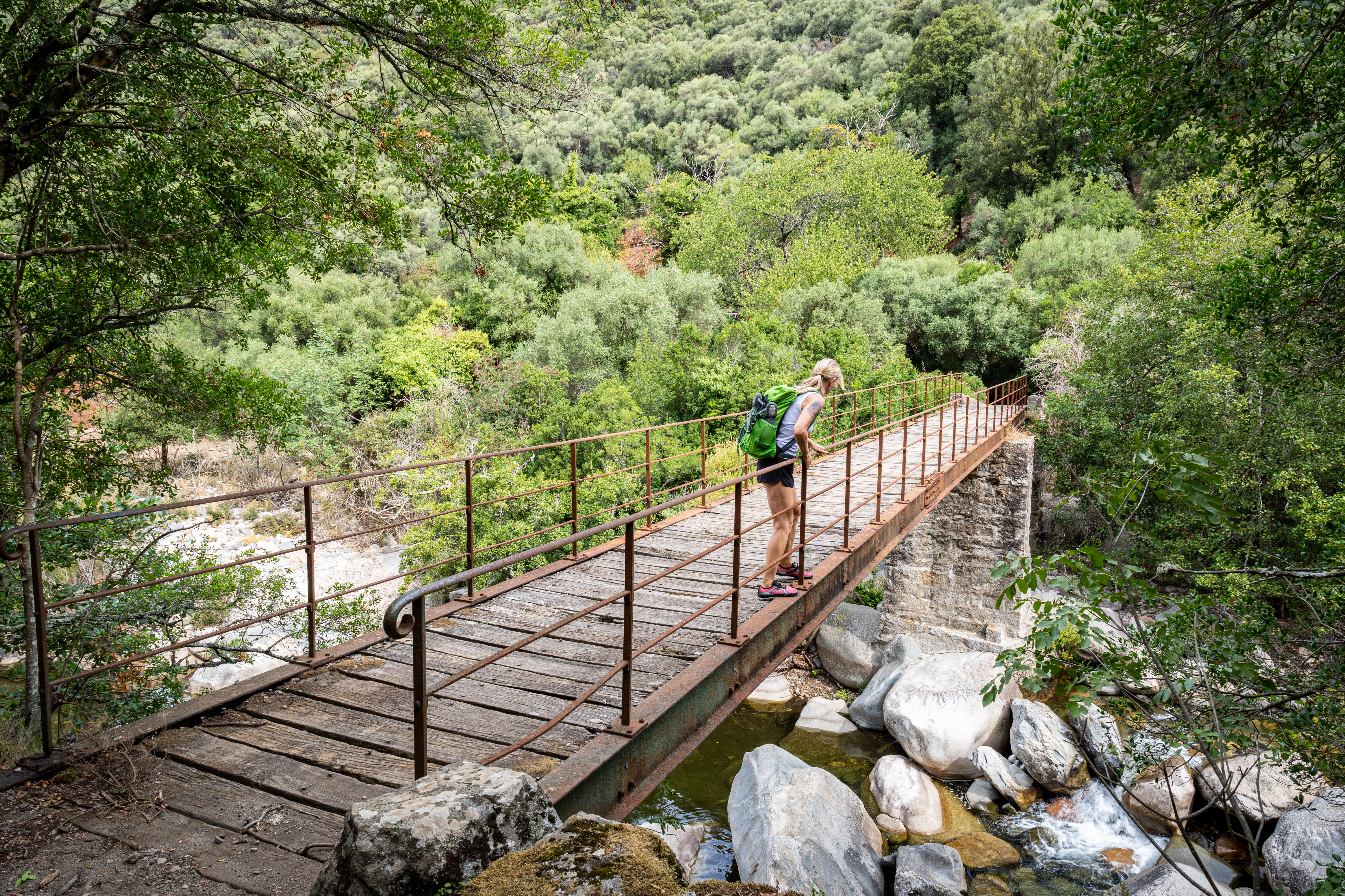 Wir haben heute wieder Wandertag. Also frühstücken wir gemütlich, da unsere Tour laut Komoot nicht allzu anstrengend werden sollte. Der Campingplatz ist in der Nähe einer imposanten Schlucht gelegen, und genau die schauen wir uns heute einmal an. Die Schlucht hat das kleine Flüsschen Rivièra de Porto gestaltet. Der Wanderwegeinstieg liegt direkt neben der Straße - also auf in den corsischen Urwald. Es ist ein schier undurchdringbares Gestrüpp aus diversen Dornenbestückten und uns unbekannten Pflanzen. Überall liegt Kuhdung, aha die scheint es hier im Wald zu geben?! Von Wildschweinen haben wir auch gelesen, aber die treffen wir heute zum Glück leider nicht. Dafür begegnet uns ein merkwürdiger Hund mit Glöckchen und Peilsender? Wir haben Fragen, aber keiner da der uns versteht. Wir erreichen gegen 11:30 den winzigen Ort Ota - für Mittagessen ist es noch zu früh. Also weiter zum Ziel unserer Wanderung, eine alte Rundbogenbrücke über den Riviera de Porta.