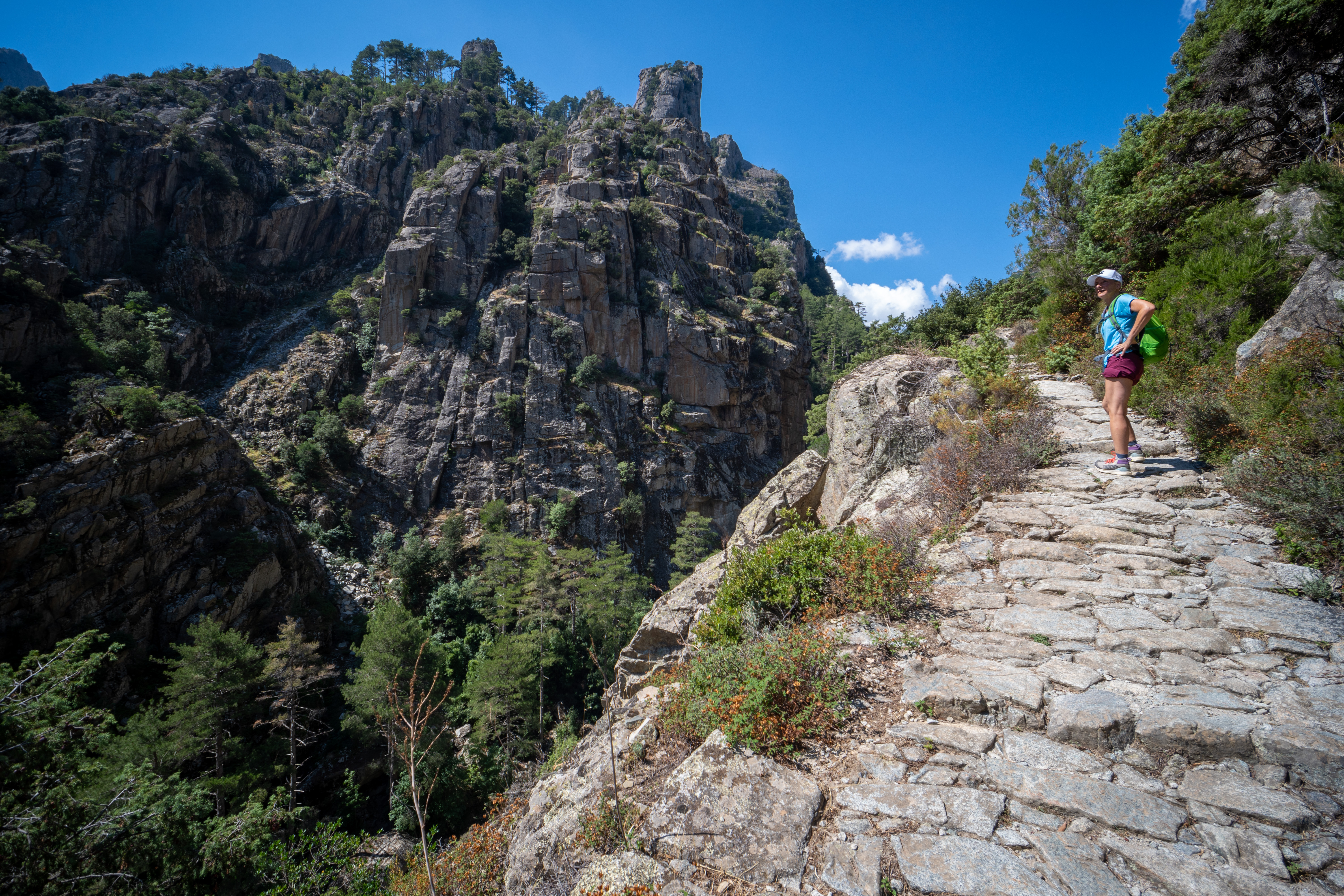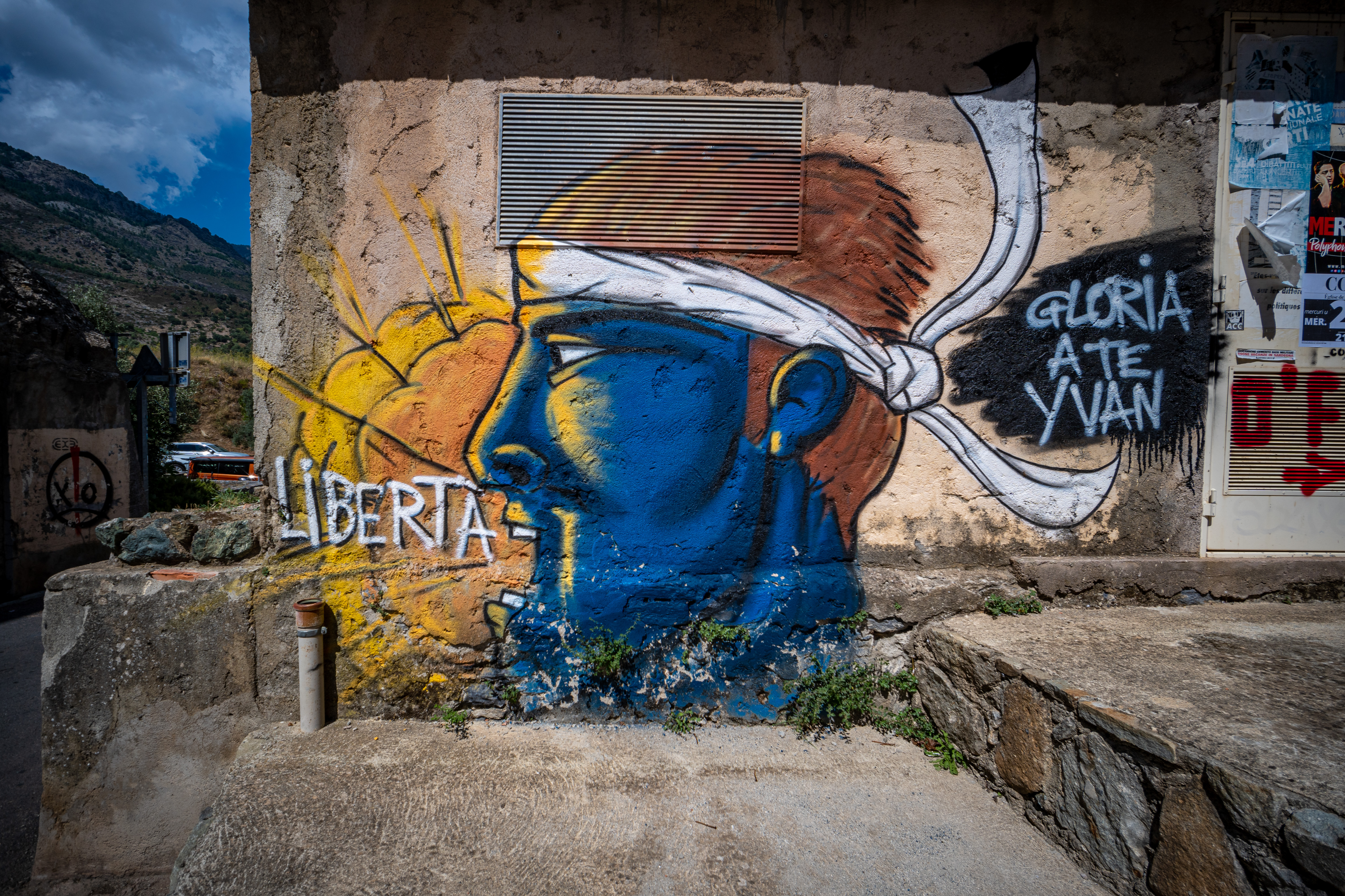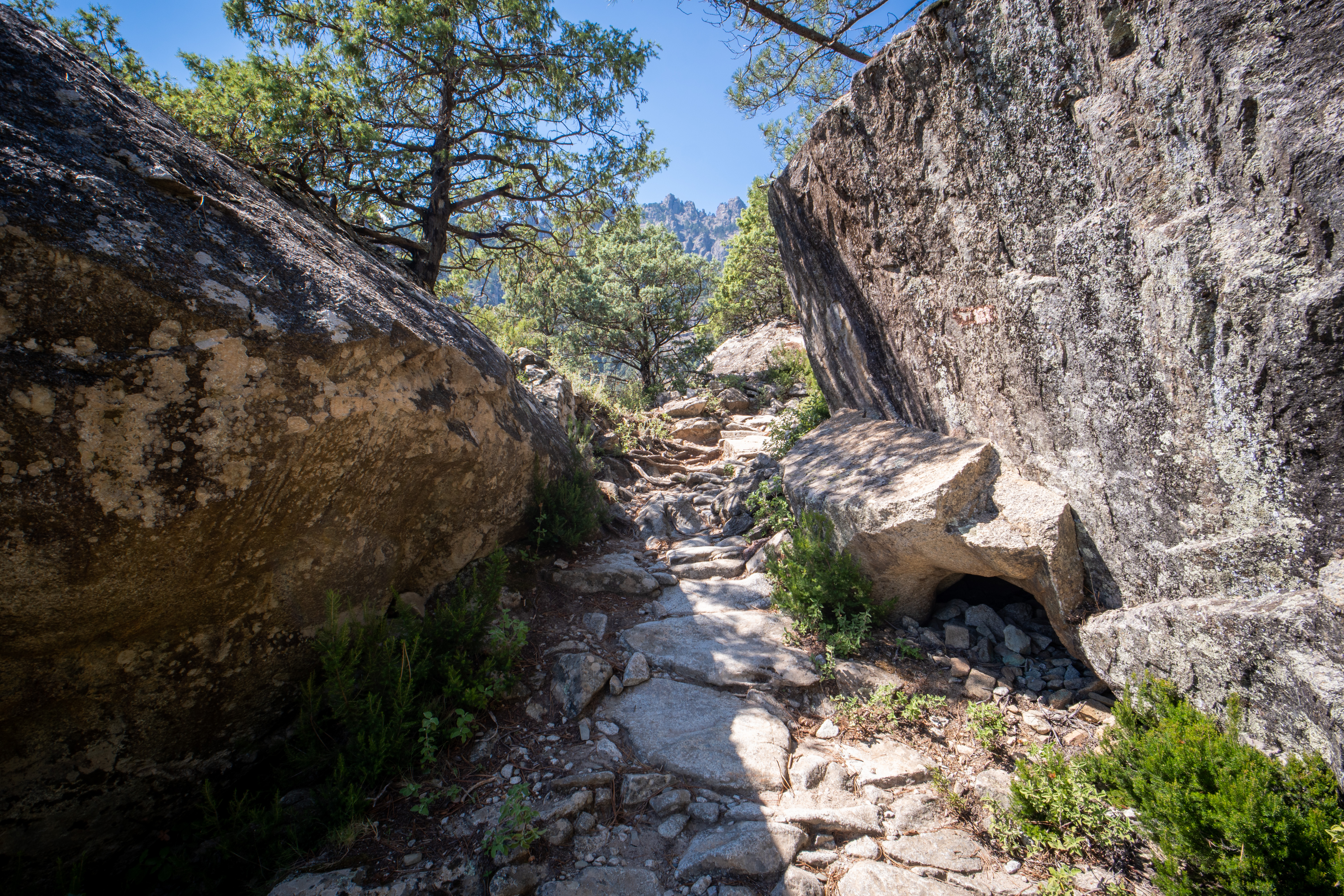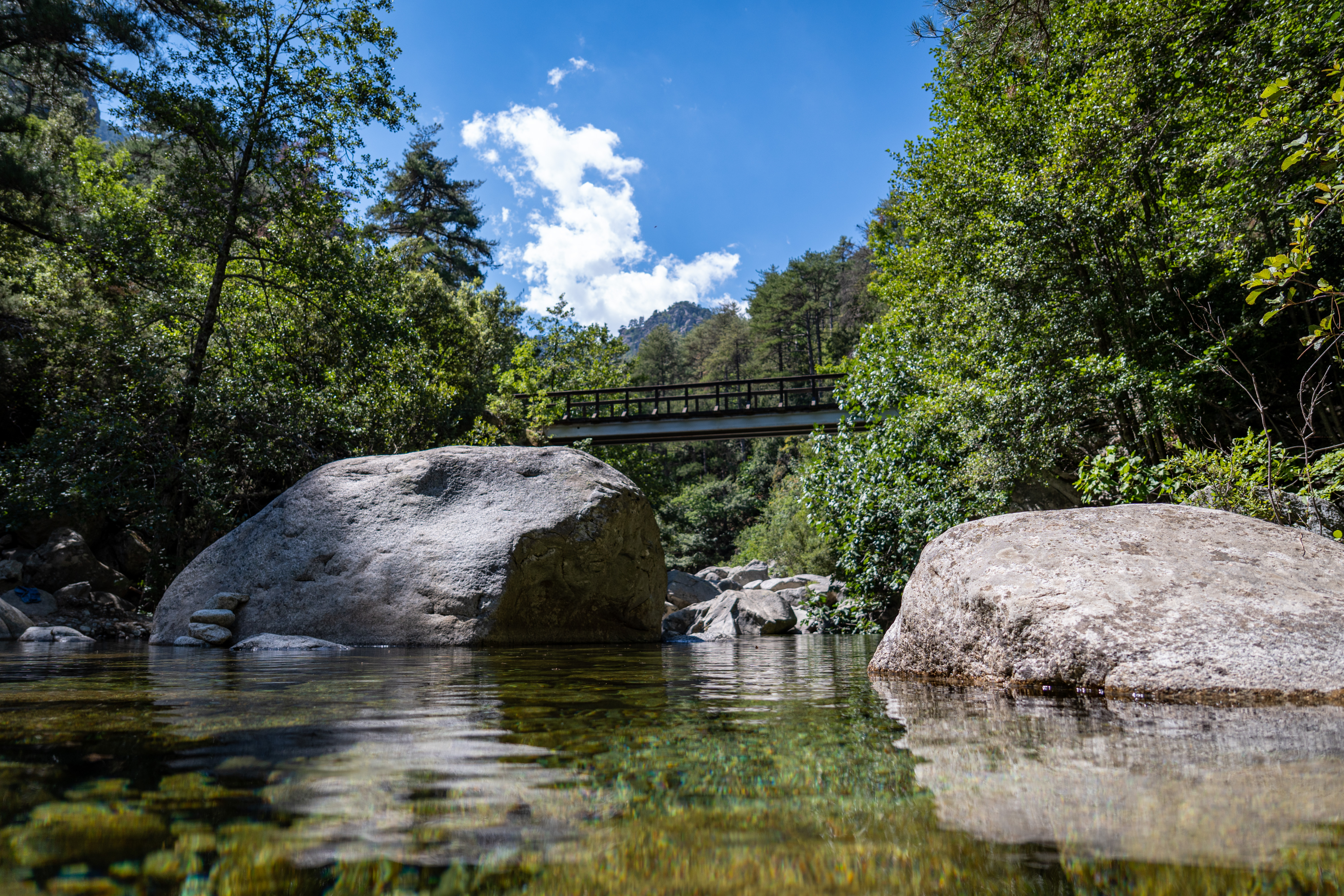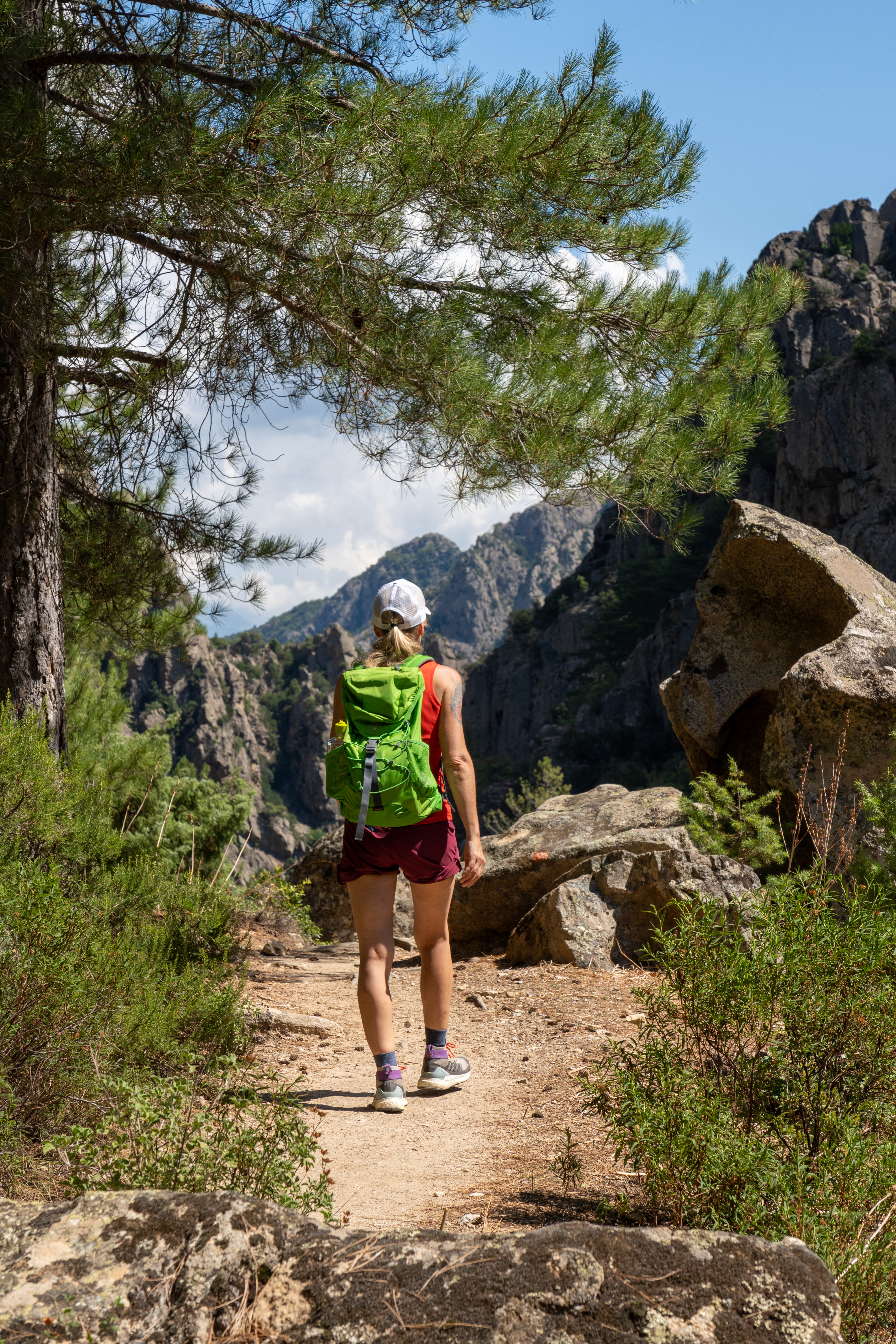 Wir haben heute wieder Wandertag. Also frühstücken wir gemütlich, da unsere Tour laut Komoot nicht allzu anstrengend werden sollte. Der Campingplatz ist in der Nähe einer imposanten Schlucht gelegen, und genau die schauen wir uns heute einmal an. Die Schlucht hat das kleine Flüsschen Rivièra de Porto gestaltet. Der Wanderwegeinstieg liegt direkt neben der Straße - also auf in den corsischen Urwald. Es ist ein schier undurchdringbares Gestrüpp aus diversen Dornenbestückten und uns unbekannten Pflanzen. Überall liegt Kuhdung, aha die scheint es hier im Wald zu geben?! Von Wildschweinen haben wir auch gelesen, aber die treffen wir heute zum Glück leider nicht. Dafür begegnet uns ein merkwürdiger Hund mit Glöckchen und Peilsender? Wir haben Fragen, aber keiner da der uns versteht. Wir erreichen gegen 11:30 den winzigen Ort Ota - für Mittagessen ist es noch zu früh. Also weiter zum Ziel unserer Wanderung, eine alte Rundbogenbrücke über den Riviera de Porta.