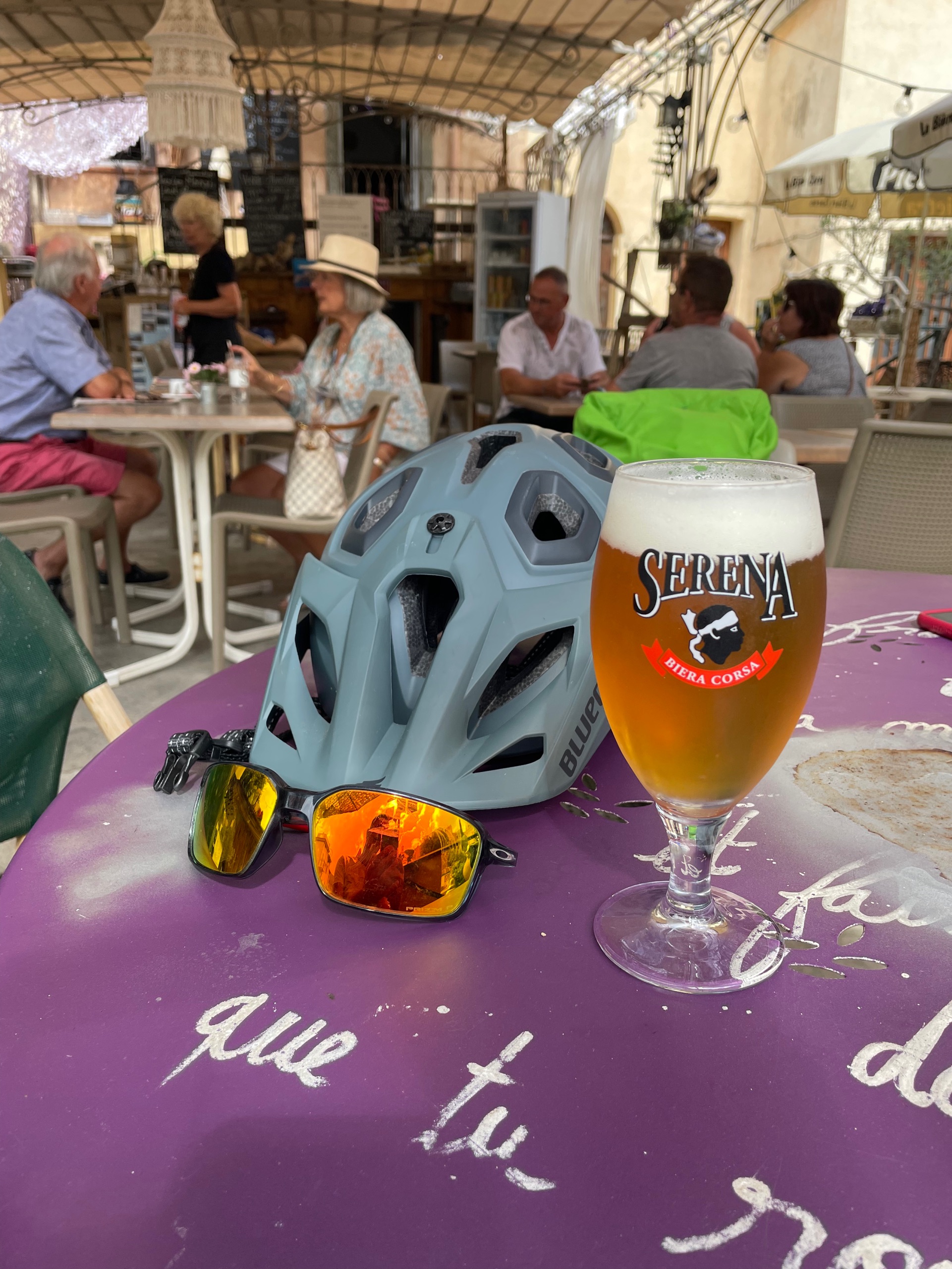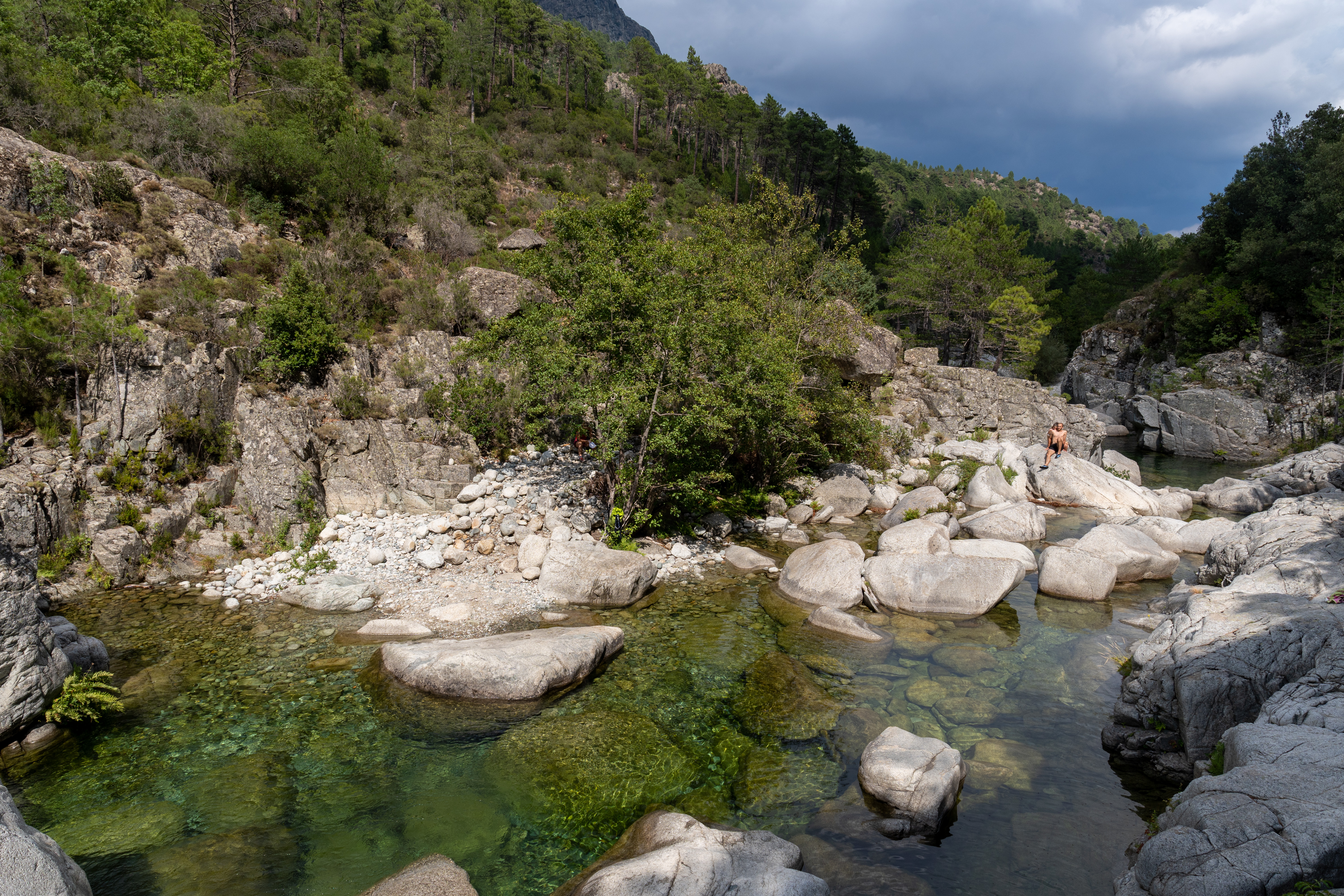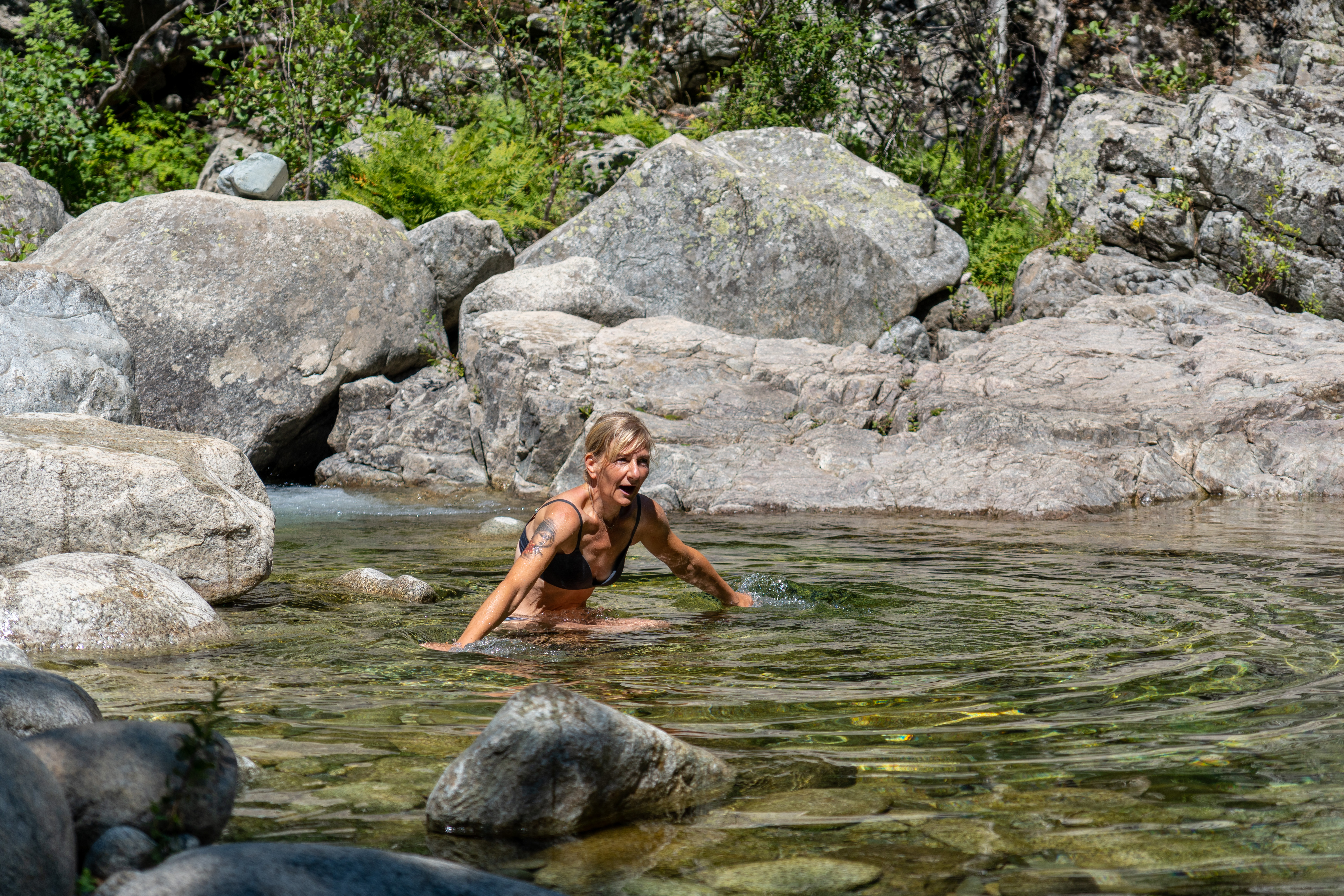Der Wanderweg ist gemütlich und stets bergan, aber nicht all zu extrem. Nach zwei Stunden erreichen wir vollkommen durchgeschwitzt unser Etappenziel. An der Brücke sind herrliche Badegumpen im Fluss, also nix wie in die Schwimmschlüpfer gesprungen und ab in die eiskalten Fluten des Tavignano. Herrlich erfrischt und sehr hungrig fallen wir über unsere Wanderverpflegung her. Nochmal baden und dan geht es zurück. Weiter flussabwärts finden wir noch weitere Gumpen im Fluss die zum Baden einladen - wir können nicht widerstehen. Nach gut 16km Fußmarsch erreichen wir Corte. Es beginnt zu regnen und wir müssen in einem kleinen Café unterschlüpfen. Um den Regenschauer abzuwarten trinken wir einen Apfelsaft und ein kupferfarbenes „Paolina“ (corsischen Bier 0,4l für 7,50€). Den Schauer und den Schreck über die Bierpreise überstanden kaufen wir in Corte noch ein paar Lebensmittel, heute wird „zuhause“ gegessen. Wieder am Campingplatz zischen wir erstmal ein kühles „Kronenbourg“ (franz. Bier) hinter in die durstigen Kehlen - wandern macht durstig.
