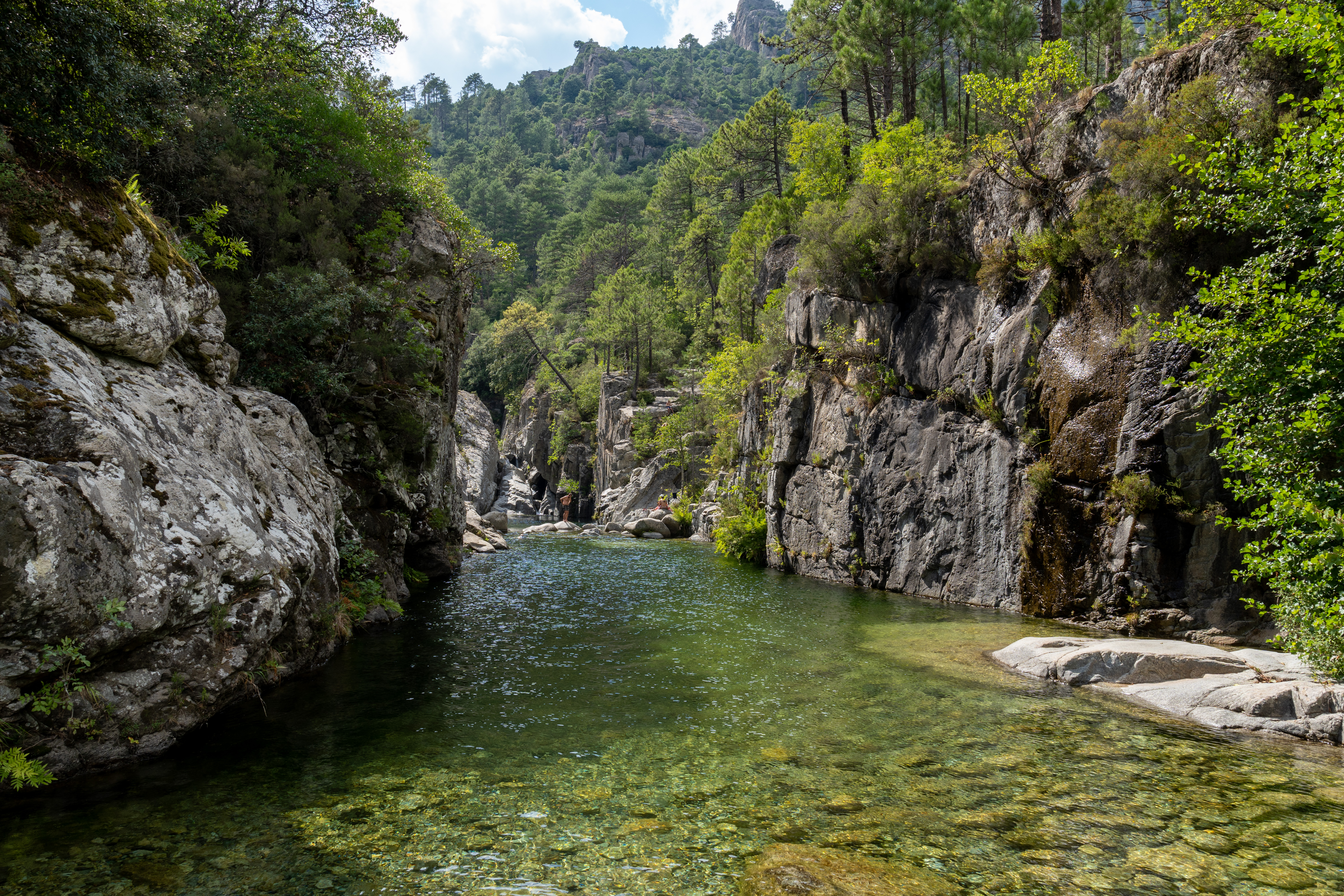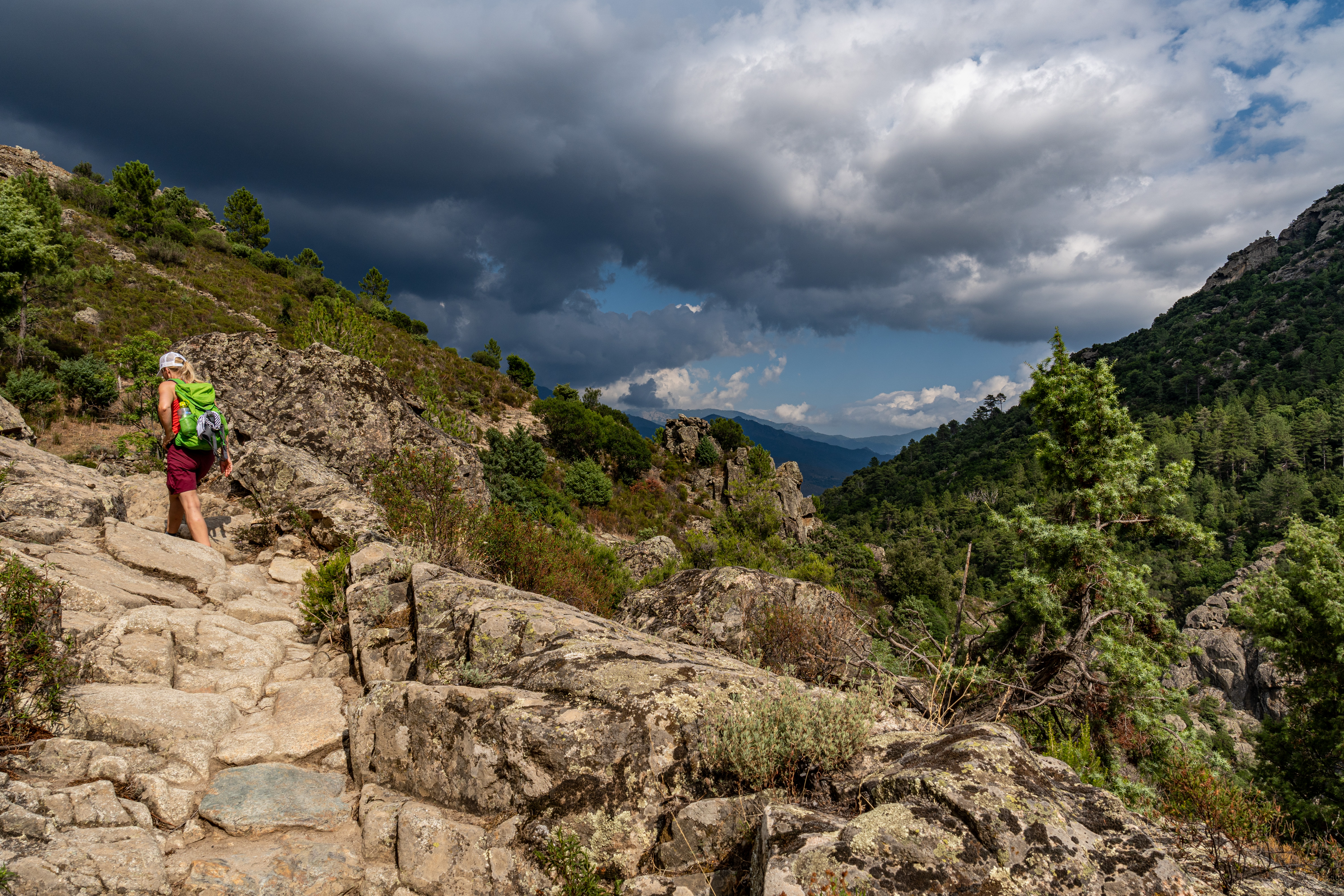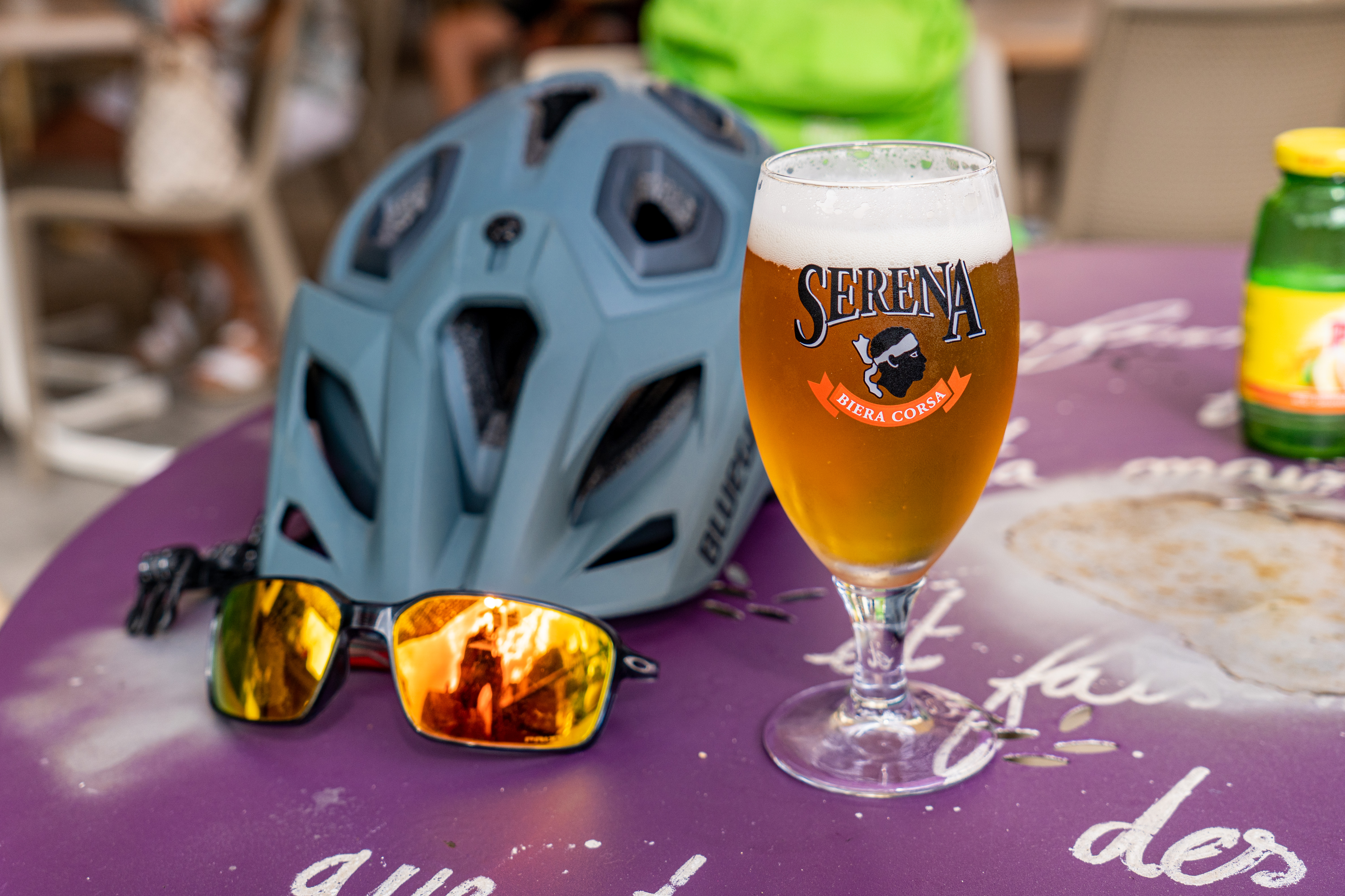 Der Wanderweg ist gemütlich und stets bergan, aber nicht all zu extrem. Nach zwei Stunden erreichen wir vollkommen durchgeschwitzt unser Etappenziel. An der Brücke sind herrliche Badegumpen im Fluss, also nix wie in die Schwimmschlüpfer gesprungen und ab in die eiskalten Fluten des Tavignano. Herrlich erfrischt und sehr hungrig fallen wir über unsere Wanderverpflegung her. Nochmal baden und dan geht es zurück. Weiter flussabwärts finden wir noch weitere Gumpen im Fluss die zum Baden einladen - wir können nicht widerstehen. Nach gut 16km Fußmarsch erreichen wir Corte. Es beginnt zu regnen und wir müssen in einem kleinen Café unterschlüpfen. Um den Regenschauer abzuwarten trinken wir einen Apfelsaft und ein kupferfarbenes „Paolina“ (corsischen Bier 0,4l für 7,50€). Den Schauer und den Schreck über die Bierpreise überstanden kaufen wir in Corte noch ein paar Lebensmittel, heute wird „zuhause“ gegessen. Wieder am Campingplatz zischen wir erstmal ein kühles „Kronenbourg“ (franz. Bier) hinter in die durstigen Kehlen - wandern macht durstig.