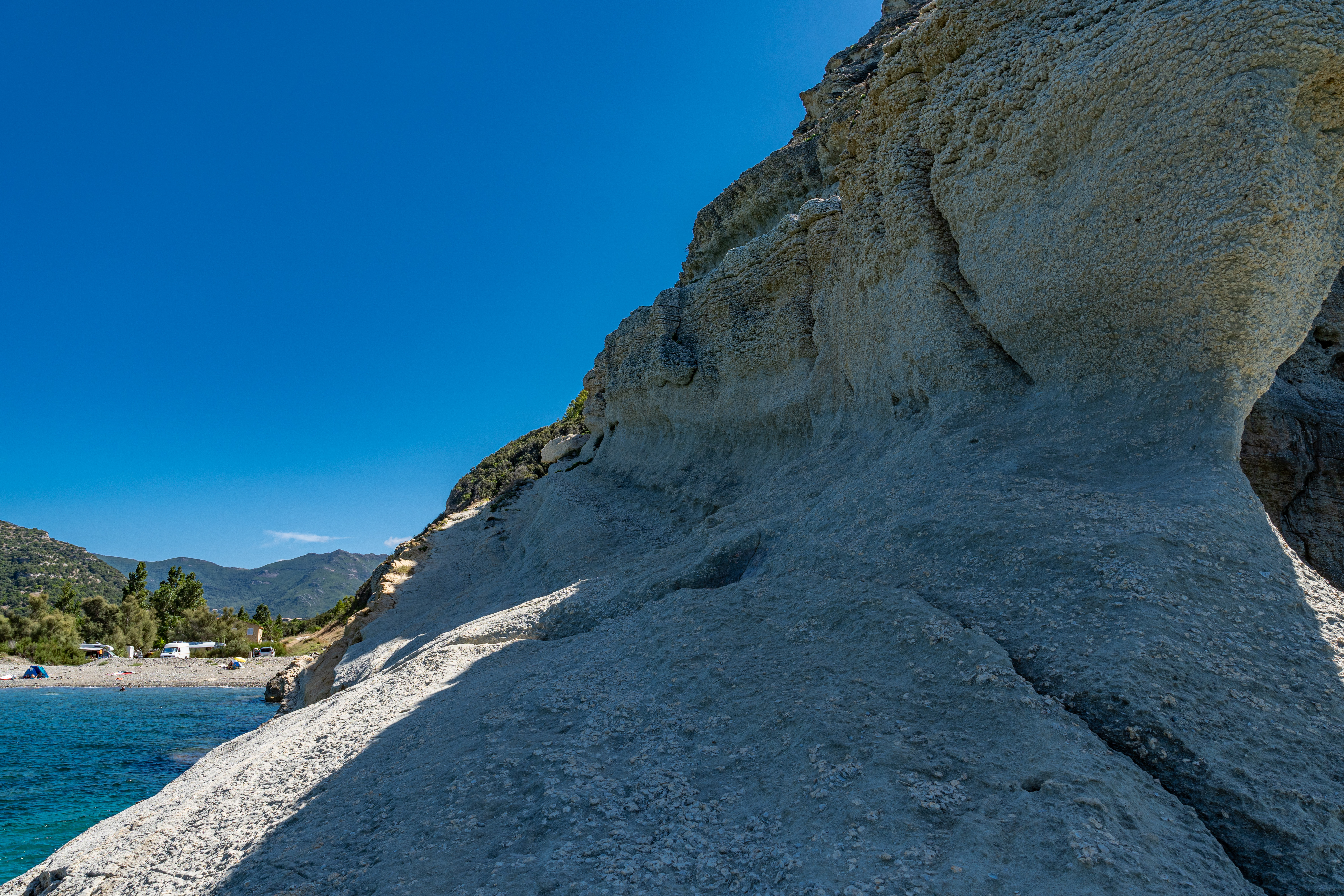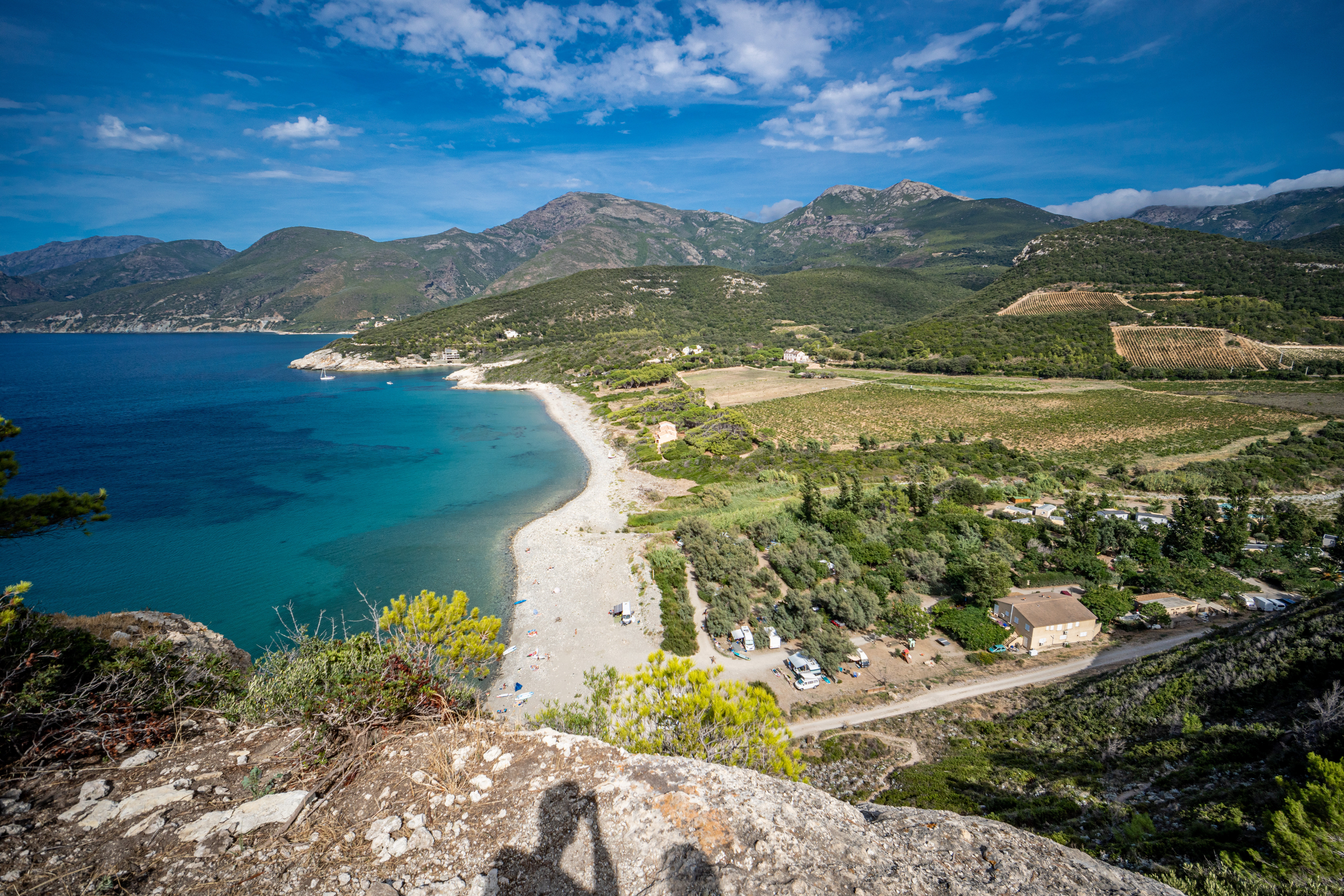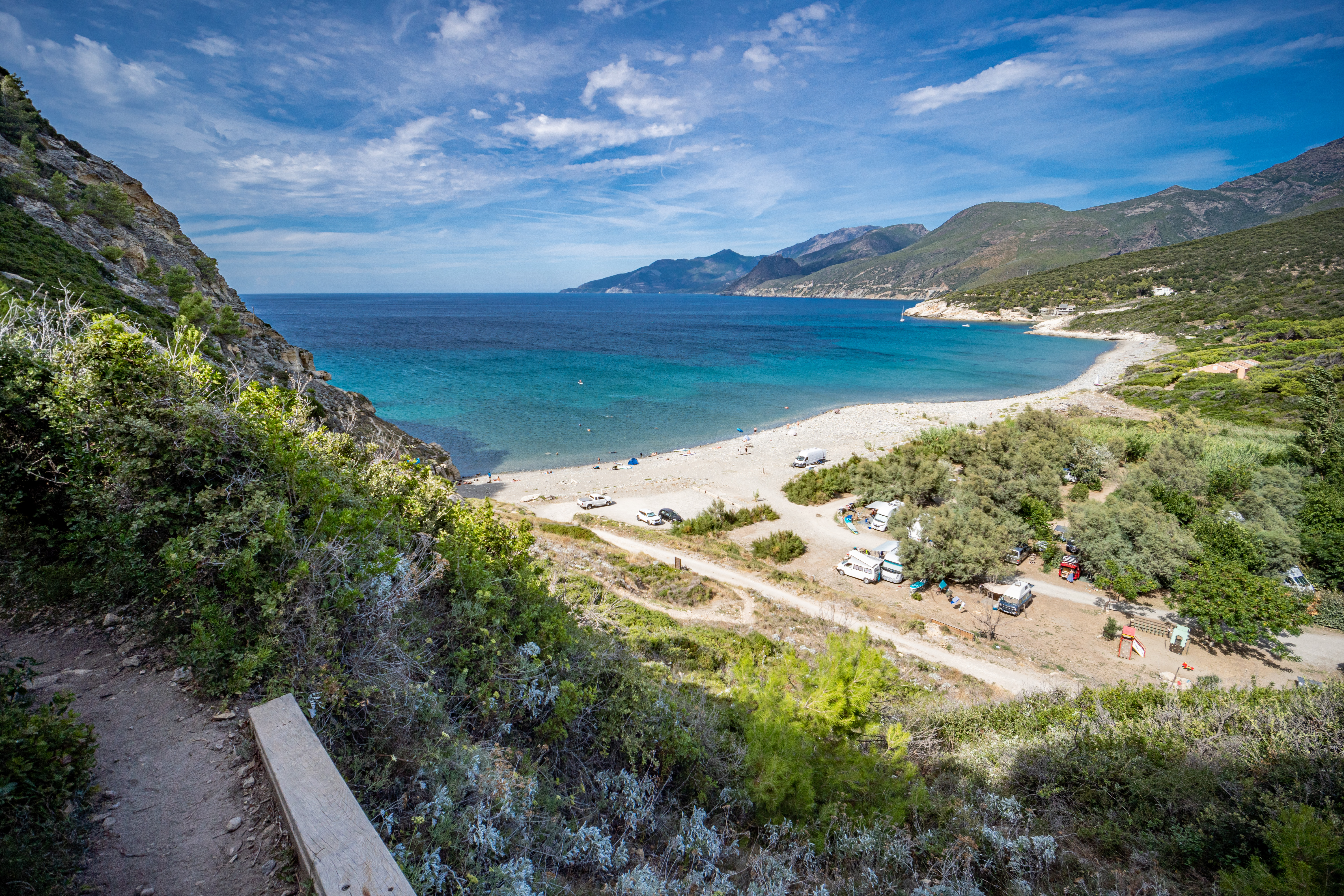 Unterwegs stoßen wir auf einen kleinen, in die Jahre gekommenen Campingplatz. Wir beschließen unsere Capumrundung zu verschieben, zugunsten von Sonne und Meer. Wir ergattern einen tollen Platz direkt am Strand. Klamotten runter, Badehose an. Wir verbringen den Rest des Tages am Meer. Am Abend gönnen wir uns eine Pizza, kann man bestellen und dann direkt am Stellplatz essen. dazu ne Flasche korsischen Rosé.