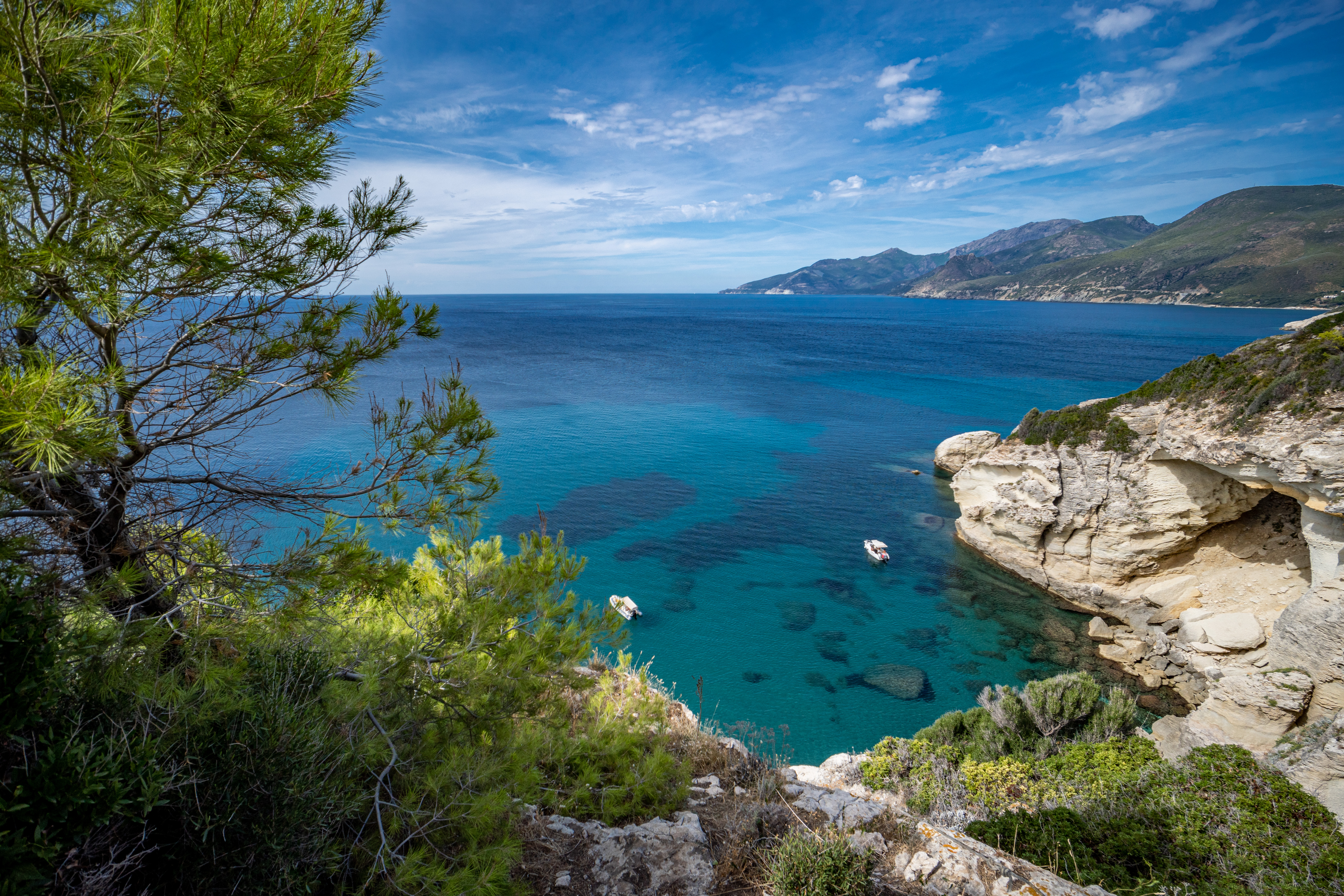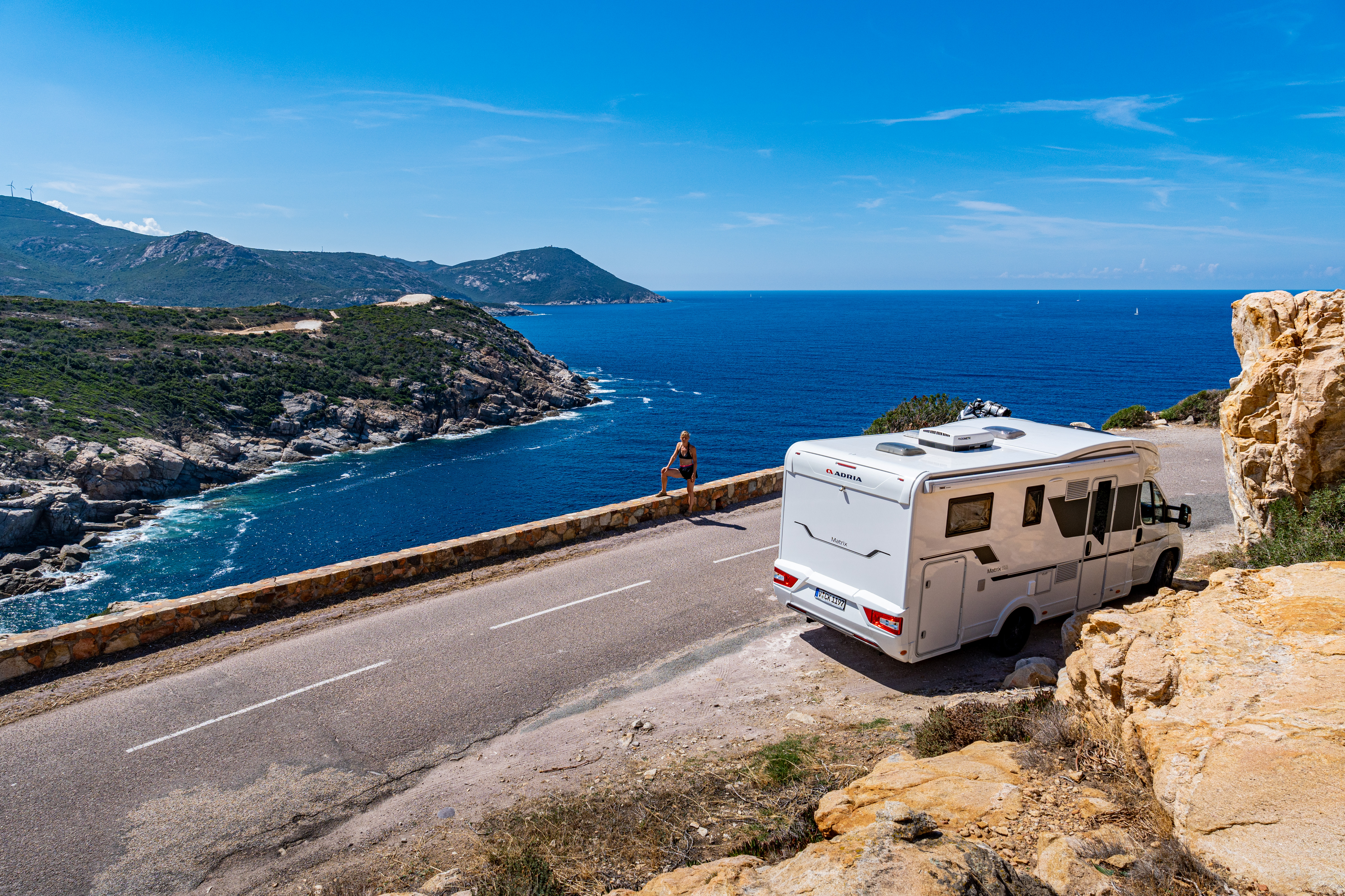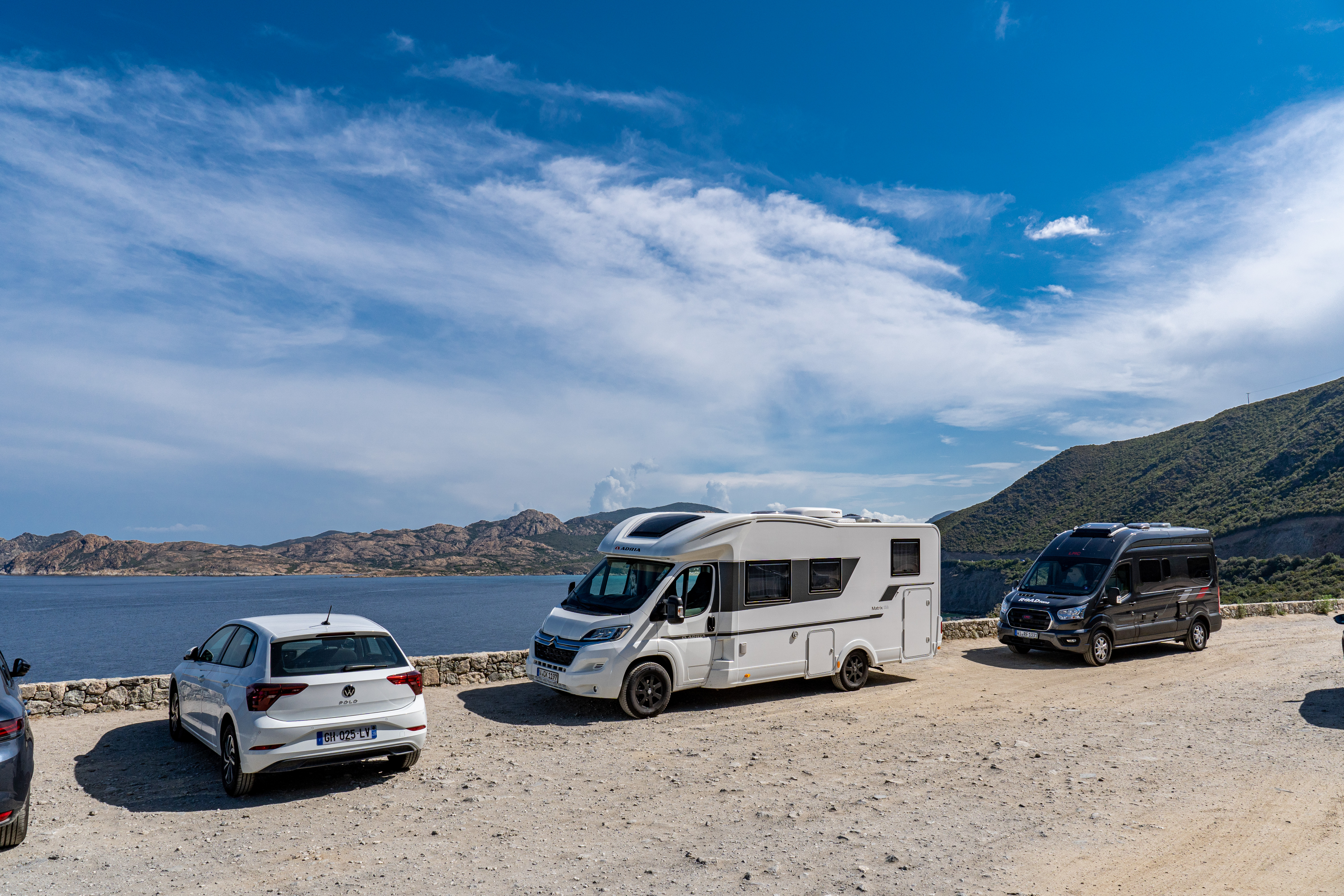 Unterwegs stoßen wir auf einen kleinen, in die Jahre gekommenen Campingplatz. Wir beschließen unsere Capumrundung zu verschieben, zugunsten von Sonne und Meer. Wir ergattern einen tollen Platz direkt am Strand. Klamotten runter, Badehose an. Wir verbringen den Rest des Tages am Meer. Am Abend gönnen wir uns eine Pizza, kann man bestellen und dann direkt am Stellplatz essen. dazu ne Flasche korsischen Rosé.
