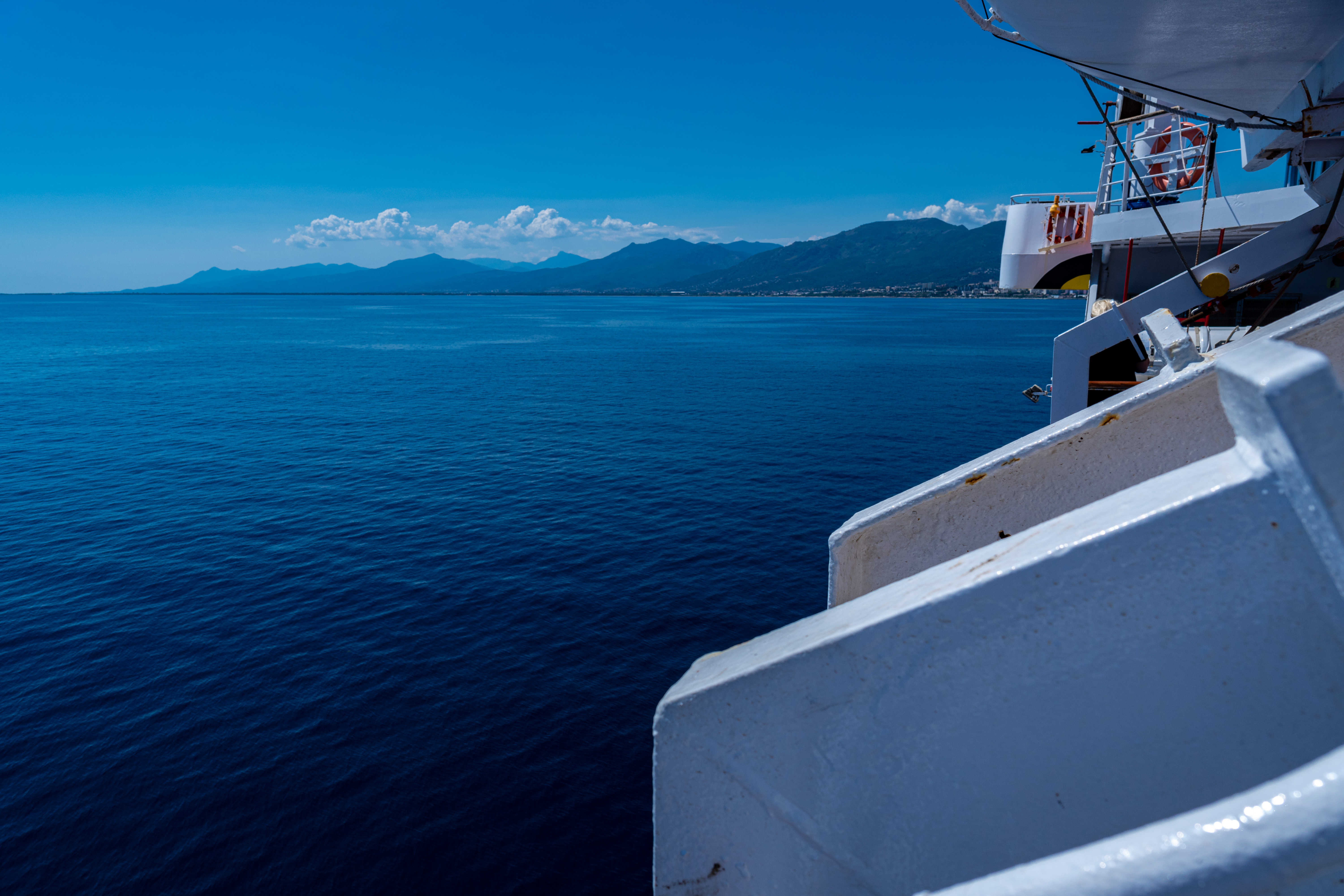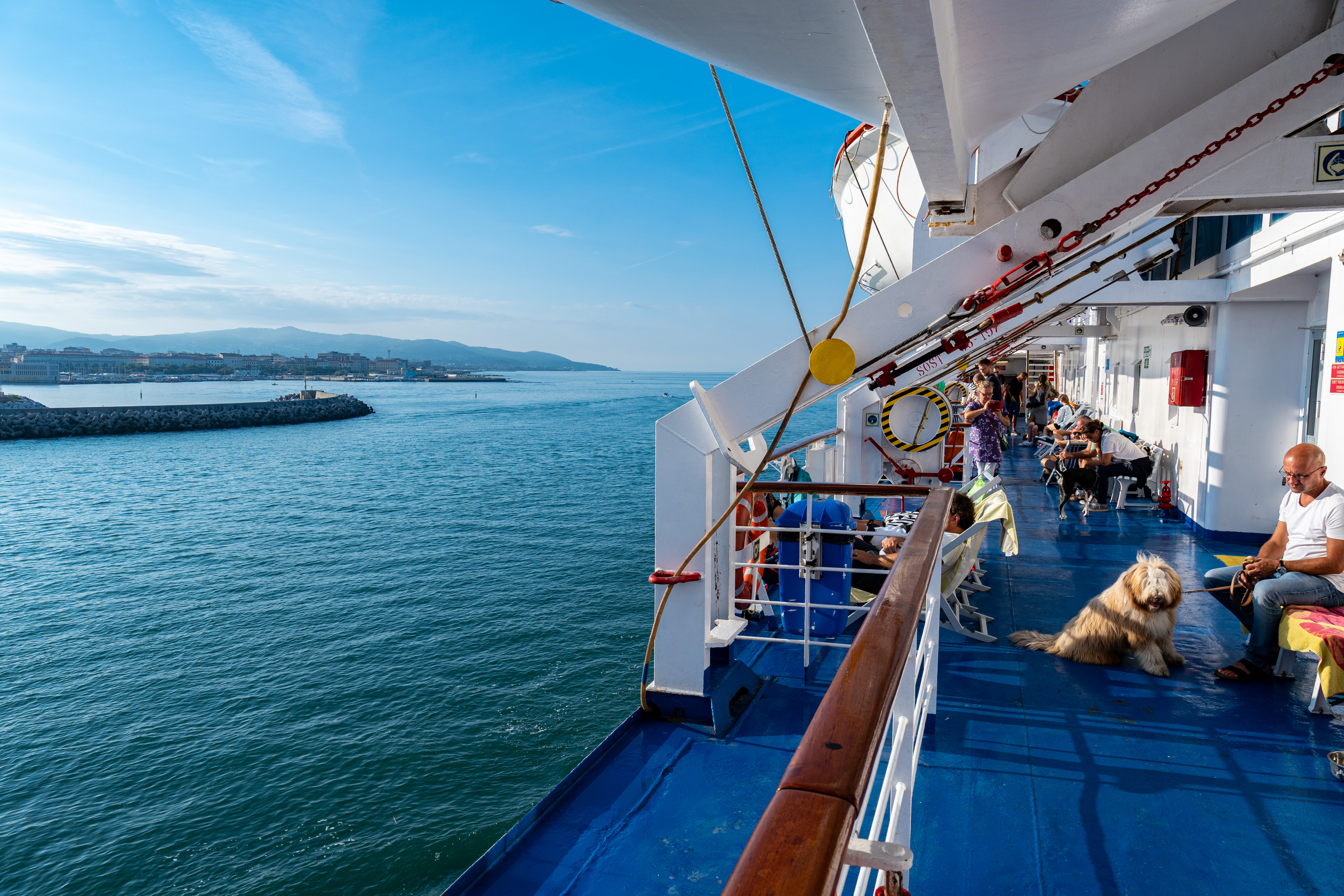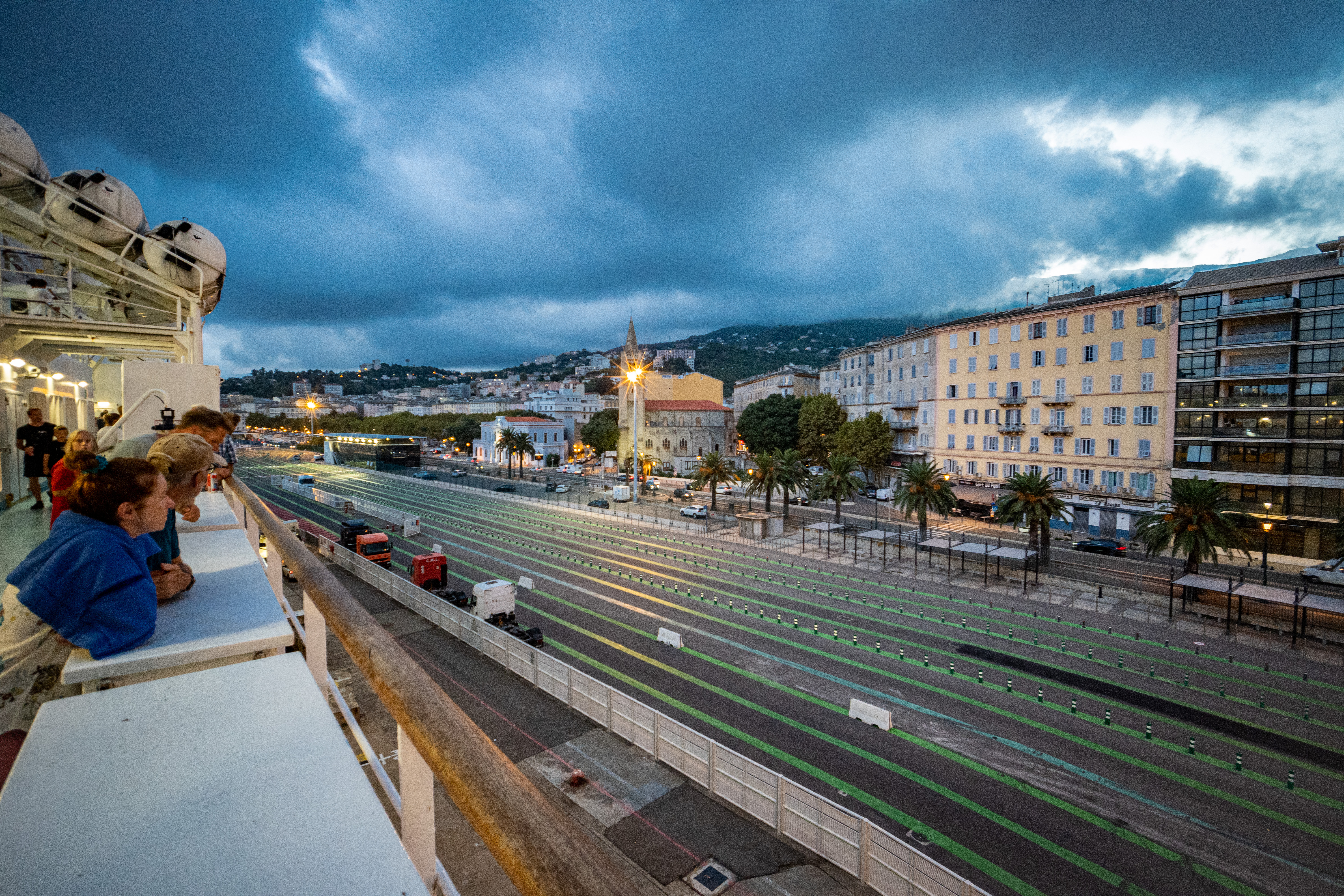 Wir suchen uns ein Plätzchen an Deck, ruhig ist es hier leider nirgends. Wir genießen die ersten Sonnenstrahlen beim Auslaufen aus dem Hafen von Livorno. Gemütlich dümpeln wir vier Stunden unserem Ziel des Tages entgegen - Bastia auf Corsika.