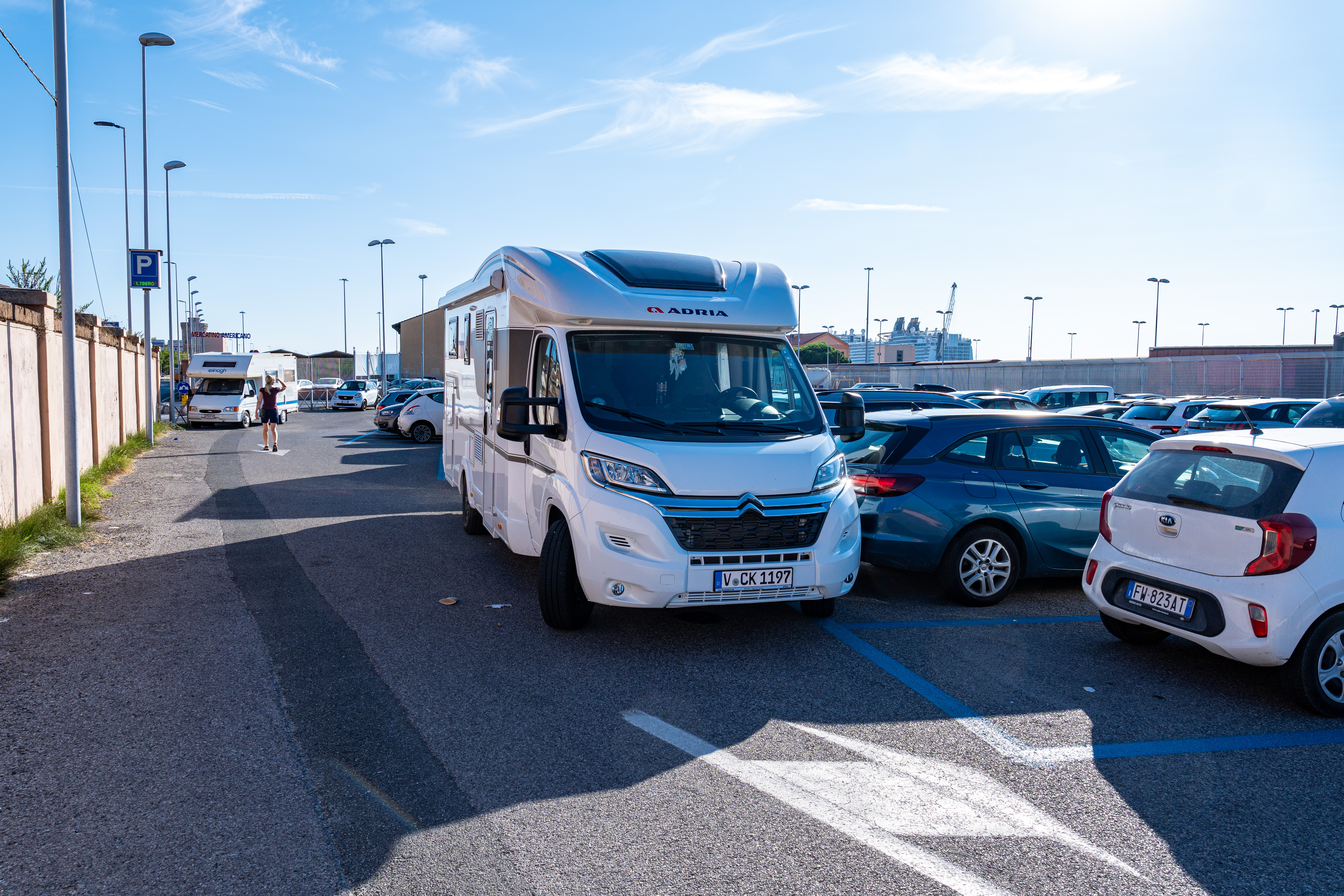 Guten Morgen Kufstein. Wir haben ruhig auf dem Platz übernachtet. Katja flitzt zum nahegelegenen Bäcker und holt Semmeln und Brot. Frisch gestärkt gehen wir die nächsten 600 km an. Über Innsbruck und den Brenner immer weiter gen Süden. Zum Mittag machen wir einen Stopp in Affi, die Ausfahrt zum Gardasee. Kurz mal beim „SPORTLER“ shoppen und eine kleine Pizza am Einkaufscenter, dann geht es weiter Richtung Bologna und Florenz. Dort halten wir uns dann in westlicher Richtung unserem Tagesziel Livorno entgegen. Wir erreichen gegen drei den angepeilten Parkplatz direkt am Hafen. Automat fürs Parken geht, topp, und einen halbwegsen Stellplatz finden wir auf dem überfüllten Parkplatz auch noch.