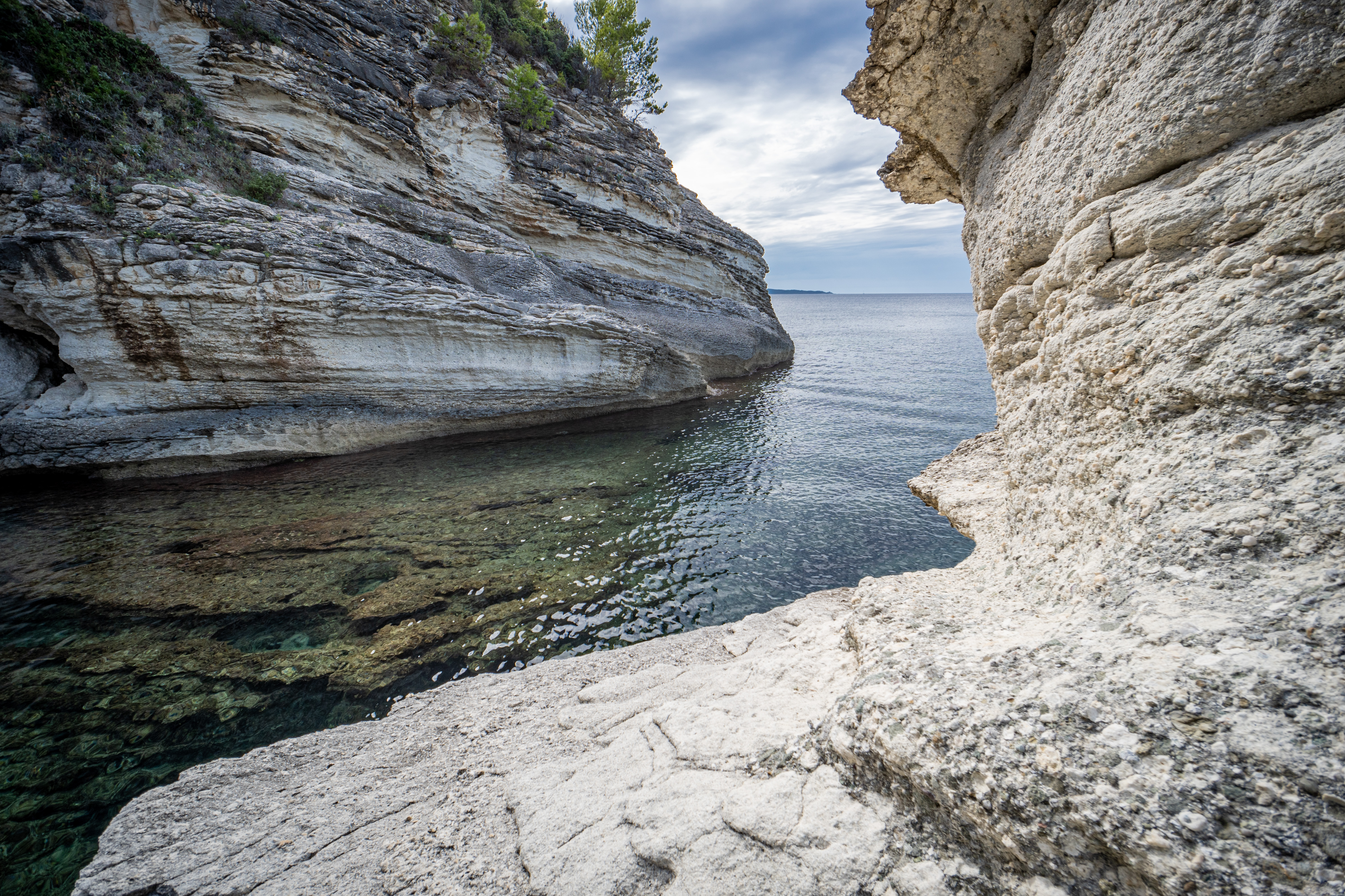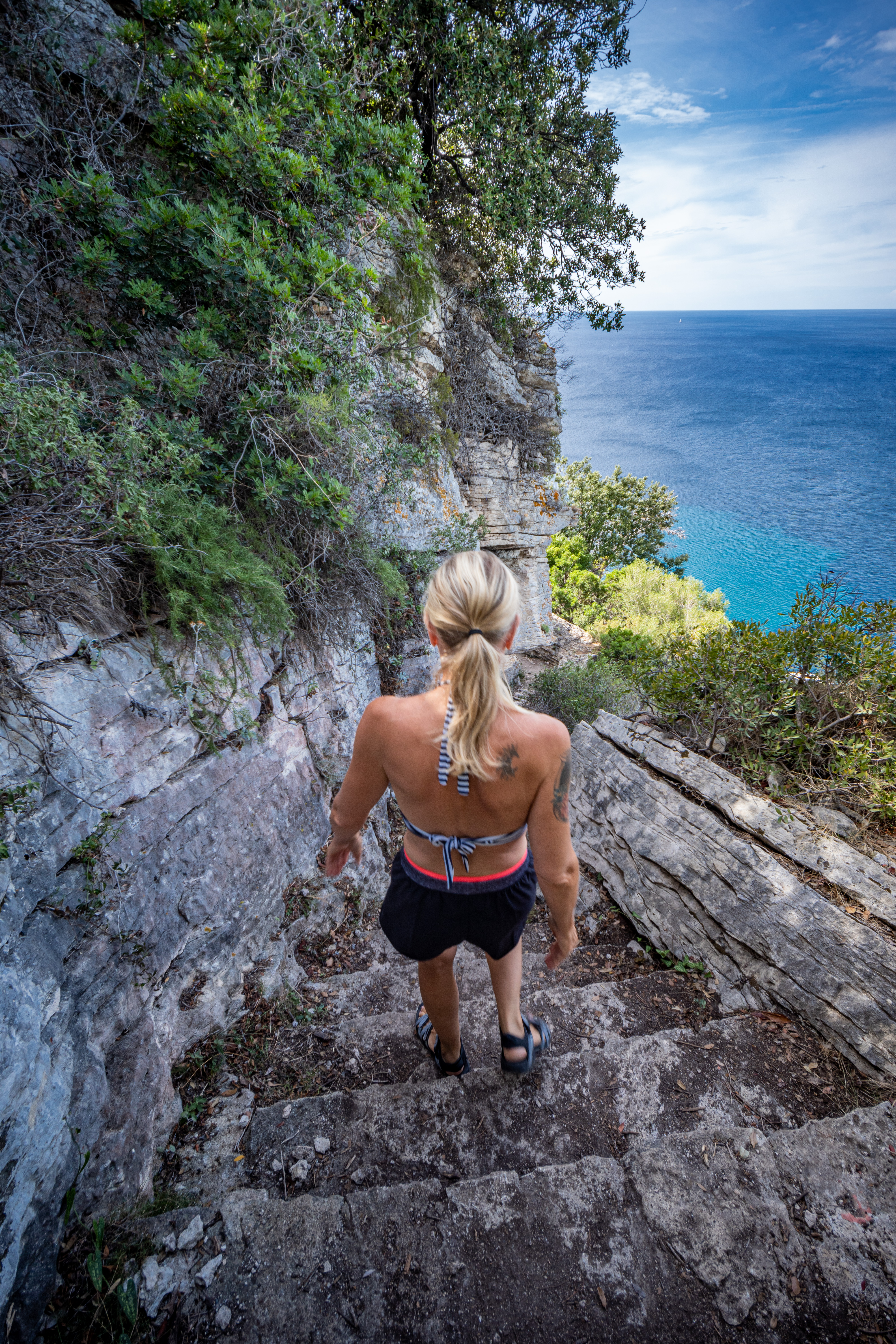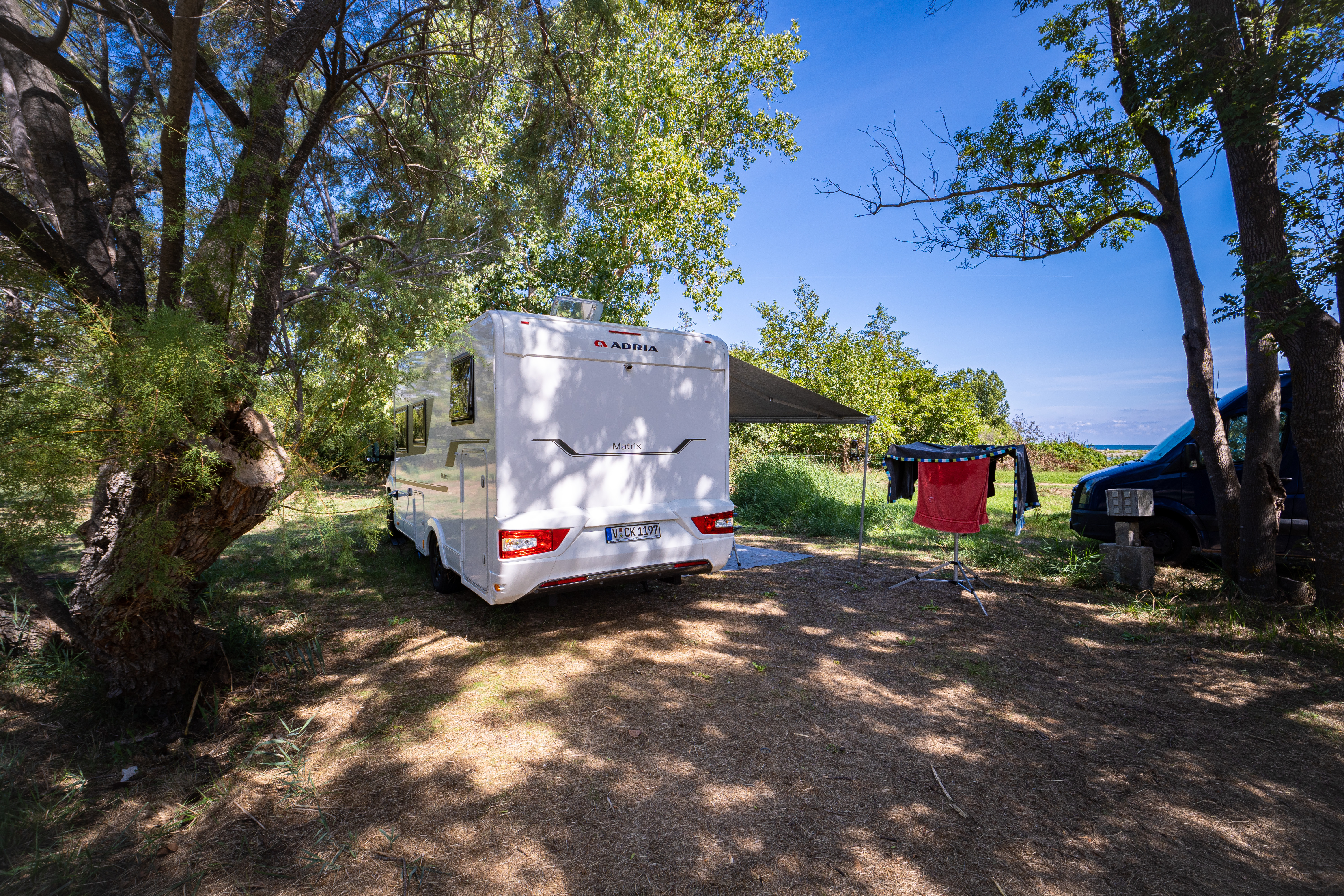 Uns erwartet ein weiterer Tag in der kleinen Bucht. Ich beginne den Tag mit Müll „rausbringen“. Das Problemchen ist, dass die Mülltonnen des Campingplatz vorn an der Straße stehen, klingt ansich logisch, ist aber ca. 1,25km (sagt Komoot) weit entfernt - na super - schon die ersten 2,5km vor dem Frühstück gelaufen und klitsch nass. Katja macht Frühstück unterdessen und ich bring auf dem Rückweg Baguette und Croissant mit. Es weht ein laues Lüftchen um unseren Adria und die Sonne blinzelt zwischen den Blättern auf uns, wir meinen das in der Art zu deuten, dass wir heute mal lieber nix machen, außer baden und sonnen und baden…kein Ding, wir hören auf Mutter Natur.