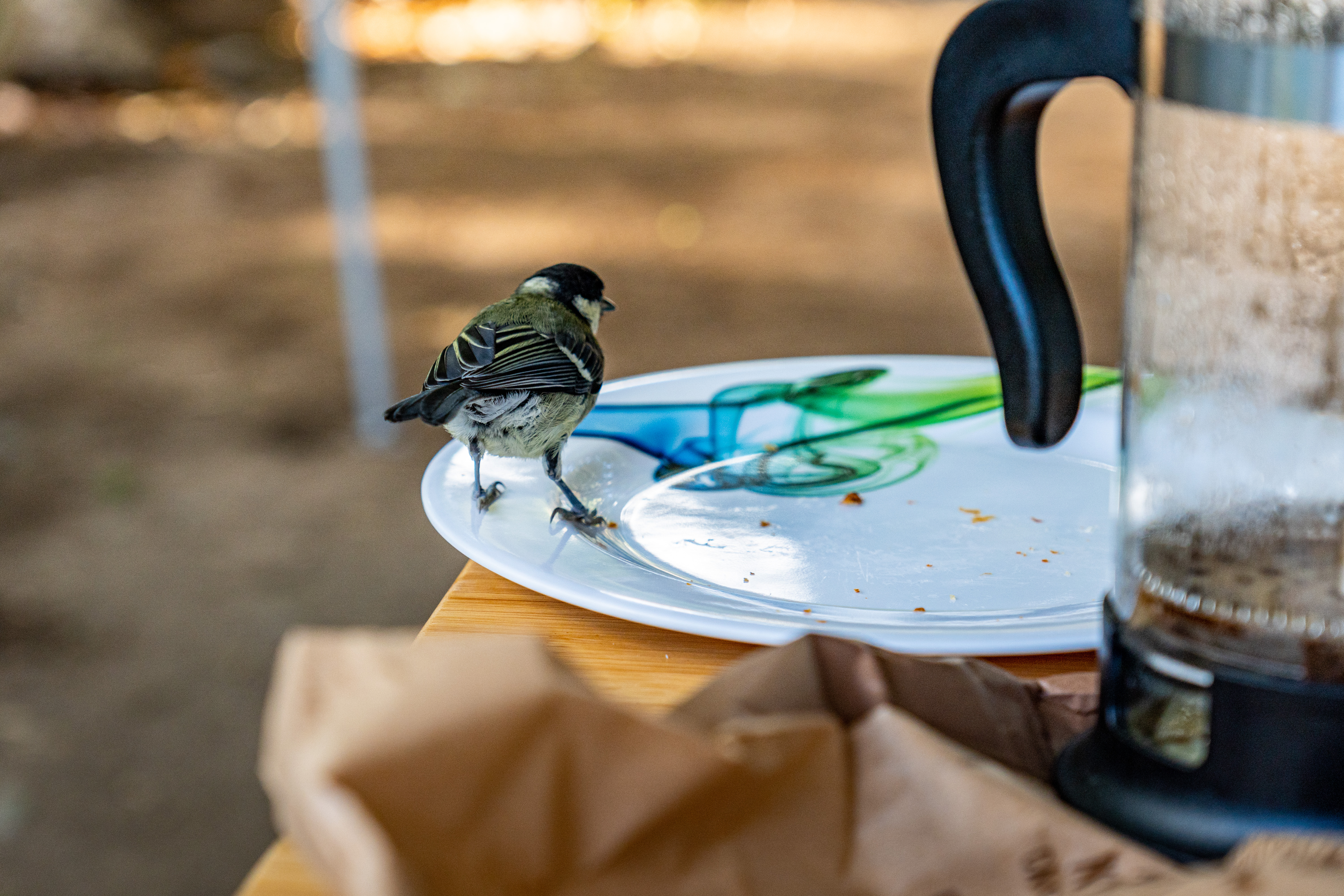 Gewitternacht war angesagt, alles ist richtig schön nass geregnet. Also in der Natur. Bei uns ist alles trocken. Die Neugier zieht uns heute weiter. Wir frühstücken gemütlich, waschen auf und bezahlen die zwei Nächte hier auf dem schönen Platz bei Porto (57,-€). Eine kleine Meise ist derart frech dass sie uns die Krümel vom Teller stibitzt. Stört uns aber nicht, tolles Motiv.