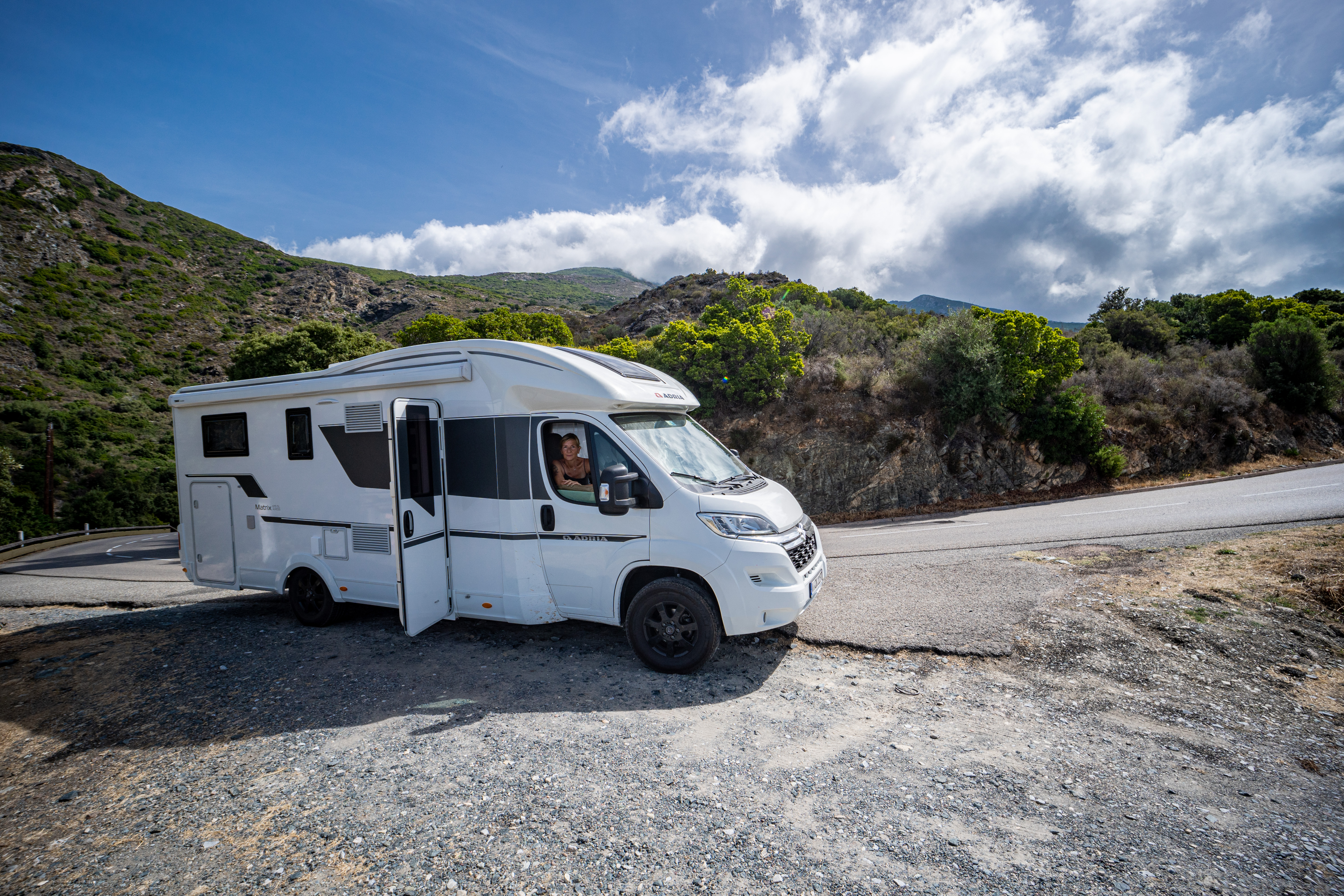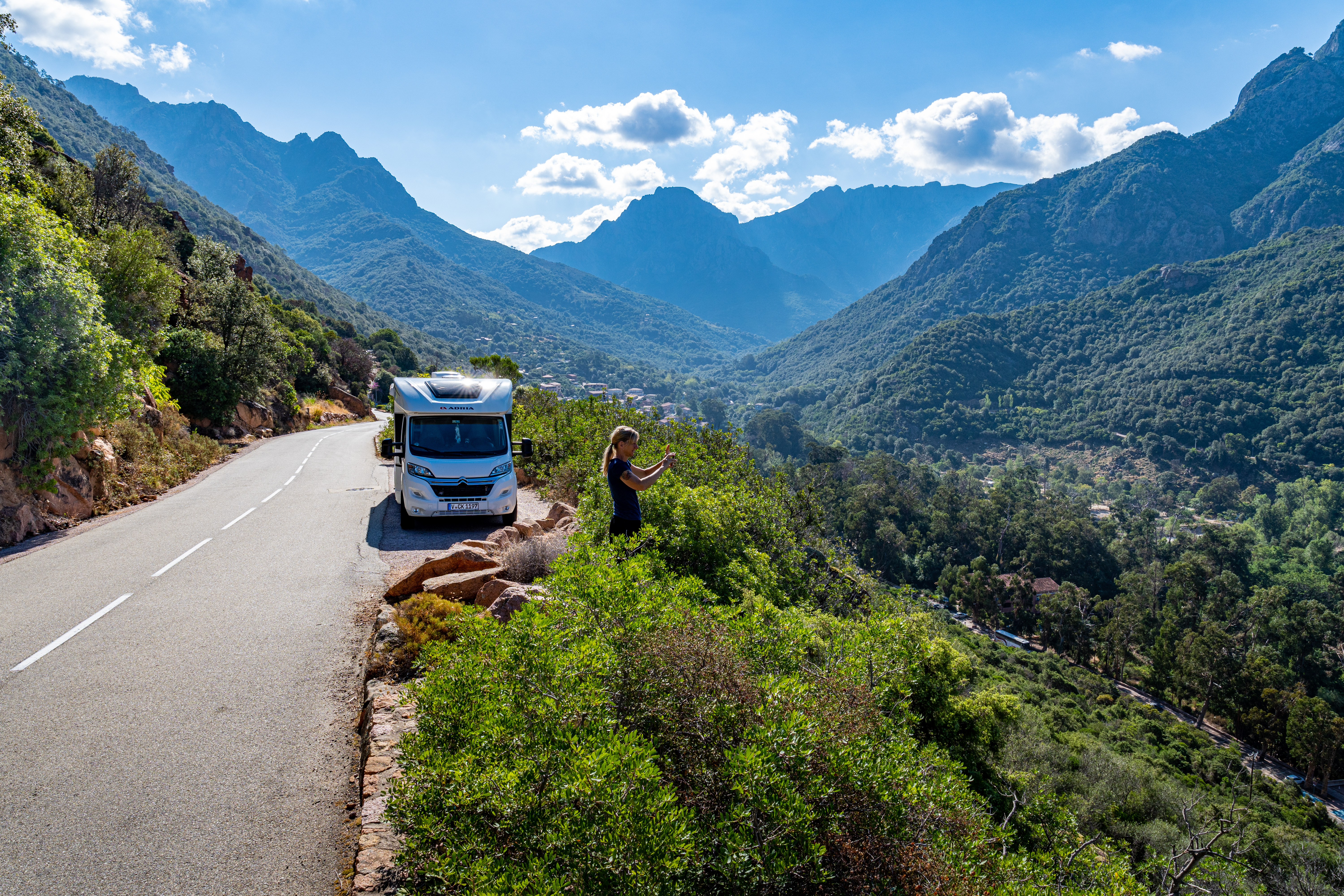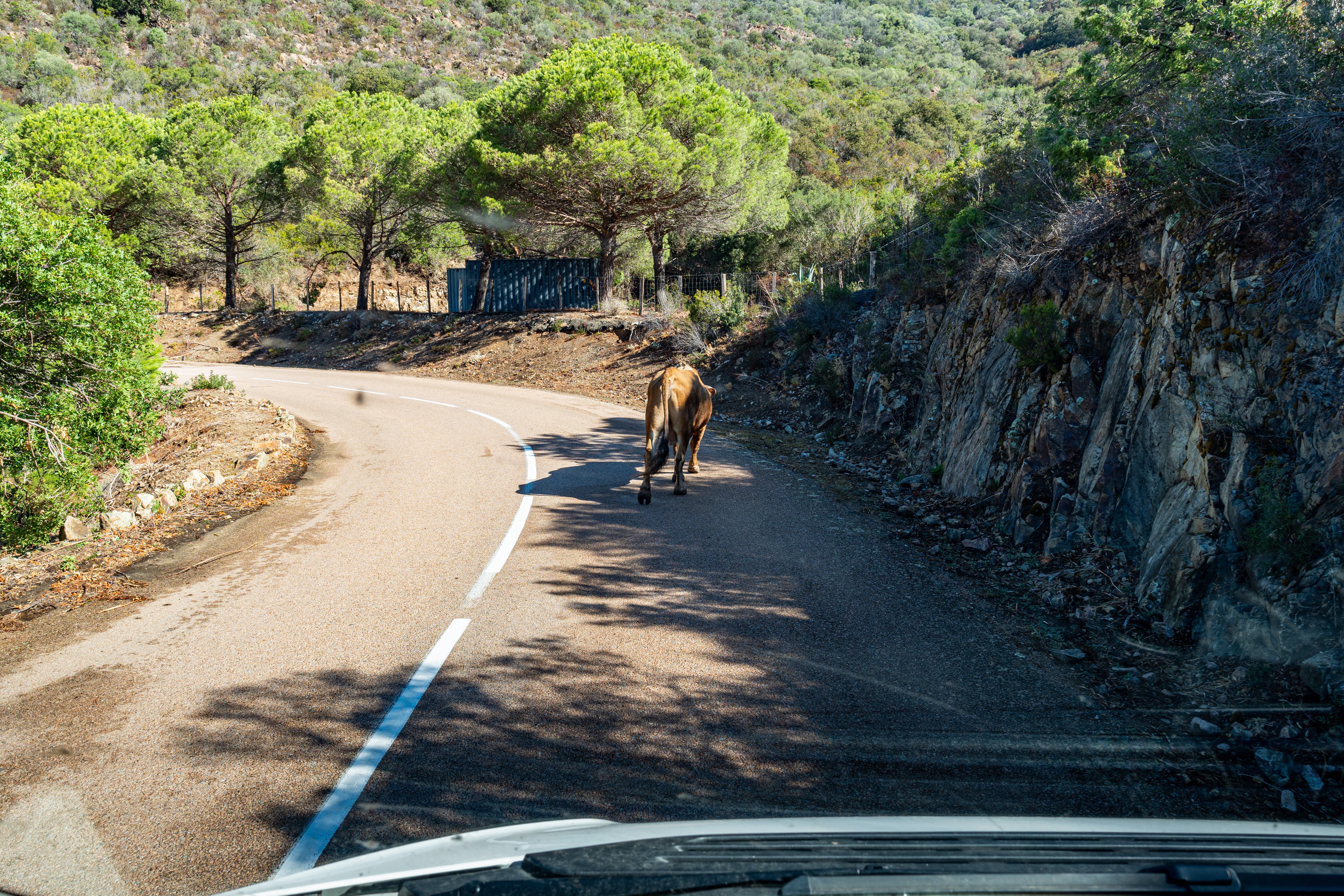 Im Internet sucht Katja den Stellplatz „Camping Funtana a l´Ora“ heraus. Auf gehts. Wir nehmen die T20 in nördliche Richtung und biegen nach wenigen Kilometern in Francardo auf die D84. Die Straße schlängelt sich stets bergauf bis wir nach Calacuccia auf 1.447m ü. NN den Pass „Col de Vergio“ erreichen. Ab hier geht es fast nur noch bergabwärts, vorbei an Èvisa, Wildschweinen, Kühen und Ziegen erreichen wir kurz vor Porto den Campingplatz.