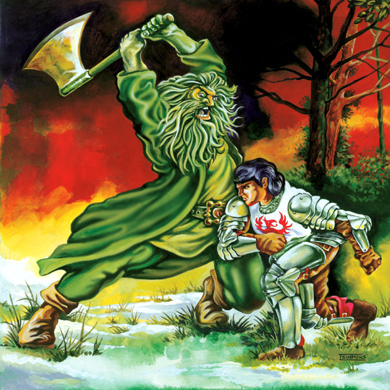 Sir Gawain goes out to find the Green Knight and calls him out, ready for the challenge.