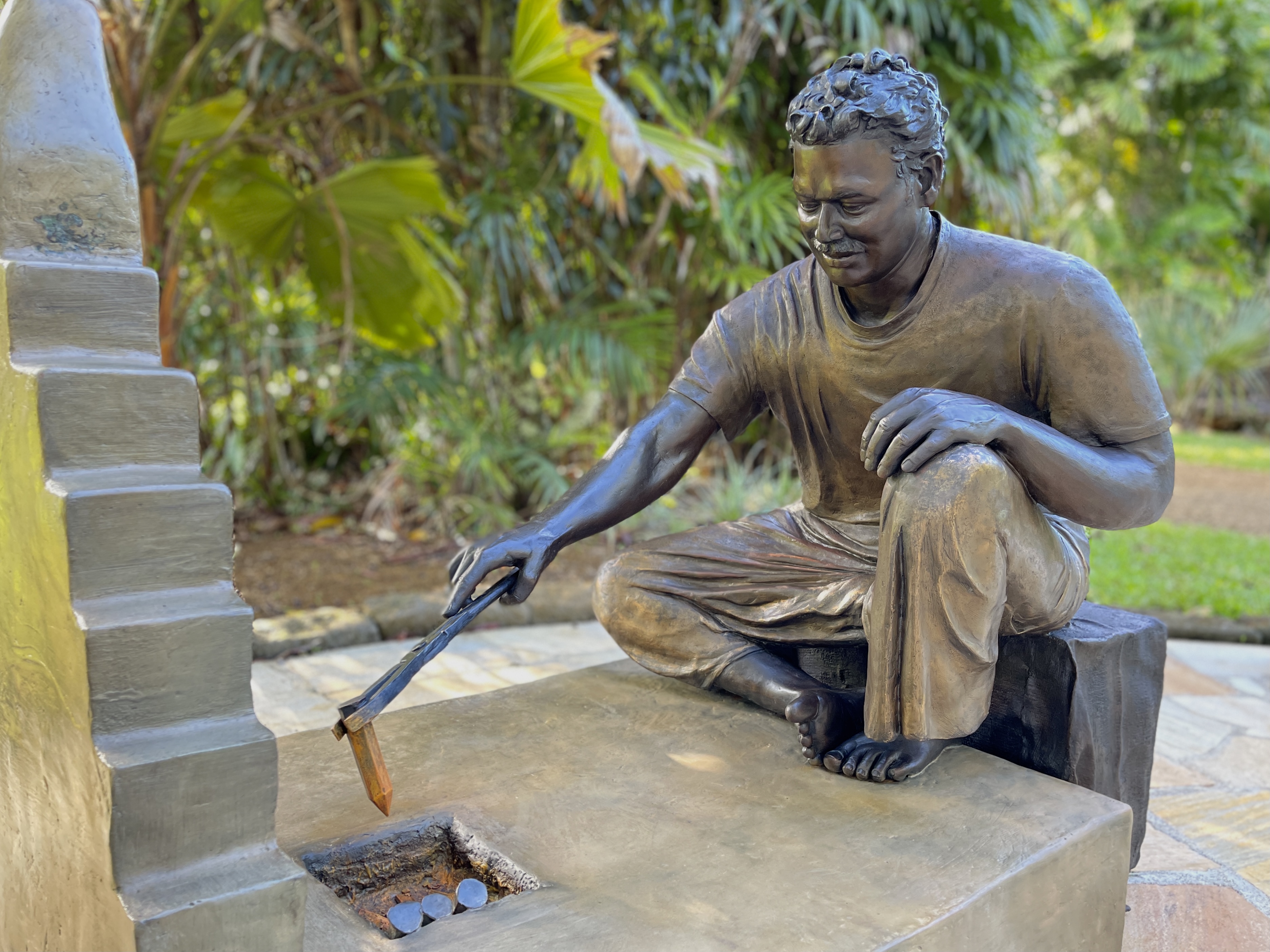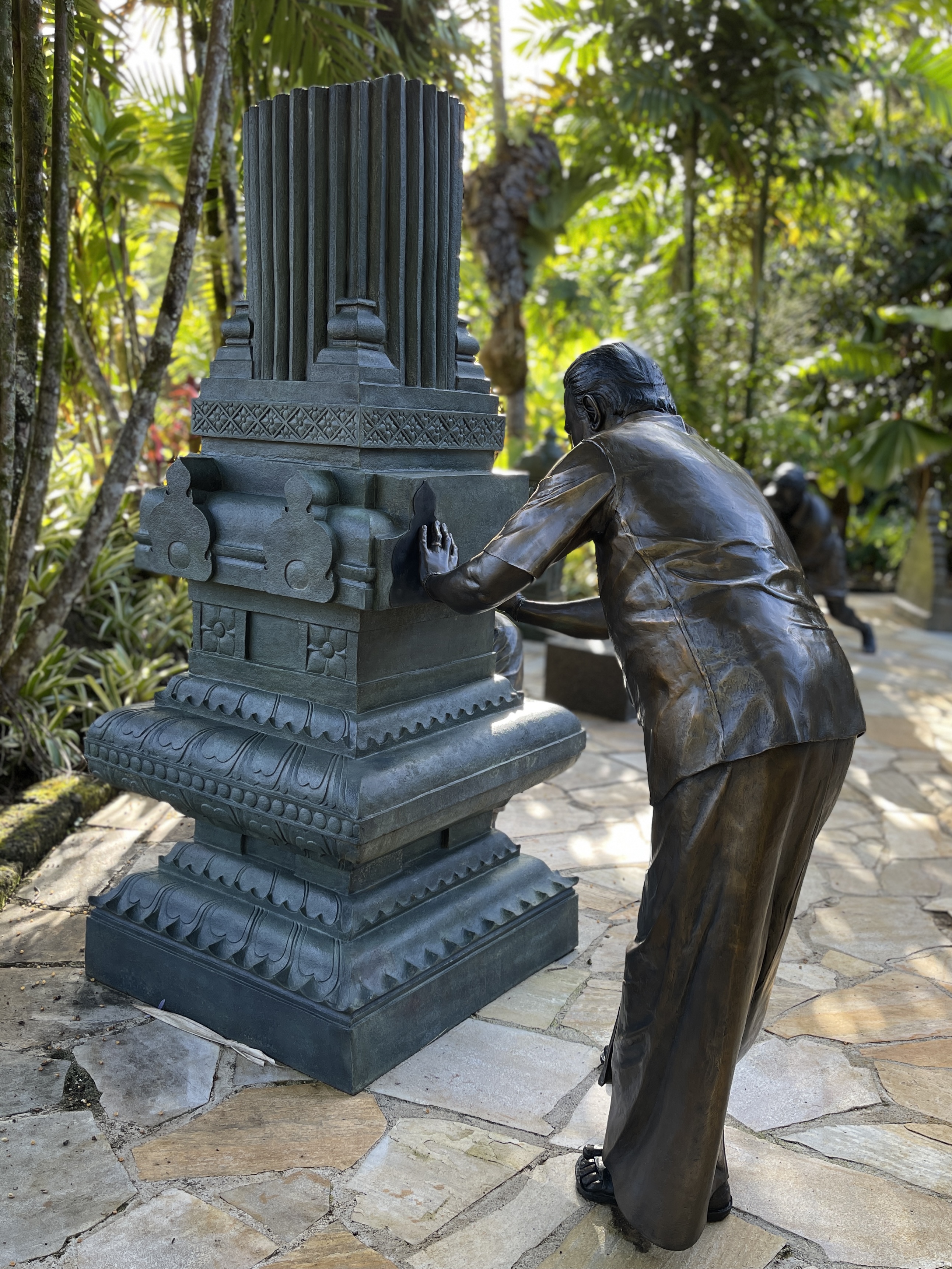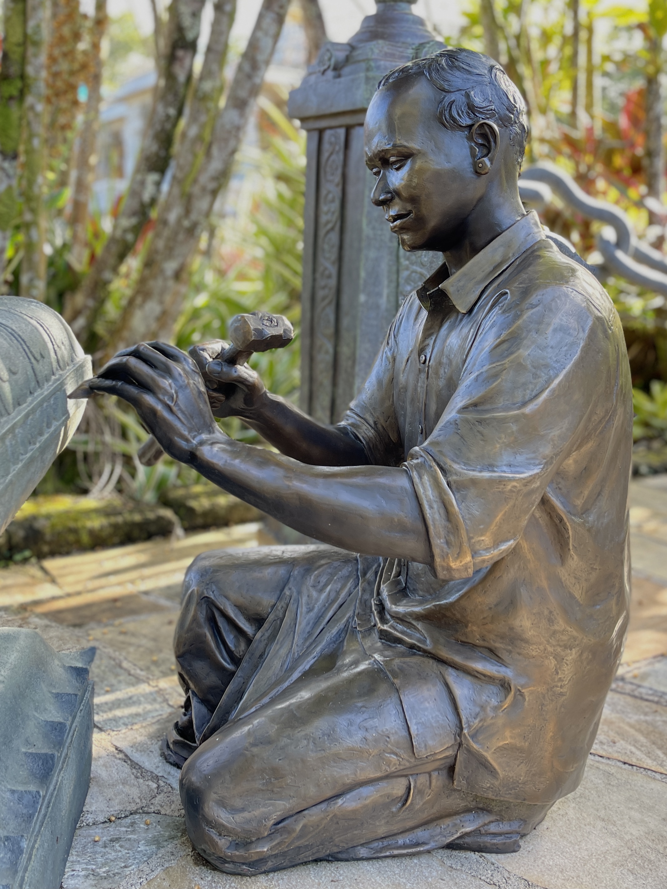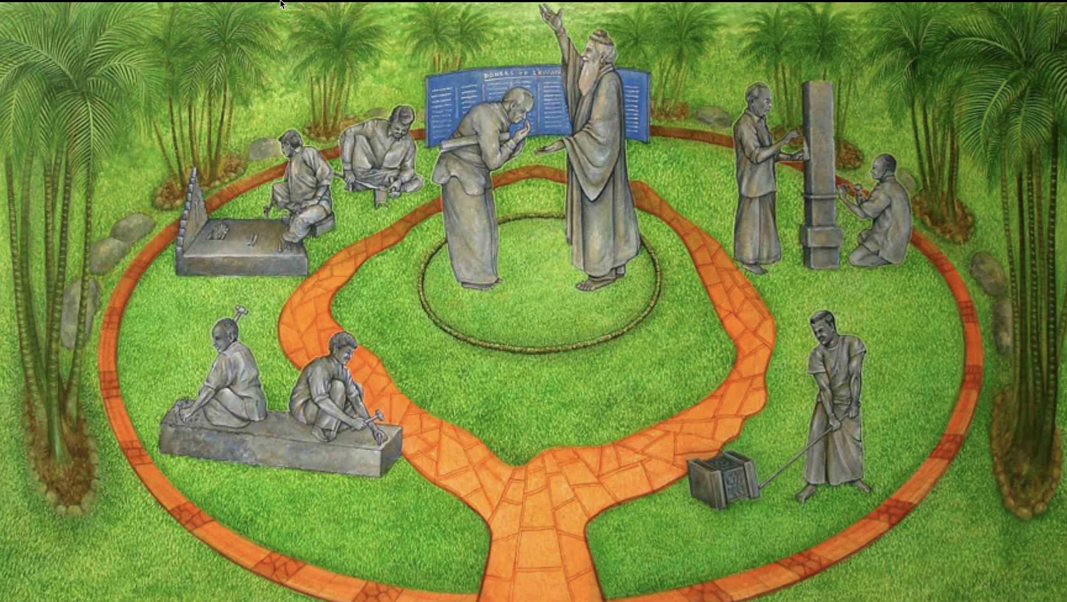 Around 1999, Satguru Sivaya Subramuniyaswami, affectionately known as Gurudeva took note of the sweet sounds the silpis (Indian stone sculptors) were making with their chisels as they shaped the white granite. He realized visitors of the future Iraivan Temple would not be privileged to see this amazing process on the island. So he directed the monks to create a bronze memorial that would depict the ancient technology.