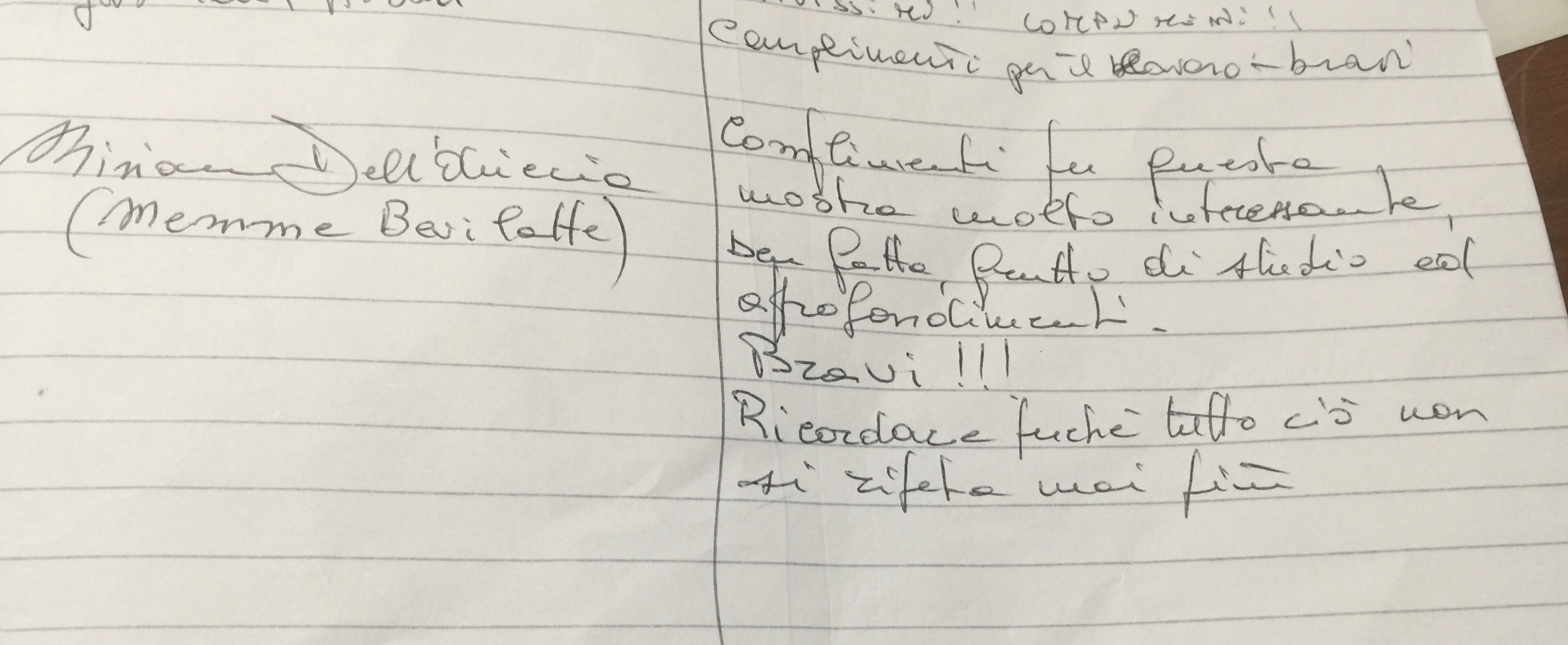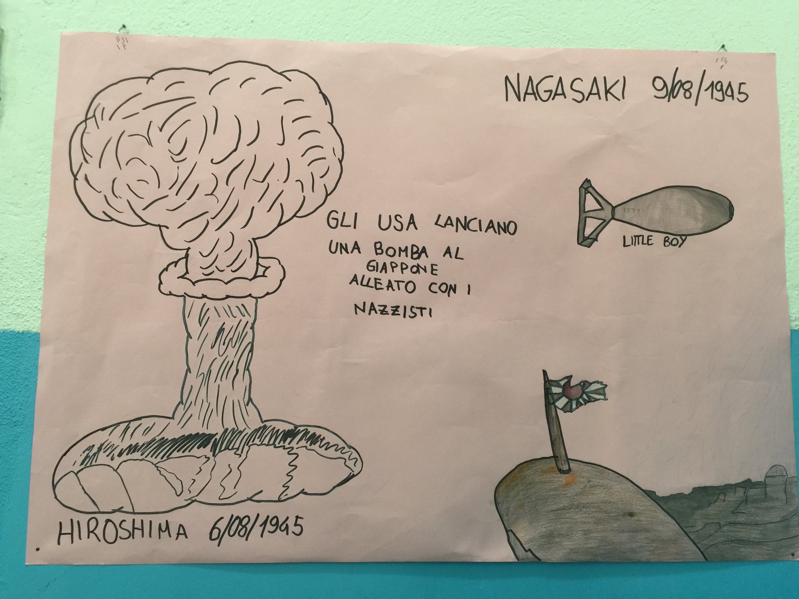 Gabriele: Come ben hanno detto i miei compagni e come credo sia stato chiaro a tutti , oggi abbiamo l’occasione per fermarci e sentire dal vivo alcuni momenti di storia Vera. Un’occasione questa che non ci capita spesso; la signora Miriam è venuta dall’altra parte del mare, per portare la sua testimonianza, e se ha fatto questo sacrificio credo che ne valga la pena ascoltarla con attenzione. Noi della terza media , che siamo quelli più grandi del nostro Istituto siamo quelli che di più hanno affrontato questi argomenti , molto difficili per alcuni versi, ma altrettanto chiari . Perché anche se siamo piccoli, quando si tratta di capire la storia, capiamo che alcune azioni fatte da uomini adulti non erano giuste , anzi ... Per questo siamo grati della sua presenza , infatti, se anche siamo ancora piccoli abbiamo capito che queste cose non dovevano accadere, ma non basta perché devono più accadere mai più ! e nel ricordarle , nel capirle, studiarle , abbiamo il compito di costruire un futuro di pace, e rispetto reciproco, per il bene di tutta l’umanità. Grazie della sua visita , e della grande occasione, la invitiamo a visitare la nostra mostra documentaria, venga a trovarci nel nostro istituto, le presenteremo il nostro lavoro, che se anche conosce bene tutti i fatti storici , siamo certi che sarà un momento piacevole di condividere con noi il nostro piccolo mondo. Grazie.