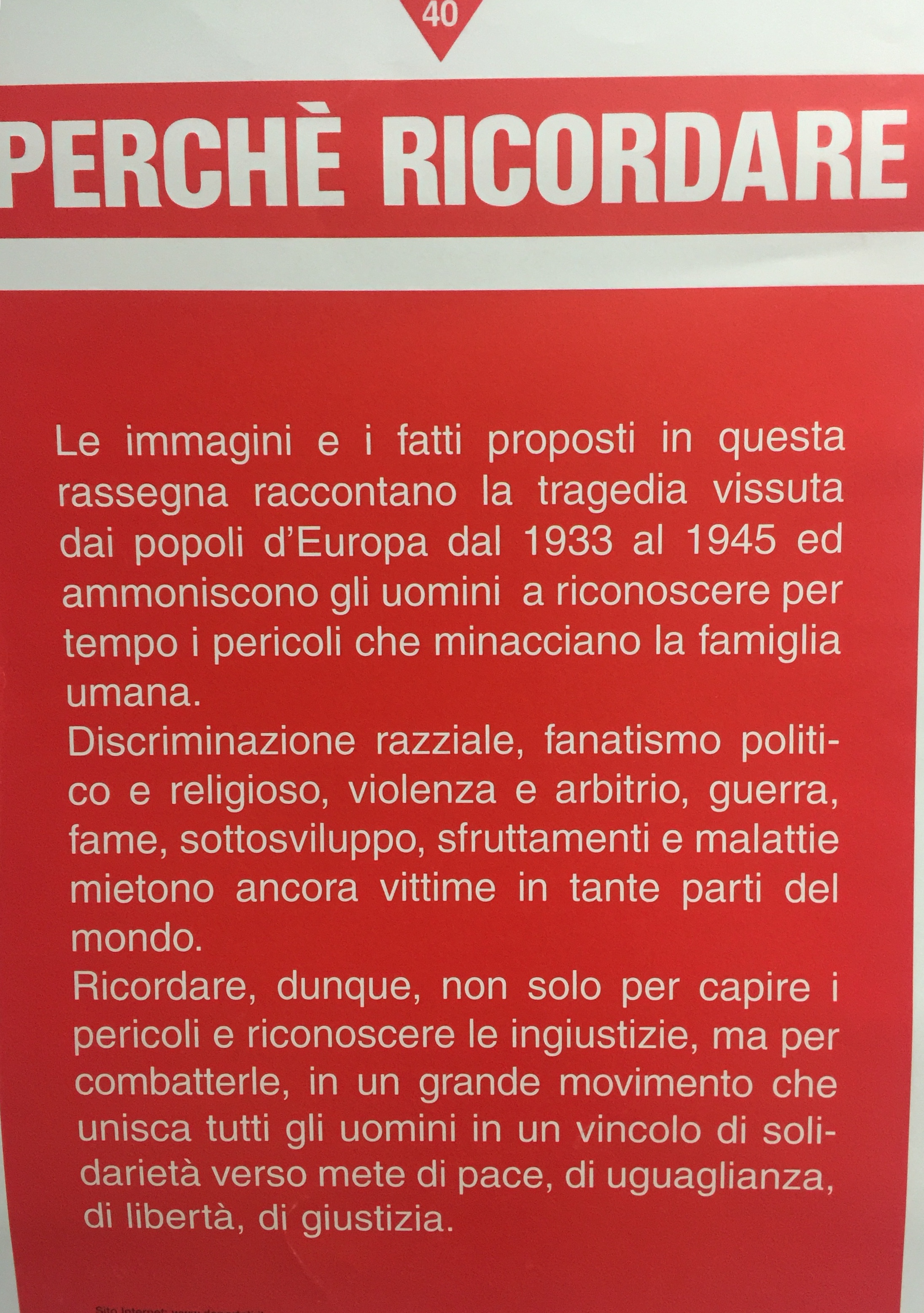 Il valore di questo progetto, è duplice, da una parte , credo che sia l’elemento essenziale dell’insegnamento, inteso a non degenerare con l’idea che sia giusto esternare la forza del male , intesa come elemento unitario di quei tempi, ma vuole essere invece una rilettura dell’uomo moderno a voler chiarire che nell’esternazione dello sconforto , vi sia la luce proprio nella didattica di assumere un impegno, un dovere . Questo è a tradurre l’eredità , che dobbiamo sempre pensare contro una realtà in cui uomini comuni possano trasformarsi in carnefici, per questo dobbiamo essere vigili ad ‘intercettare’ la pericolosità intrinseca di qualsiasi politica di emarginazione, di esclusione.
