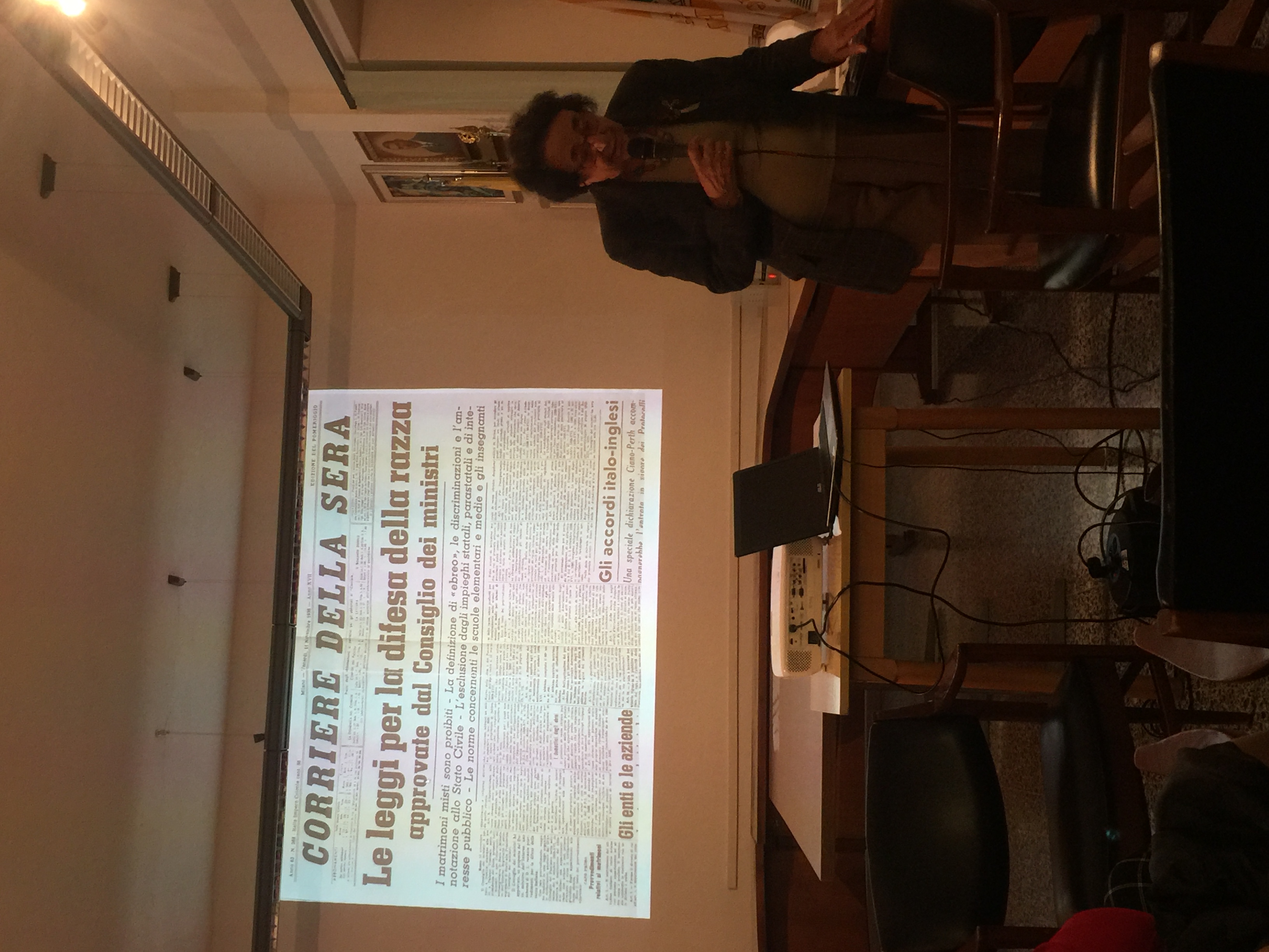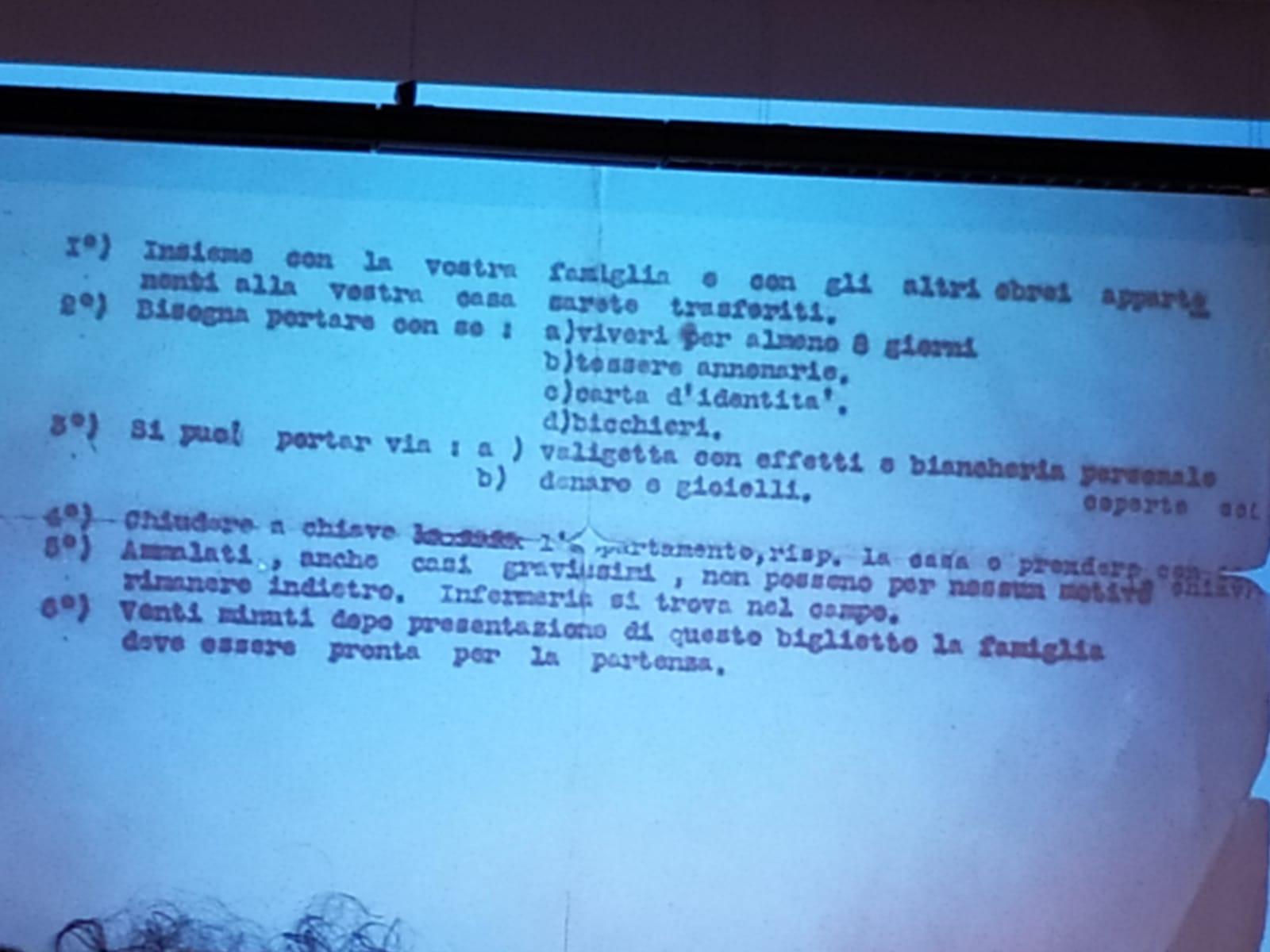L'evento è stato articolato in tre momenti, che ha visto altrettanti appuntamenti . Il primo (come da locandina ), è stato con un pubblico di adulti, che in religioso silenzio hanno ascoltato un coinvolgente racconto storico (leggi razziali, il 1943, l’Armistizio, i nazisti che da alleati diventano nemici, la persecuzione, la deportazione di oltre 1000 ebrei (di cui 200 bambini) del Ghetto ebraico di Roma, e infine la fortuna di essere scampata a quella deportazione).
