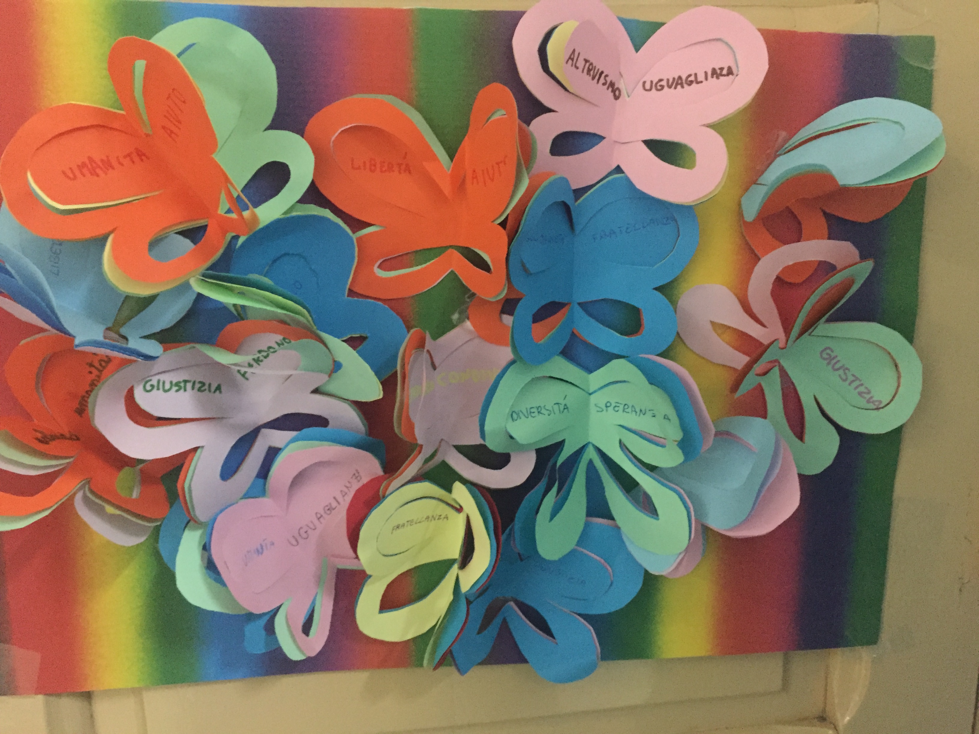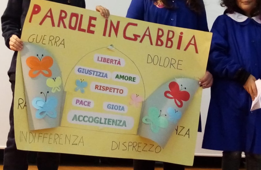 Il più suggestivo è stato quello della scuola primaria di Ovodda . Le classi 4^ e 5^ della primaria di Ovodda hanno lavorato insieme focalizzando l' attenzione sugli aspetti positivi, ovvero: sulle persone che hanno in qualche modo aiutato gli ebrei (cartellone sui Giusti fra le Nazioni e canzone "Il Coraggio di Essere Umani" di Mengoni), sulle parole positive (in gabbia) e negative (libere), (cartellone parole in gabbia); sono state realizzate tante farfalle di carta colorata sulle ali delle quali apaiono scritte le parole positive che hanno ritrovato la libertà... poi distribuite a tutti i presenti.che da una gabbia hanno liberato le parole gentili e di rispetto, “Parole in libertà “ appunto , che hanno fatto librare le farfalle come parole per raggiungere i cuori dell’Umanita’. E ancora hanno consegnato un cartellone illustrando la poesia di Tali Sorek “ Ho dipinto la pace “.