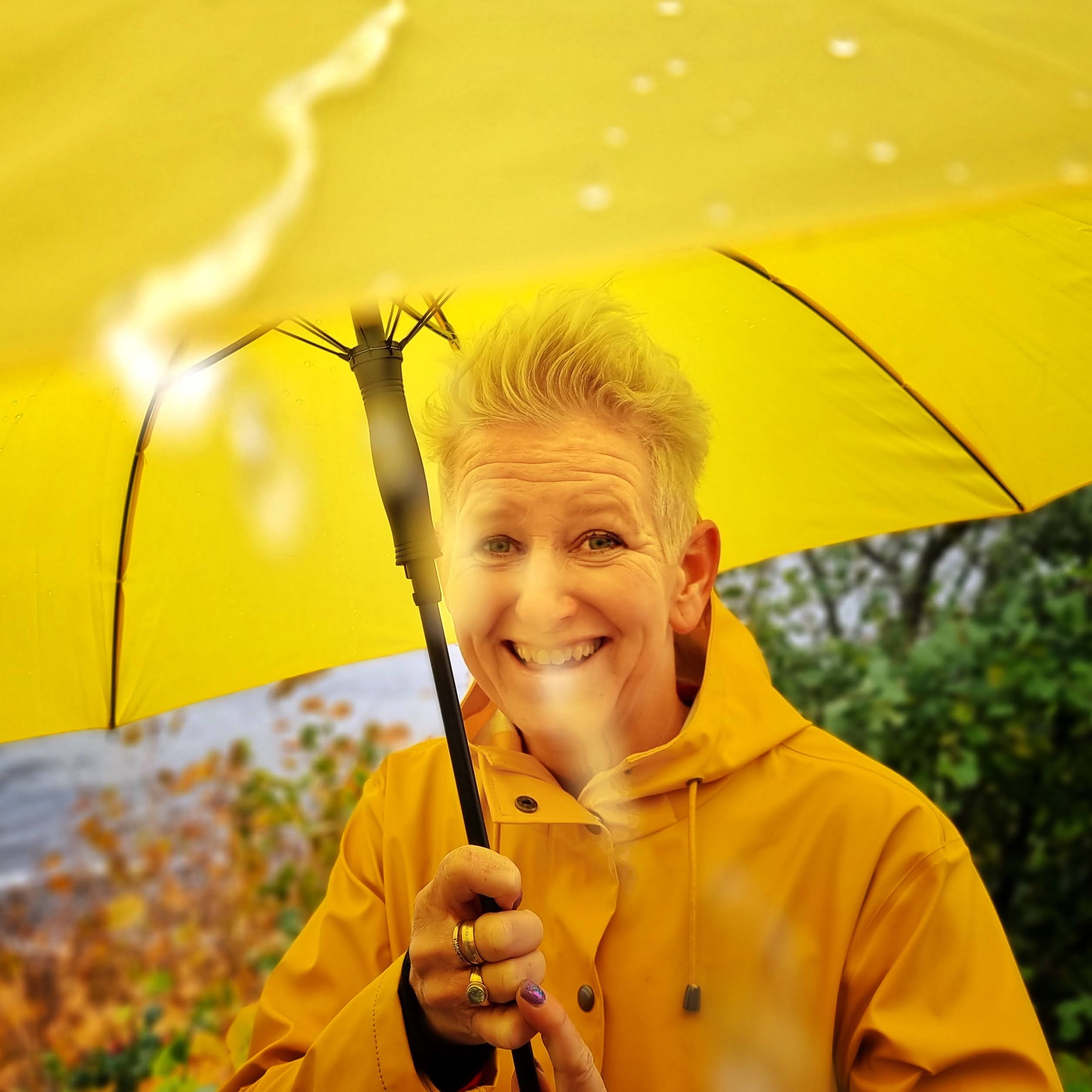 Jeg mødtes med hende i det kuperede terrain i Kregme på Nordsjælland, hvor hun foruden ‘dirt track’ mountainbike-billeder også fik ramt ‘omsorg’ med sin gigant-gule gummiand (smiler) OG sin gule regnjakke OG den gule paraply, fordi: ‘gul gør mig bare glad i låget’.