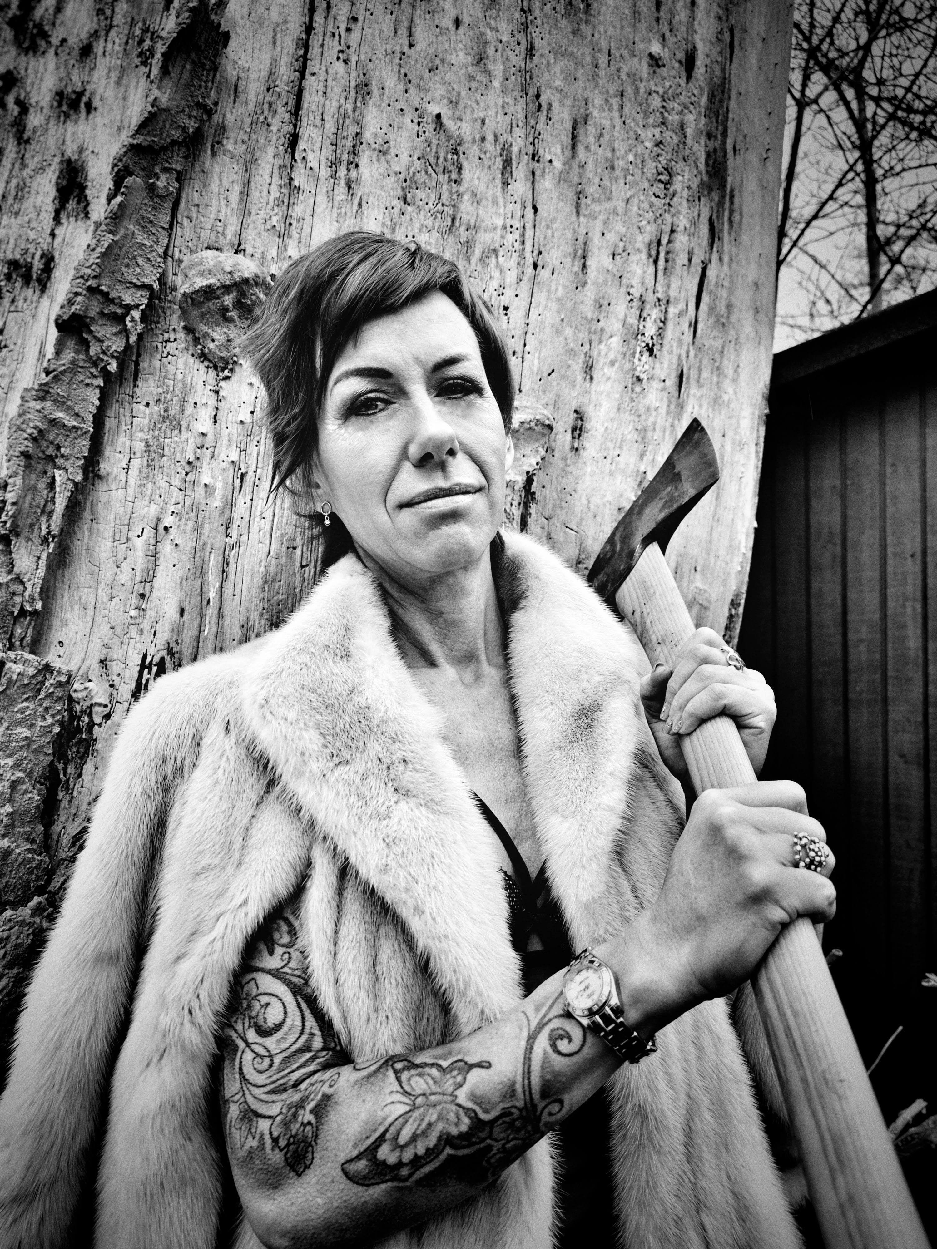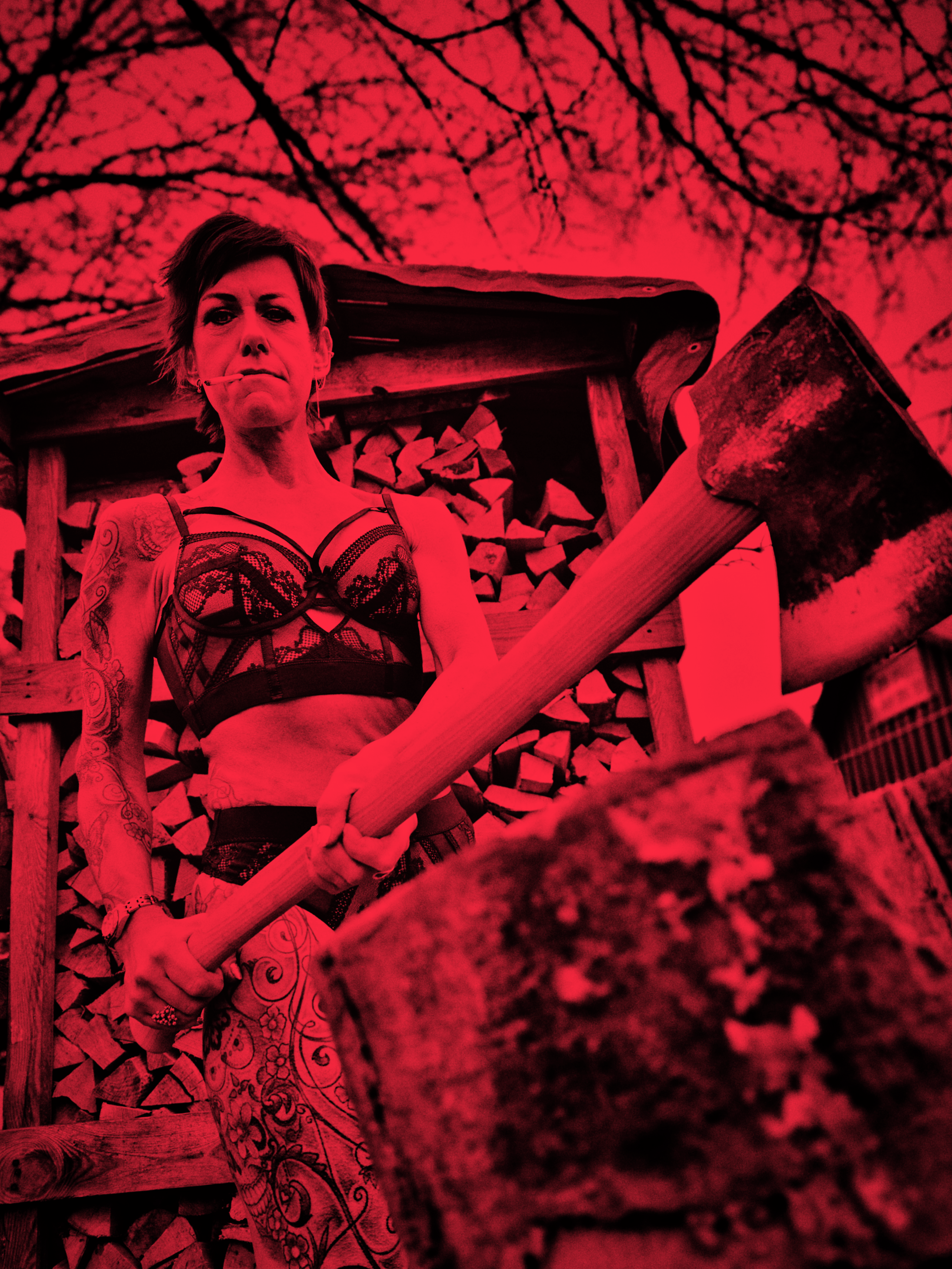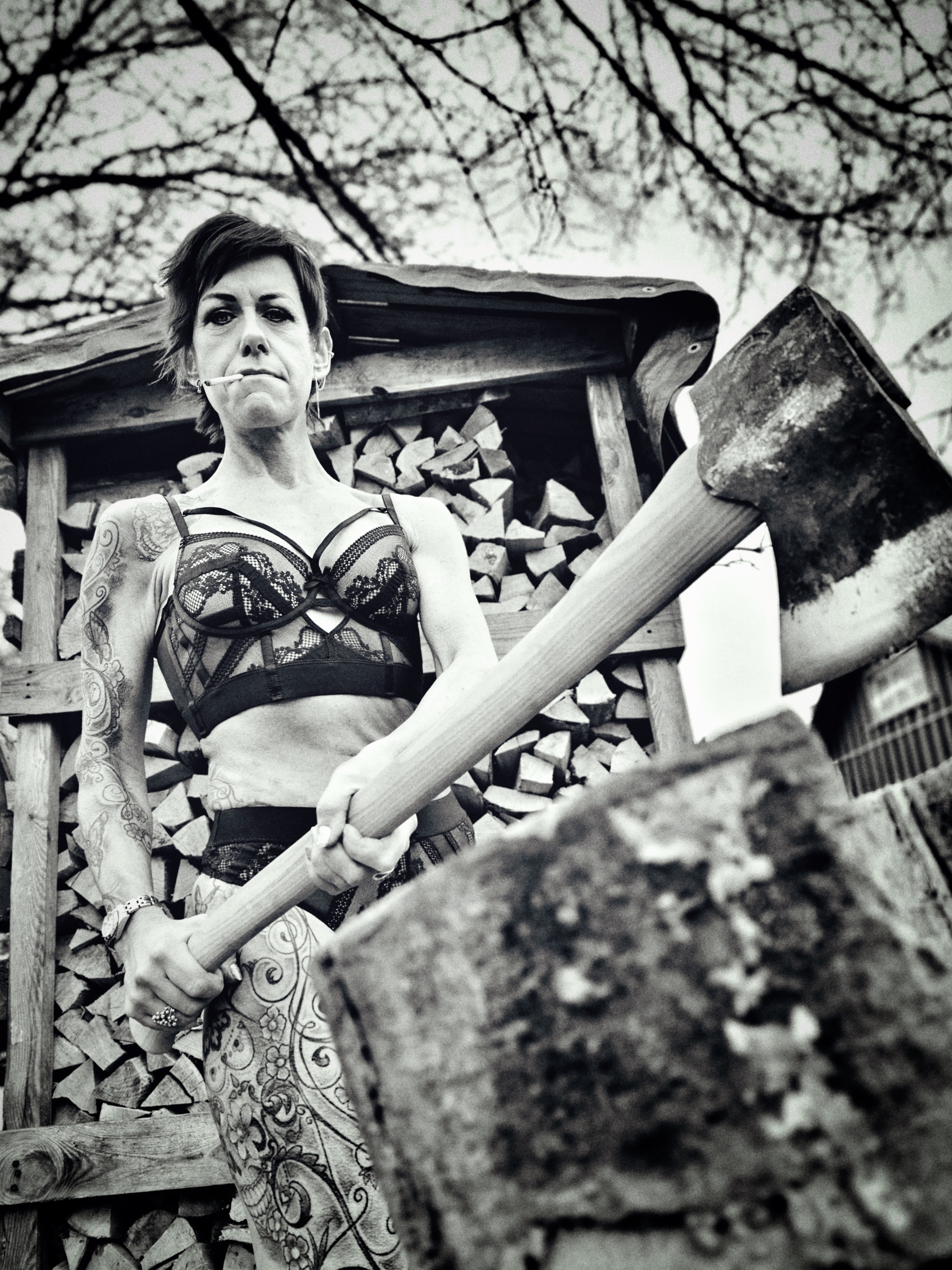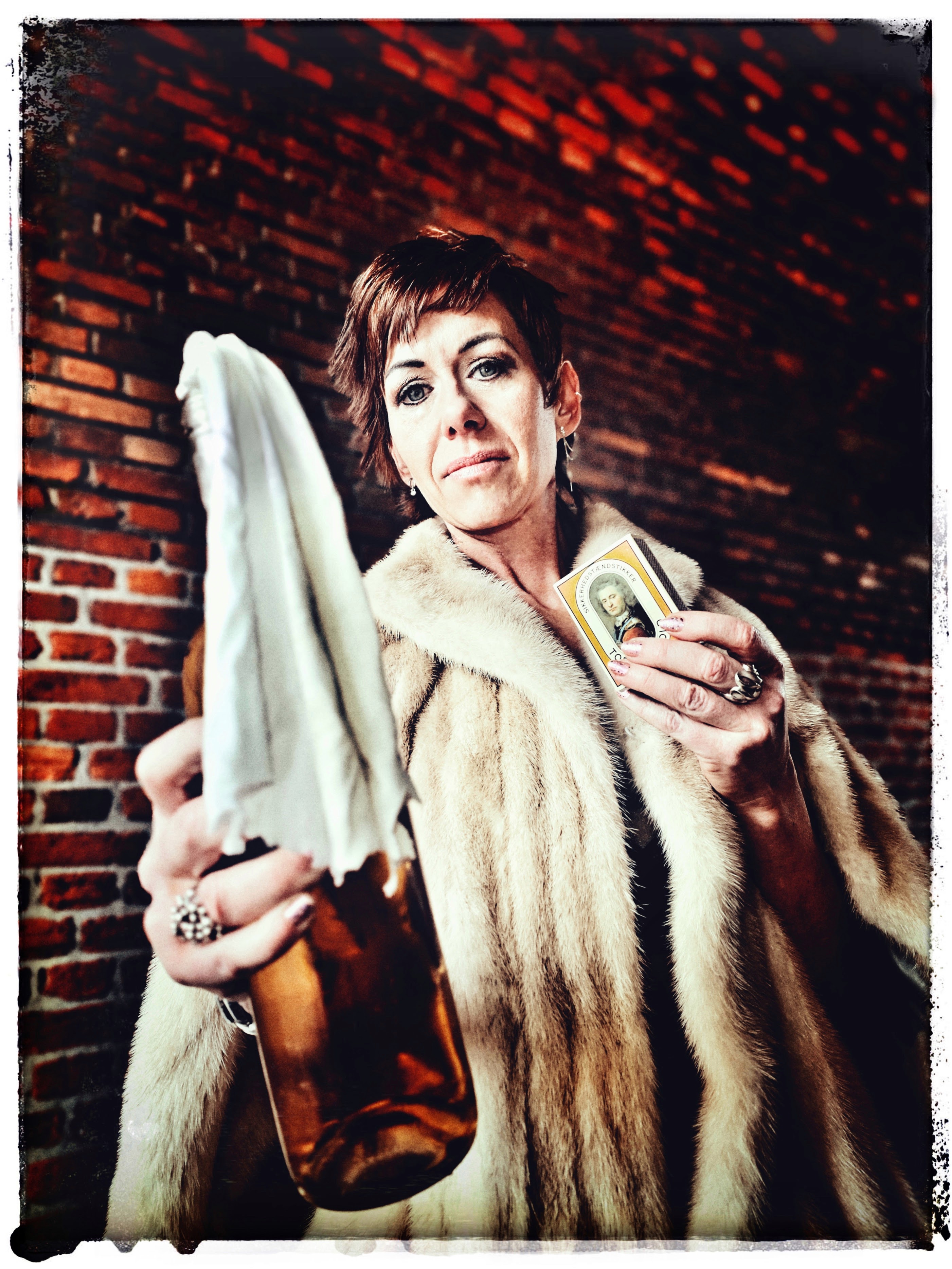 Vi var en lille-bitte smule nervøse under shootet: Én ting er at stå og svinge med en kæmpeøkse iført lingerie i Ballonparken på det gamle Islands Brygge, noget andet er at stå i en tunnelindgang og svinge med en brændende molotov-cocktail — skråt over for Politskolen!