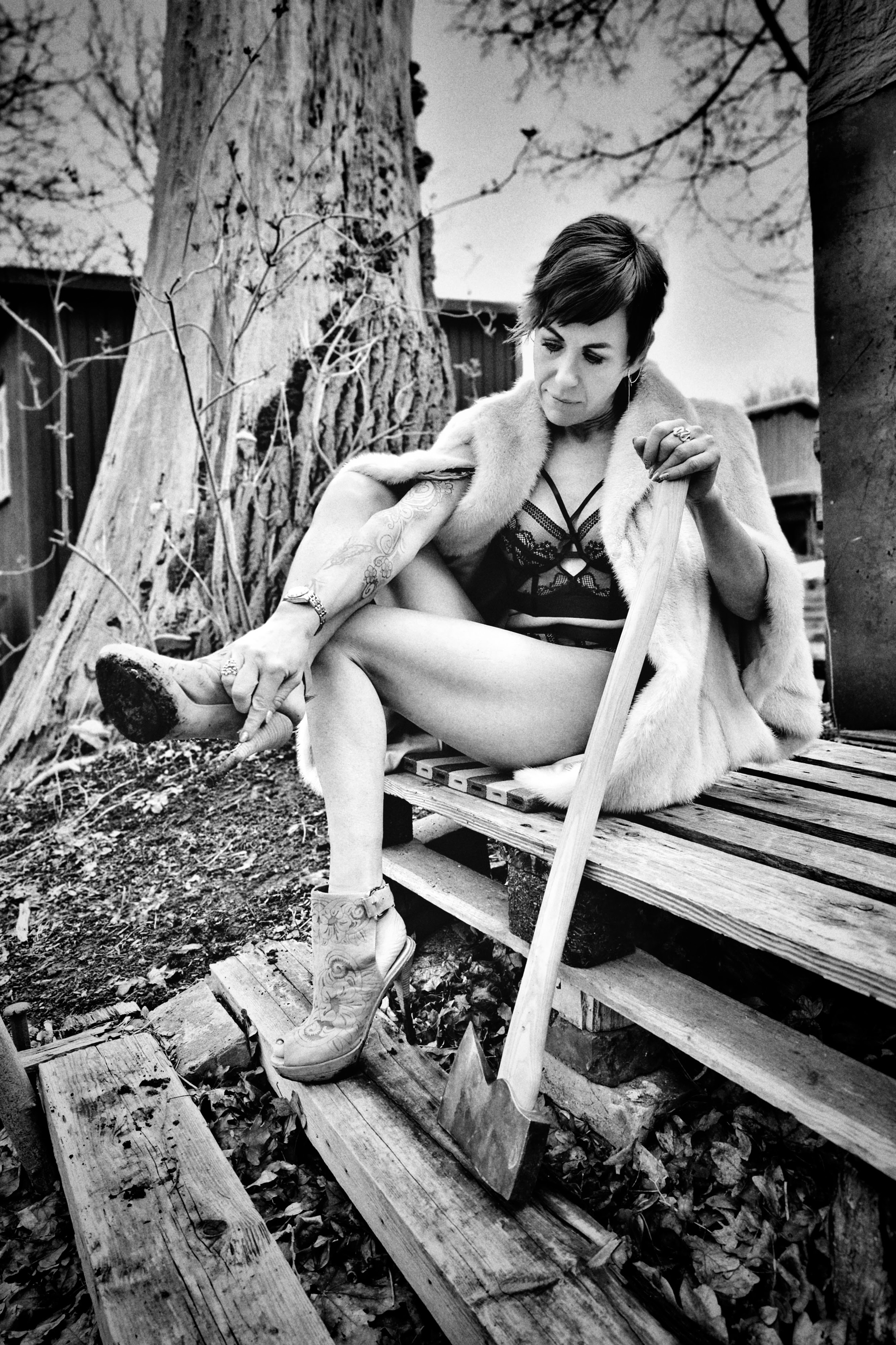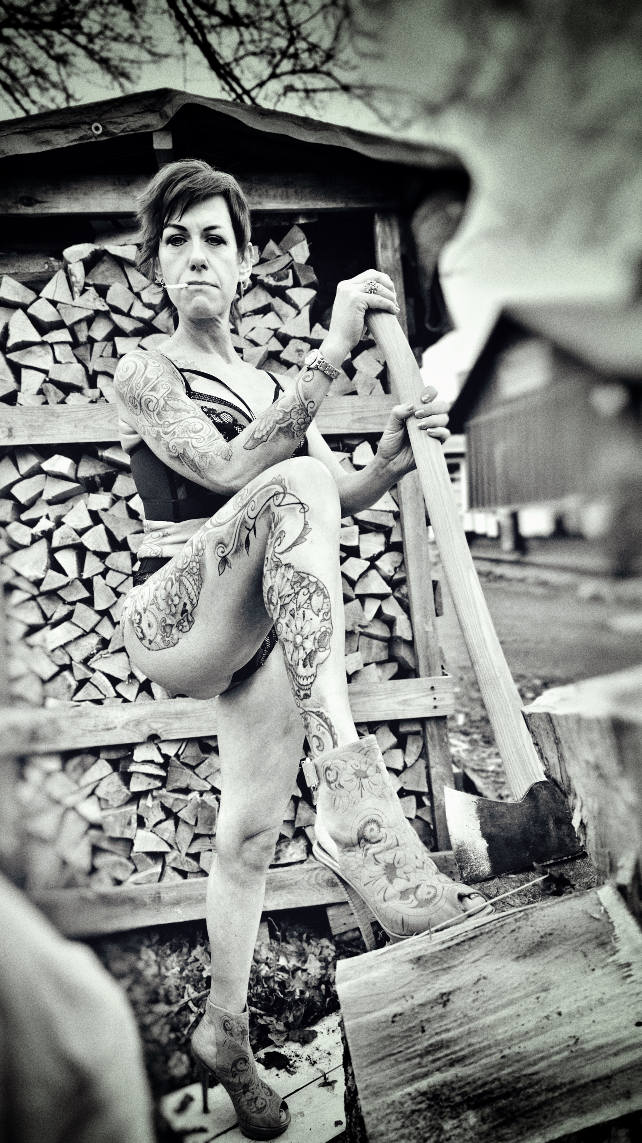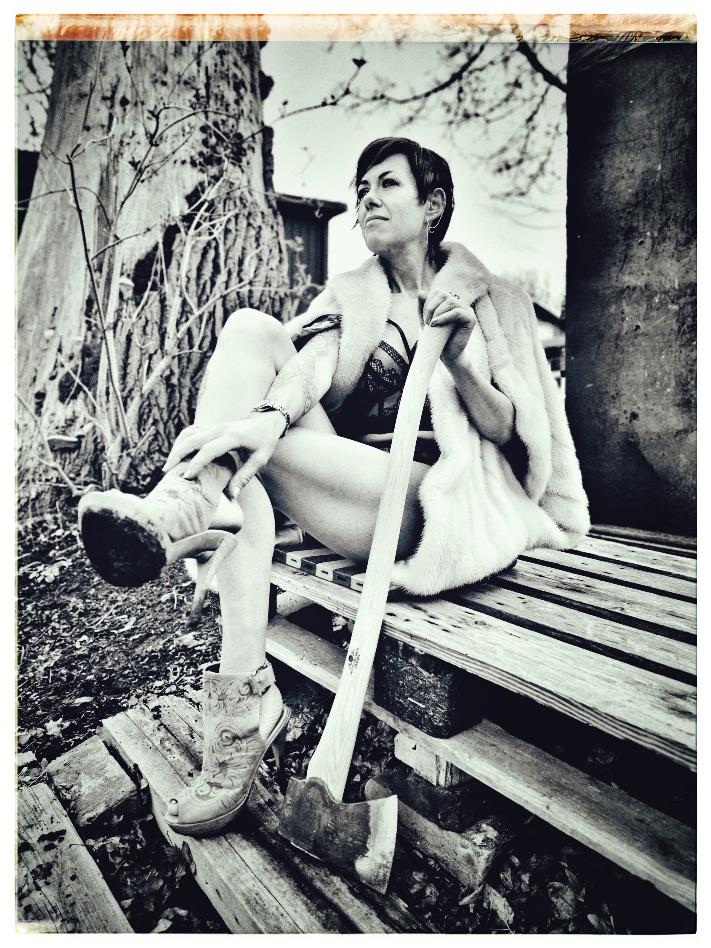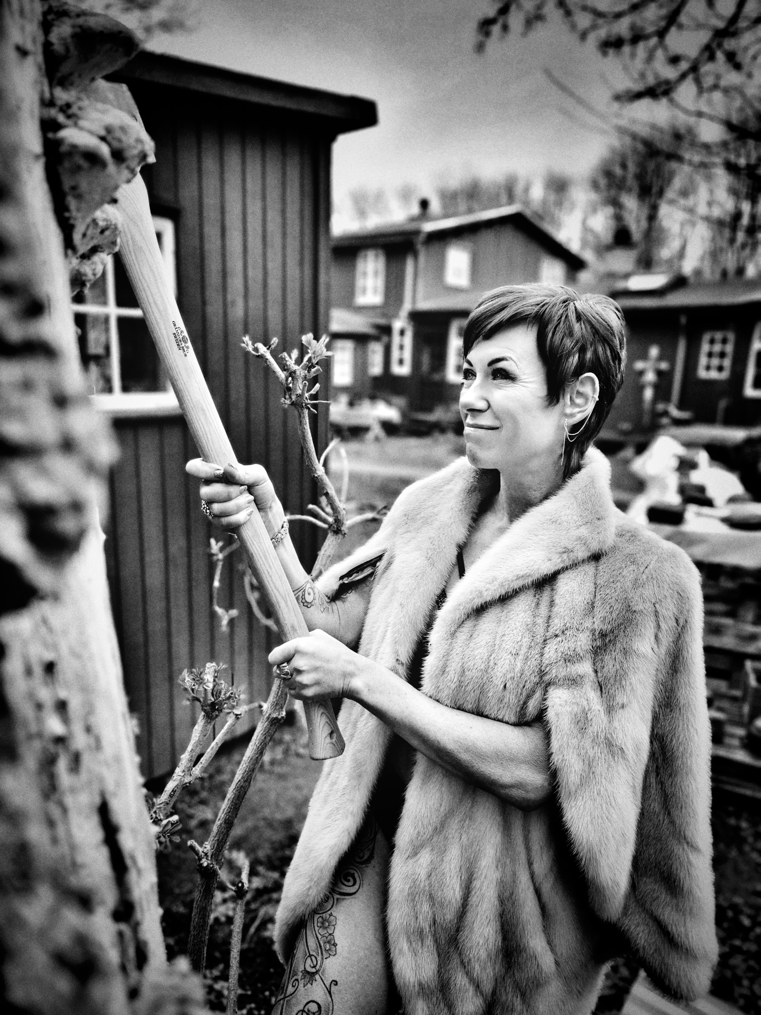 Vi var en lille-bitte smule nervøse under shootet: Én ting er at stå og svinge med en kæmpeøkse iført lingerie i Ballonparken på det gamle Islands Brygge, noget andet er at stå i en tunnelindgang og svinge med en brændende molotov-cocktail — skråt over for Politskolen!