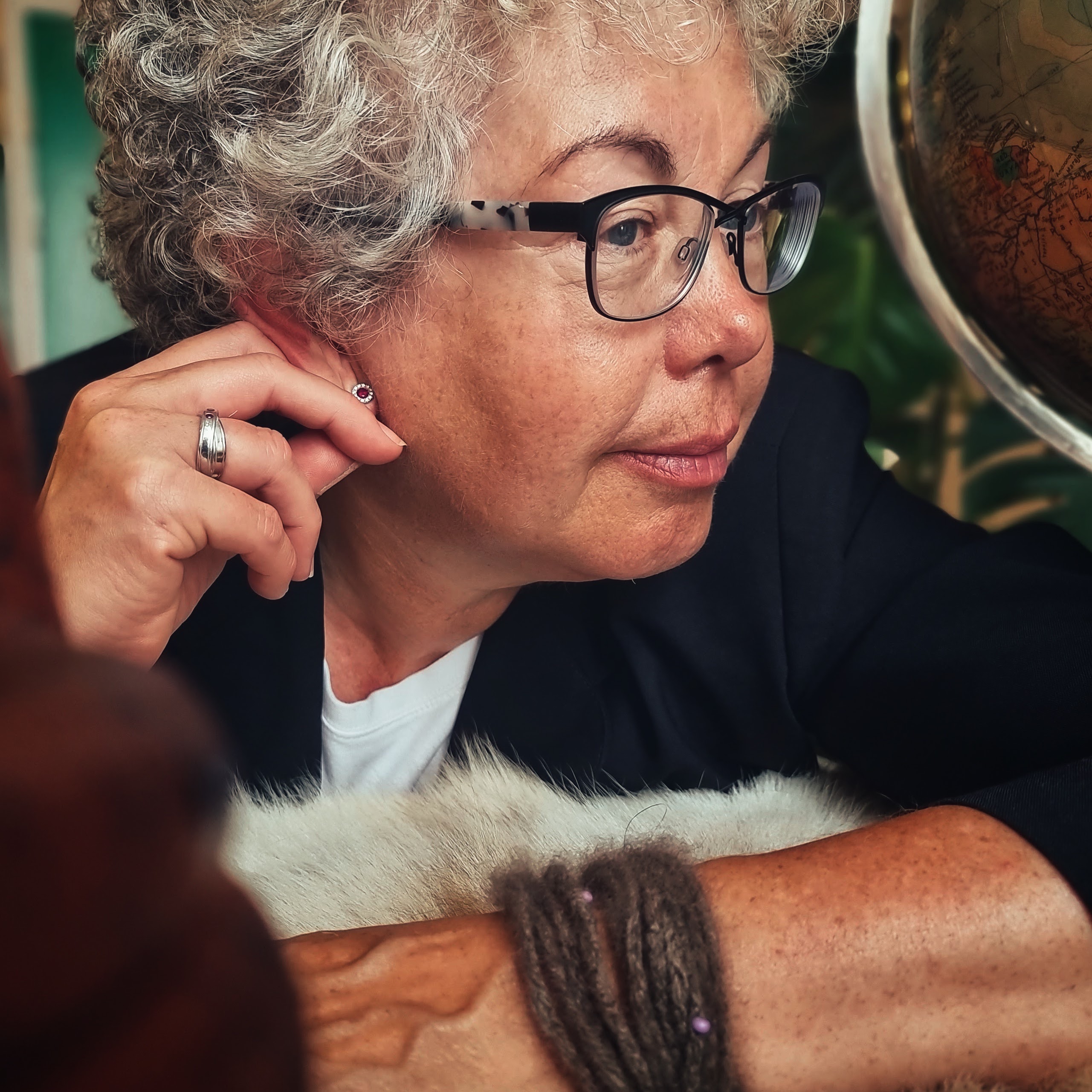 Vi fik også fokus på armbåndet, der er fra Grønland og er fremstillet af moskusokseuld. Ulden finder man siddende i grene og buske fra de store dyr. Ringen er Hanne og hendes mands vielsesringe sat sammen med tre grønlandske rubiner for tro, håb og kærlighed.