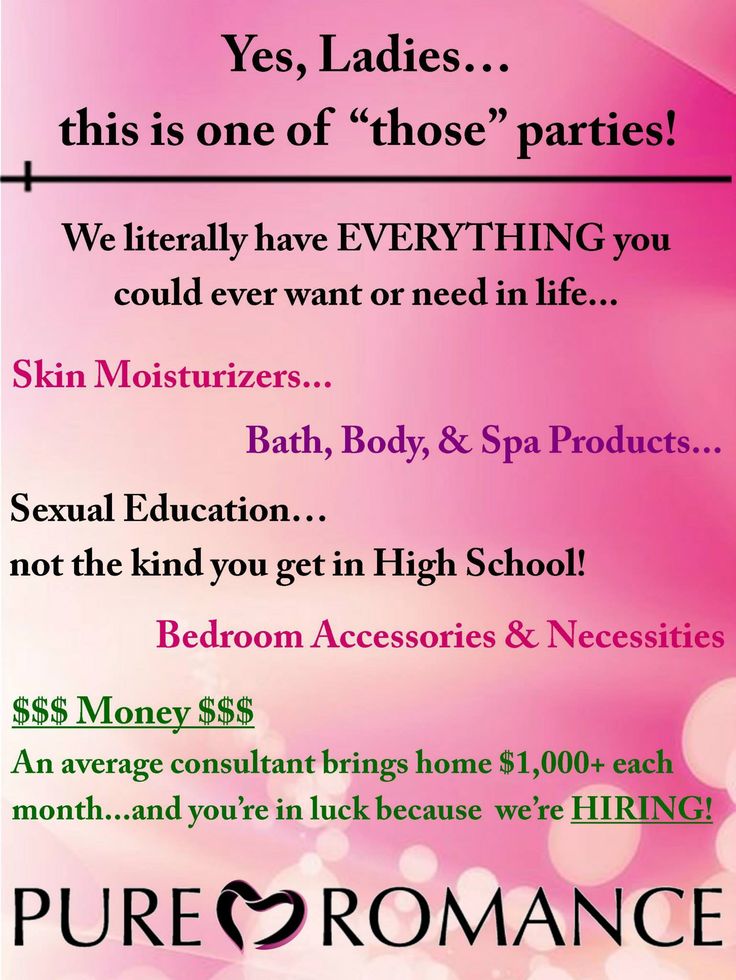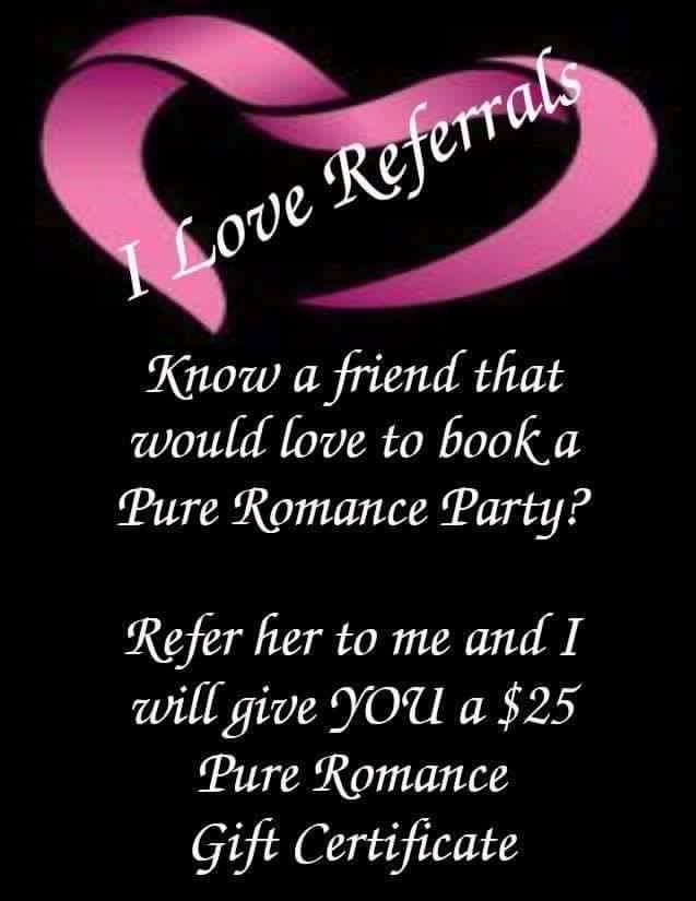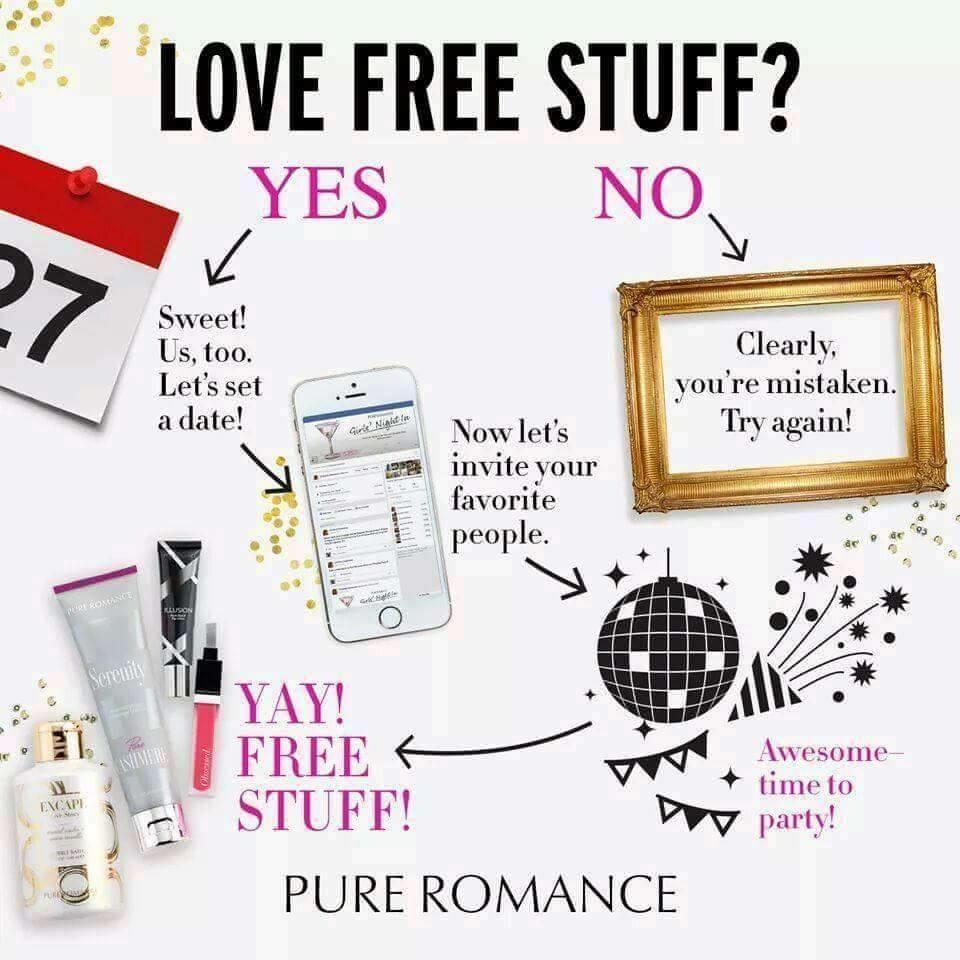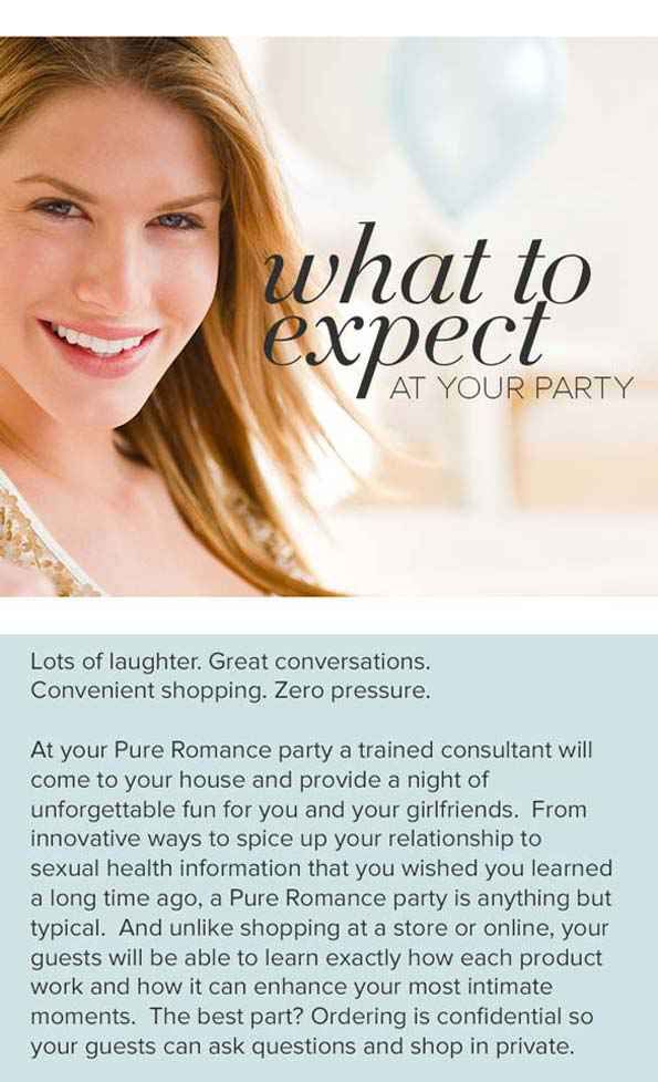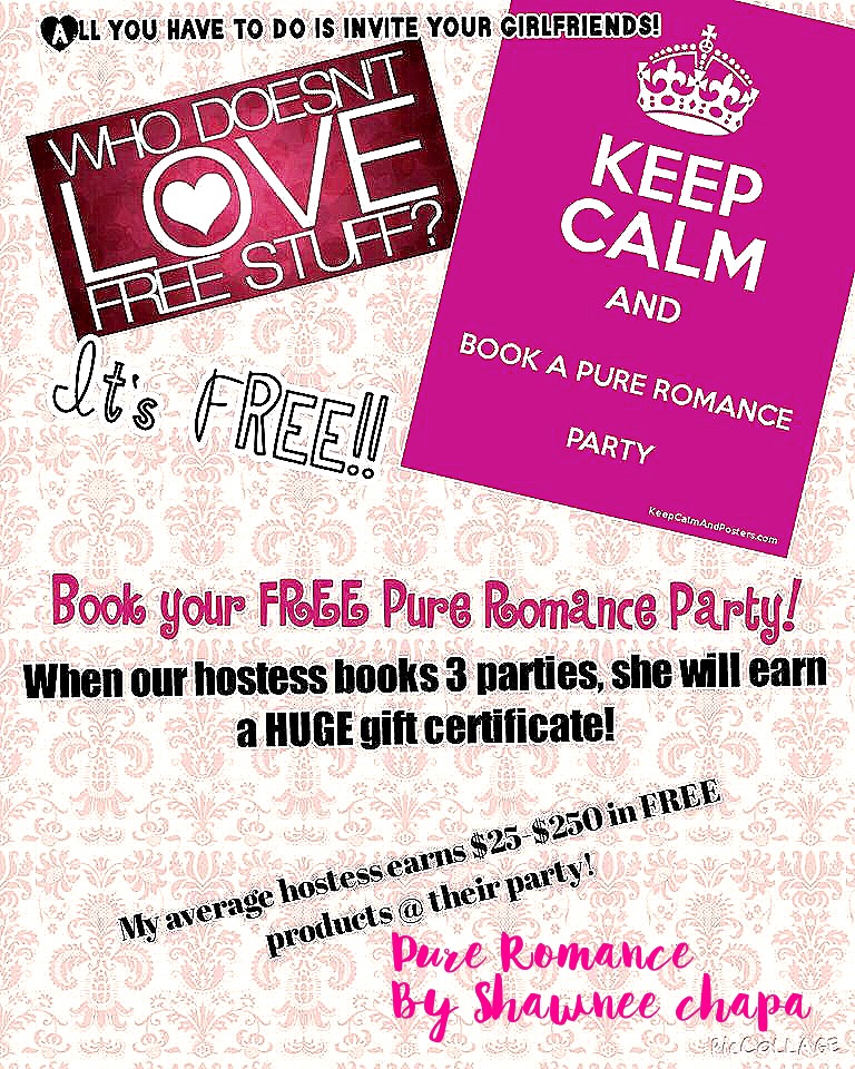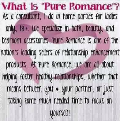 What a pure romance party is: Me (Shawnee Chapa) will come into your home or wherever you want to have your party at and I'll show you various products we pure romance has to offer! You will get to taste smell and sample most of our top selling products! You can invite as many people you want, small or big parties; you decide. You can set out some snacks for your girlfriends and some wine if you prefer. We play a couple games that give you and your guest a chance to win a prize! It's a fun girls night in for you and your guest!!