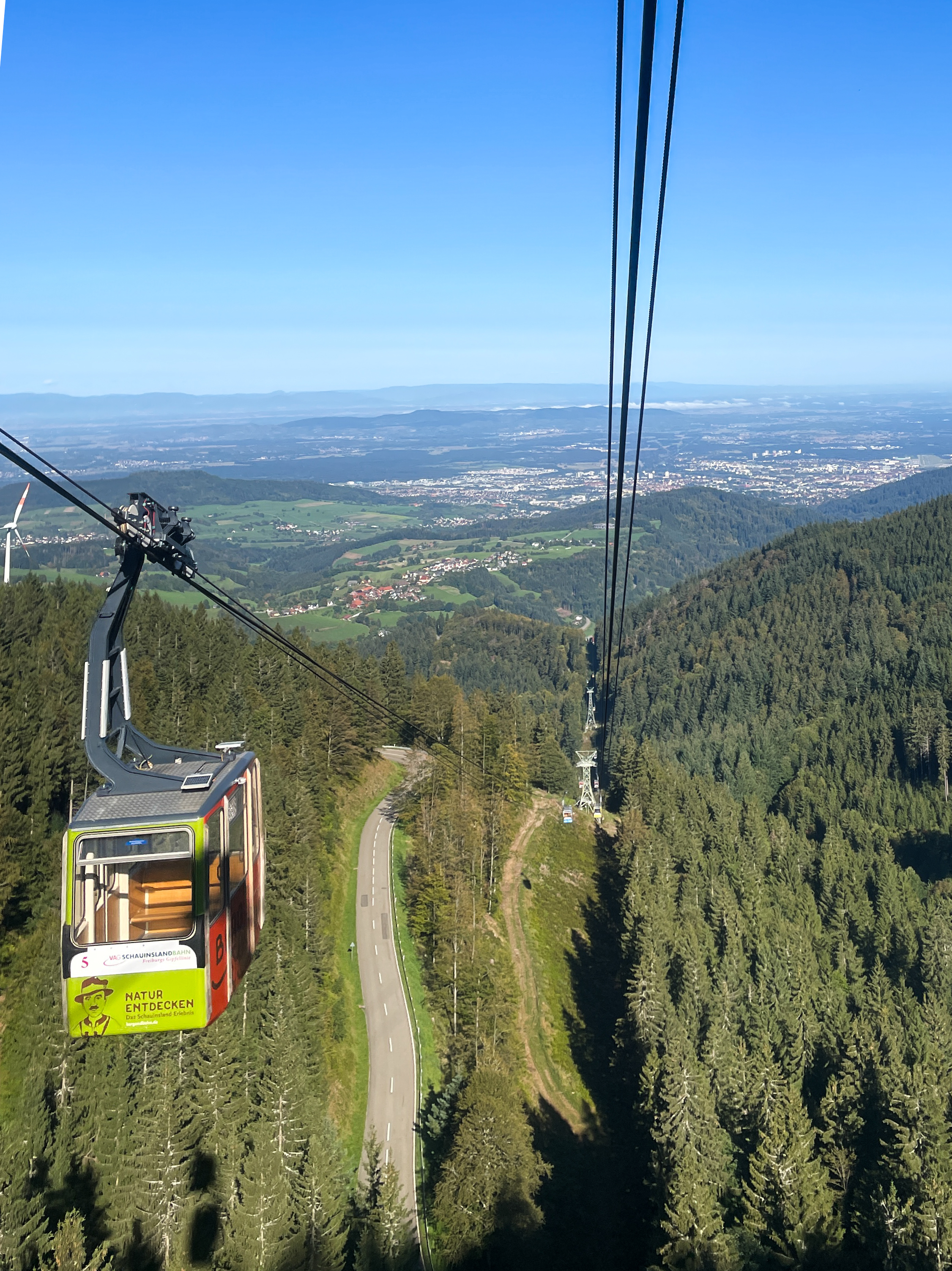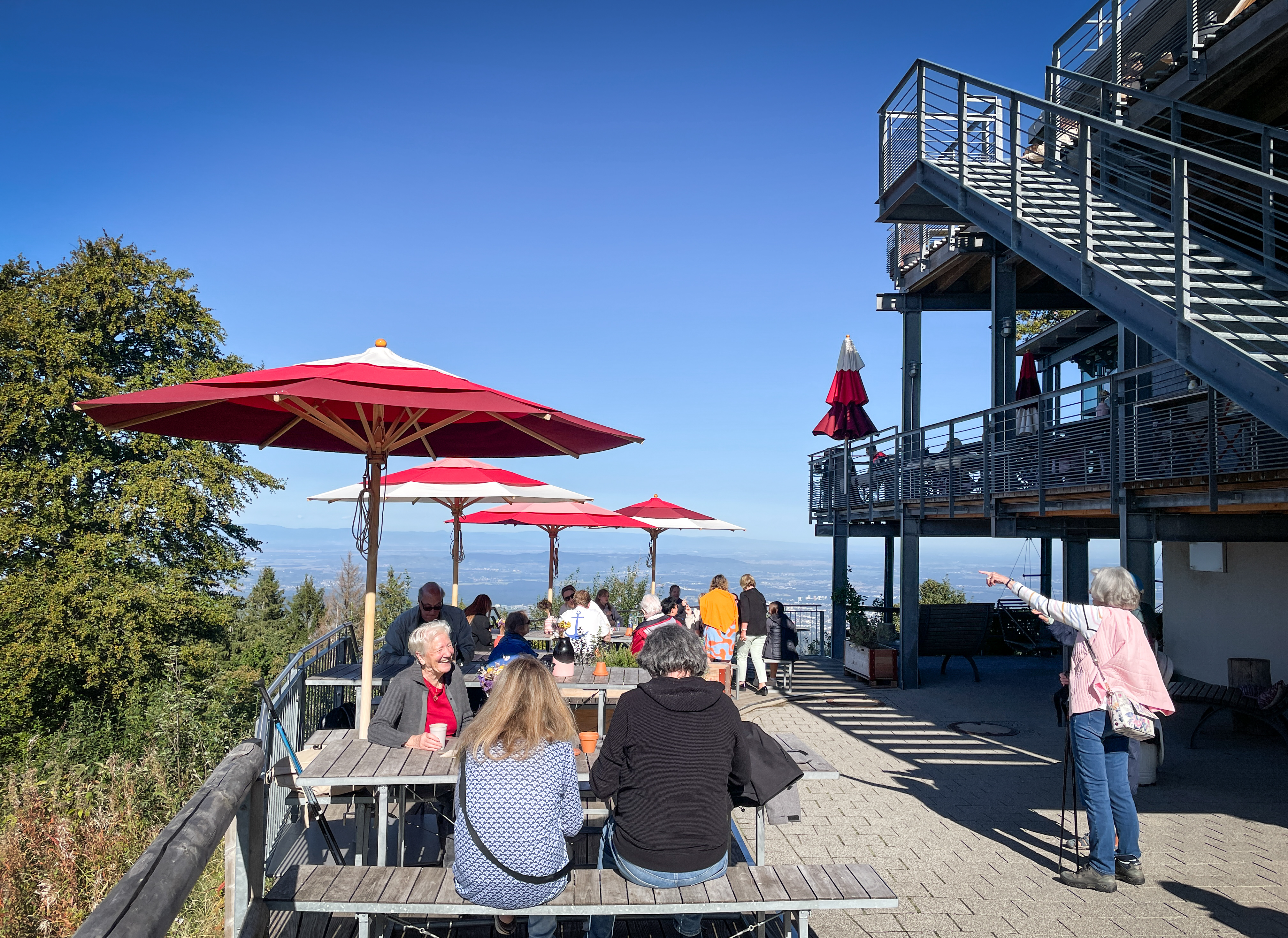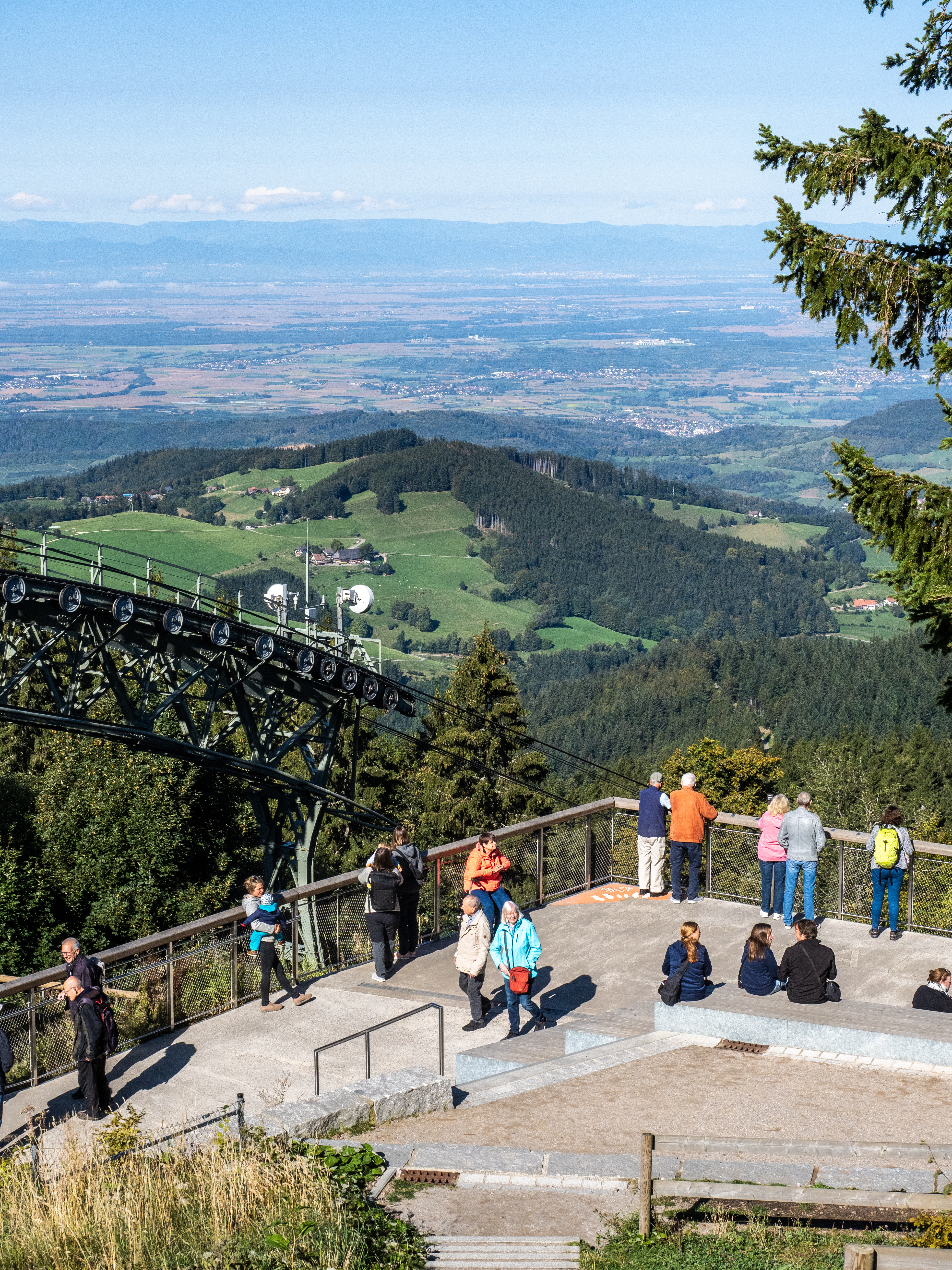 Schauinsland is a mountain area in the Black Forest about an hour’s journey south of Freiburg. We took the cable car to reach the summit, but others had driven or even cycled up the very twisty road. The weather could not have been better and we could see the Vosges mountains and Alsace across the Rhine valley to the west. To the east, we looked over the Black Forest range.