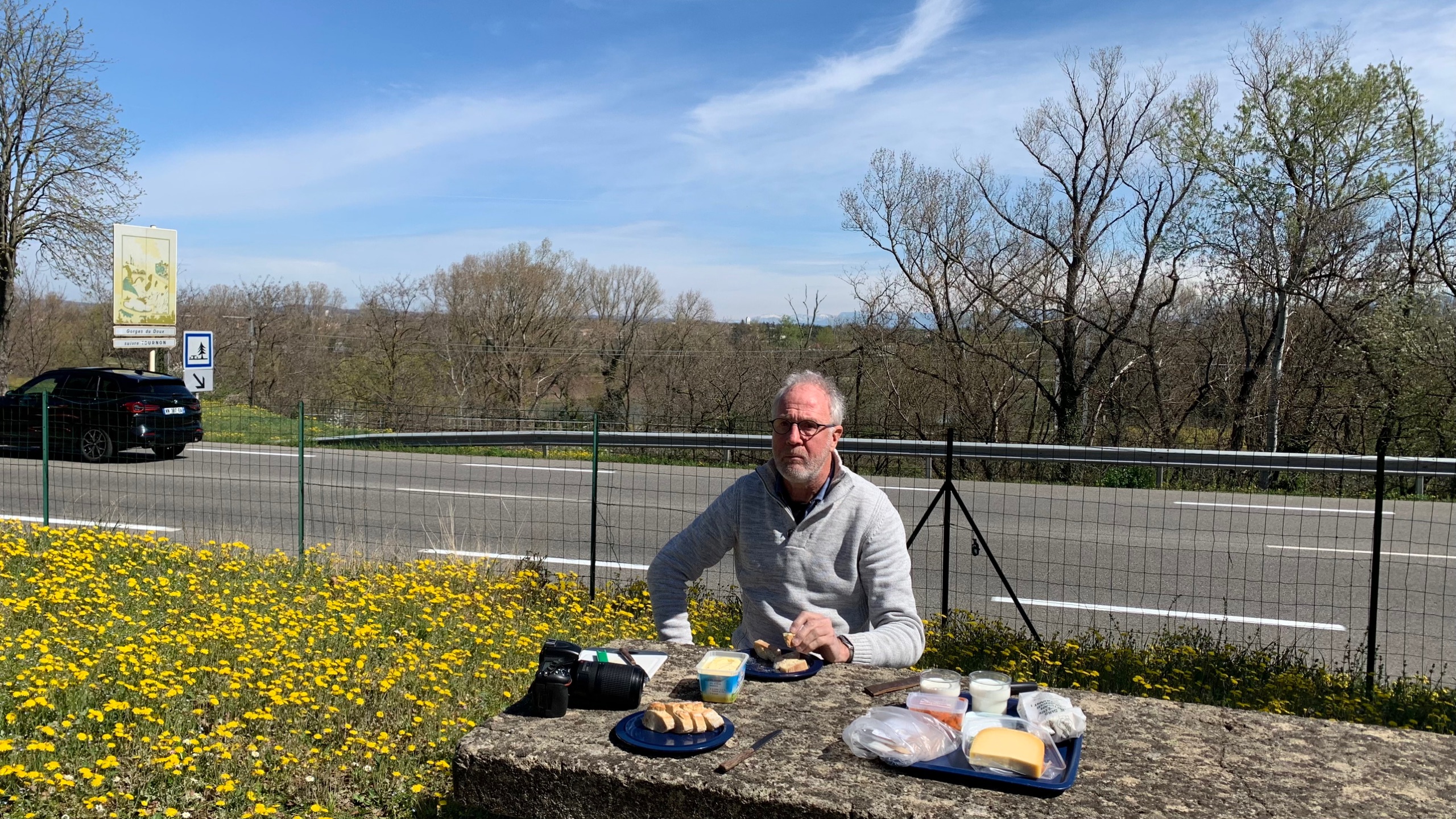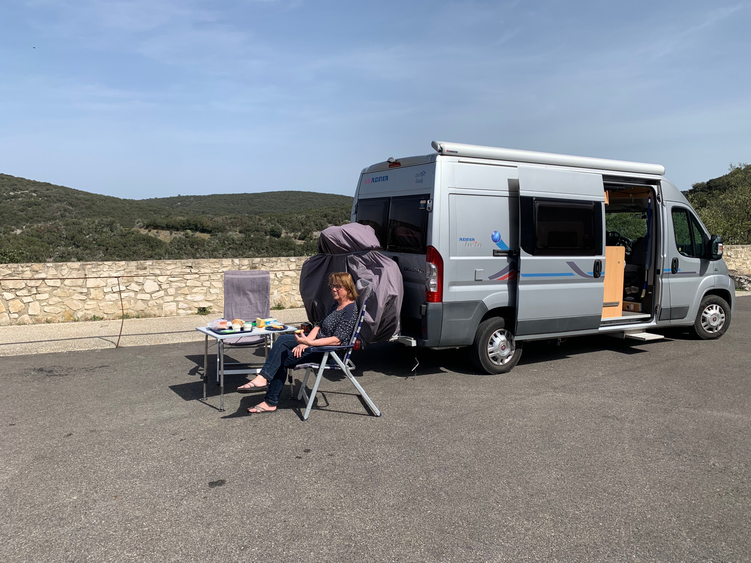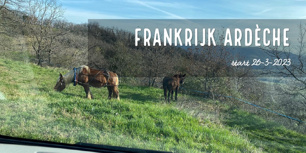 We rijden een stukje verder. Onderweg lunchen met zicht op de sneeuwtoppen. Lekker buiten in het zonnetje. Dan naar Privas. Heerlijk rustig zo in het voorseizoen. Hierna rijden we naar ons plekje om te overnachten. Weer prachtig uitzicht , een France Passion plek in Freyssenet. Heerlijk, buiten in de zon!!