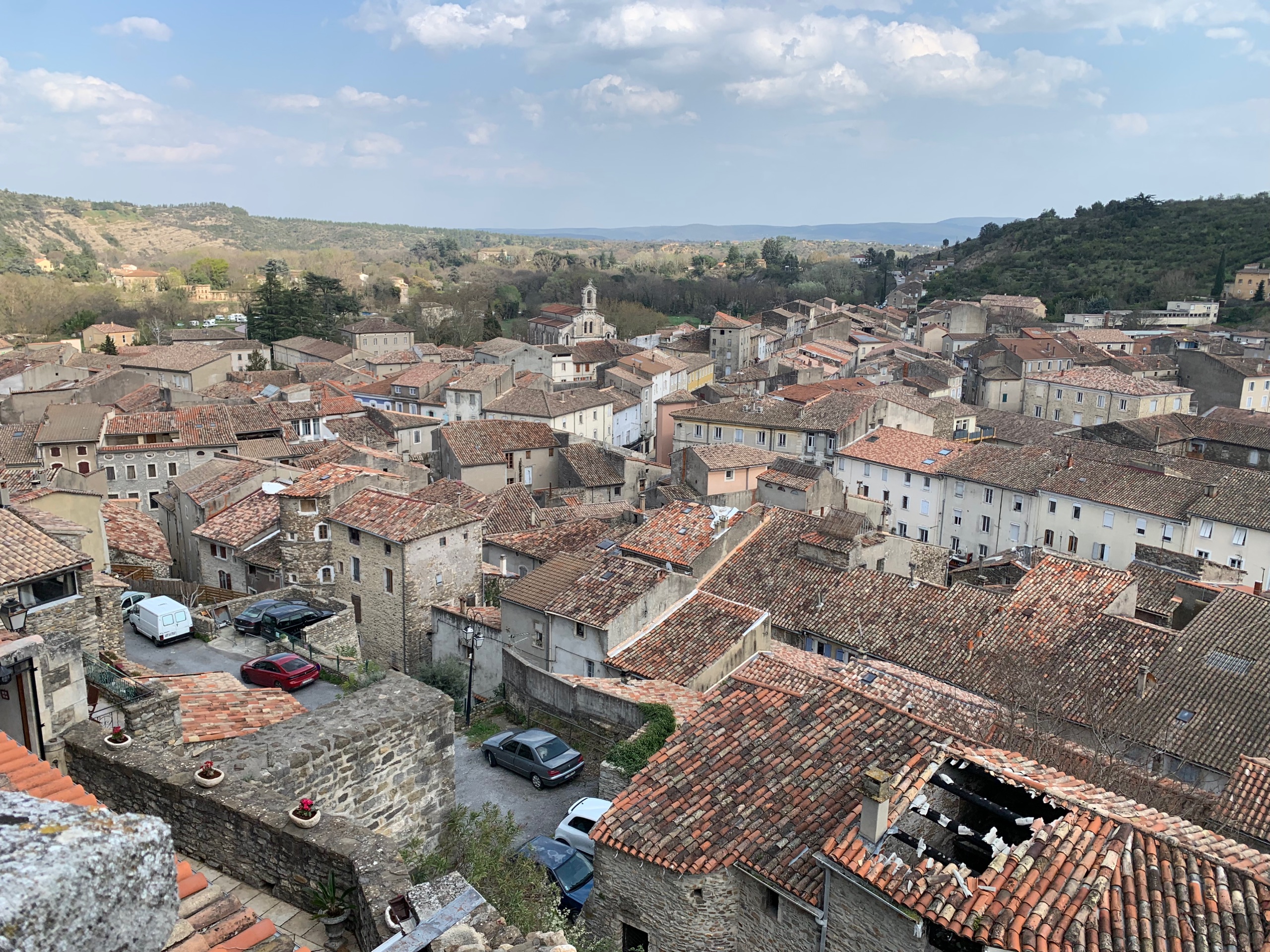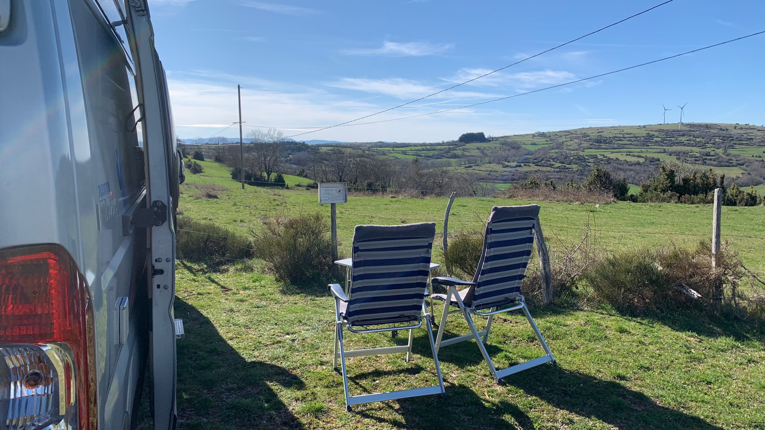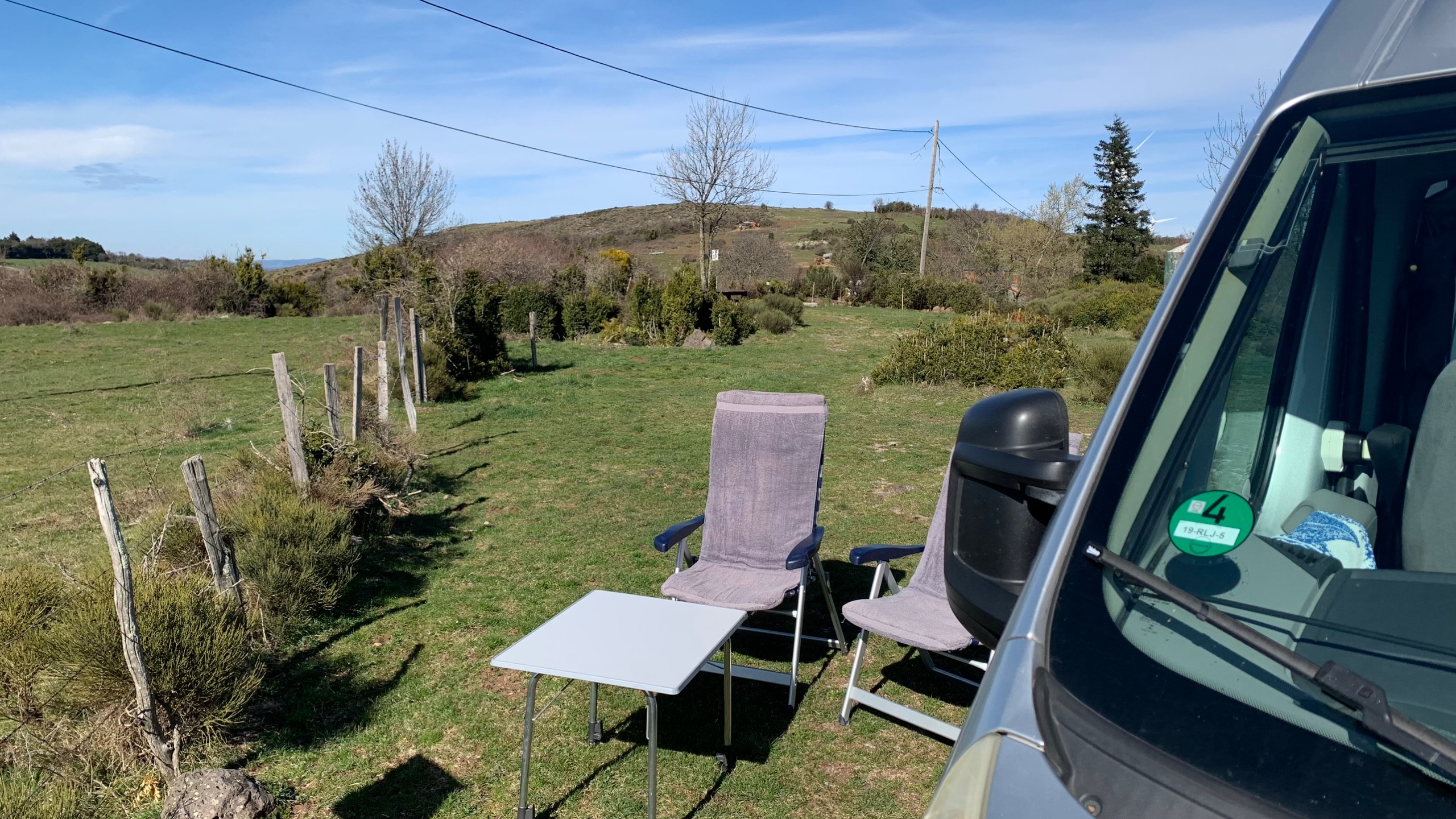 We rijden een stukje verder. Onderweg lunchen met zicht op de sneeuwtoppen. Lekker buiten in het zonnetje. Dan naar Privas. Heerlijk rustig zo in het voorseizoen. Hierna rijden we naar ons plekje om te overnachten. Weer prachtig uitzicht , een France Passion plek in Freyssenet. Heerlijk, buiten in de zon!!