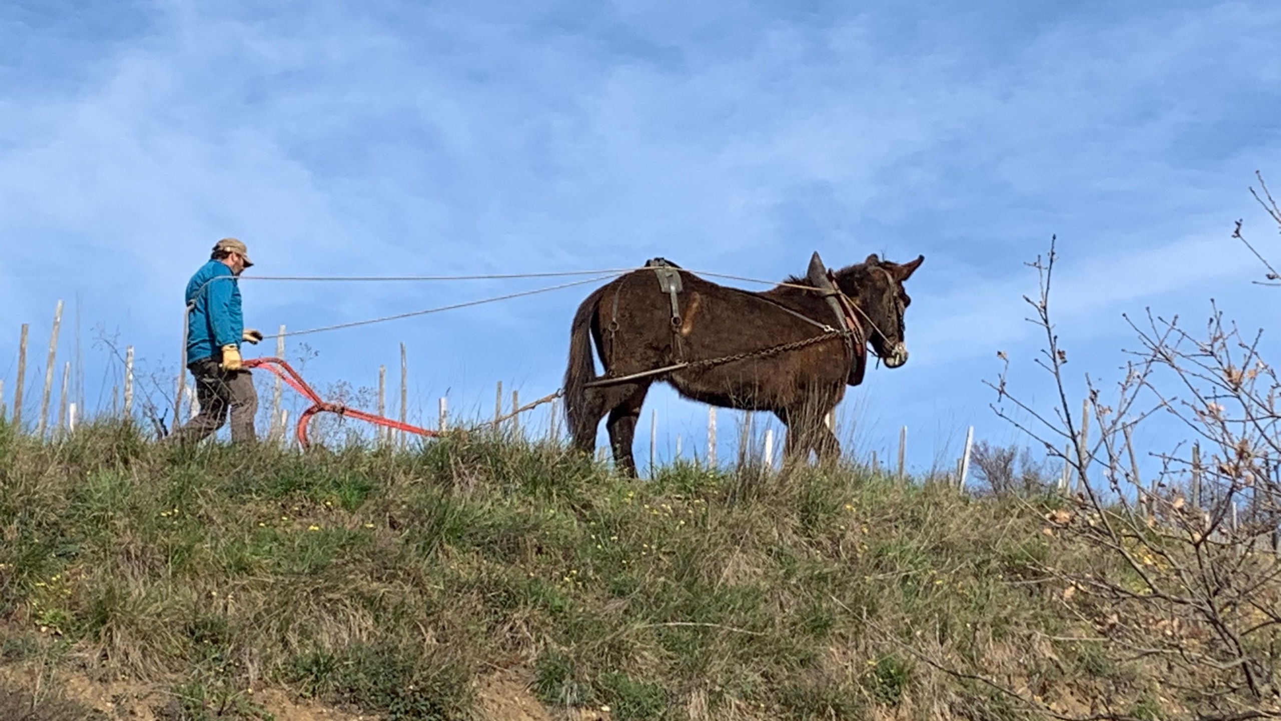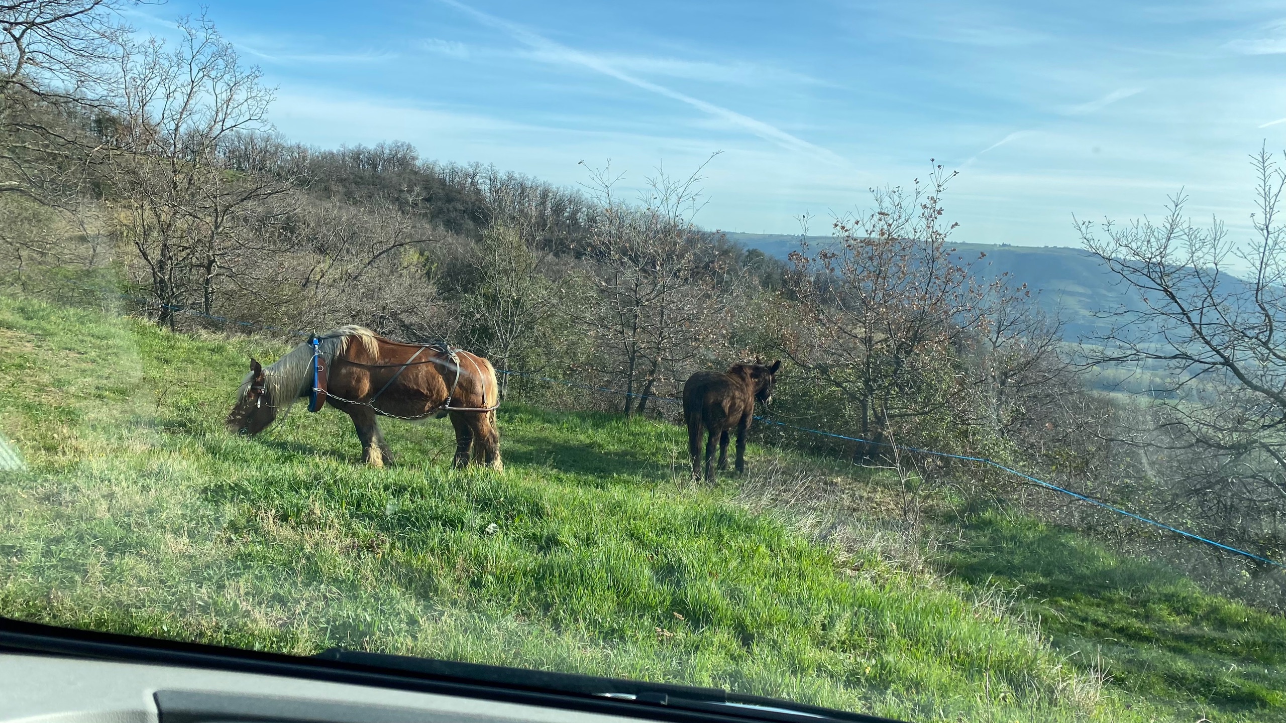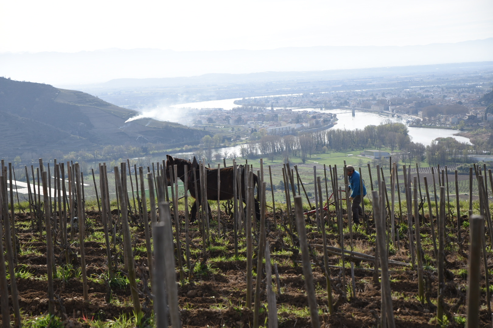 Wat een heerlijk weer en nog steeds mooi uitzicht. We staan bij een wijnboer die nog op de traditionele manier wijn maakt. Vanmorgen werd er geploegd met twee paarden tussen de druiven door. Een geduld werkje.