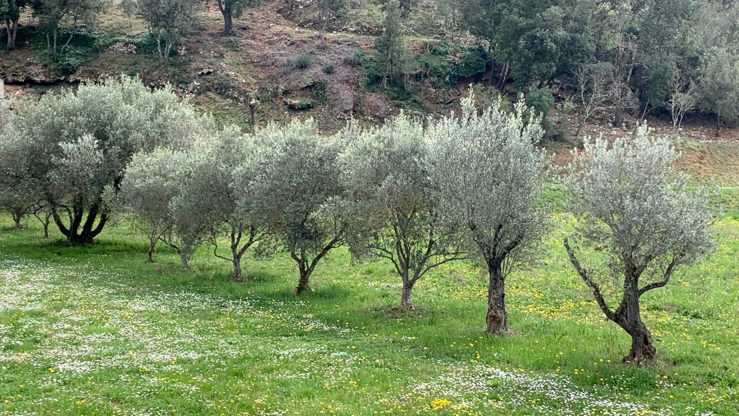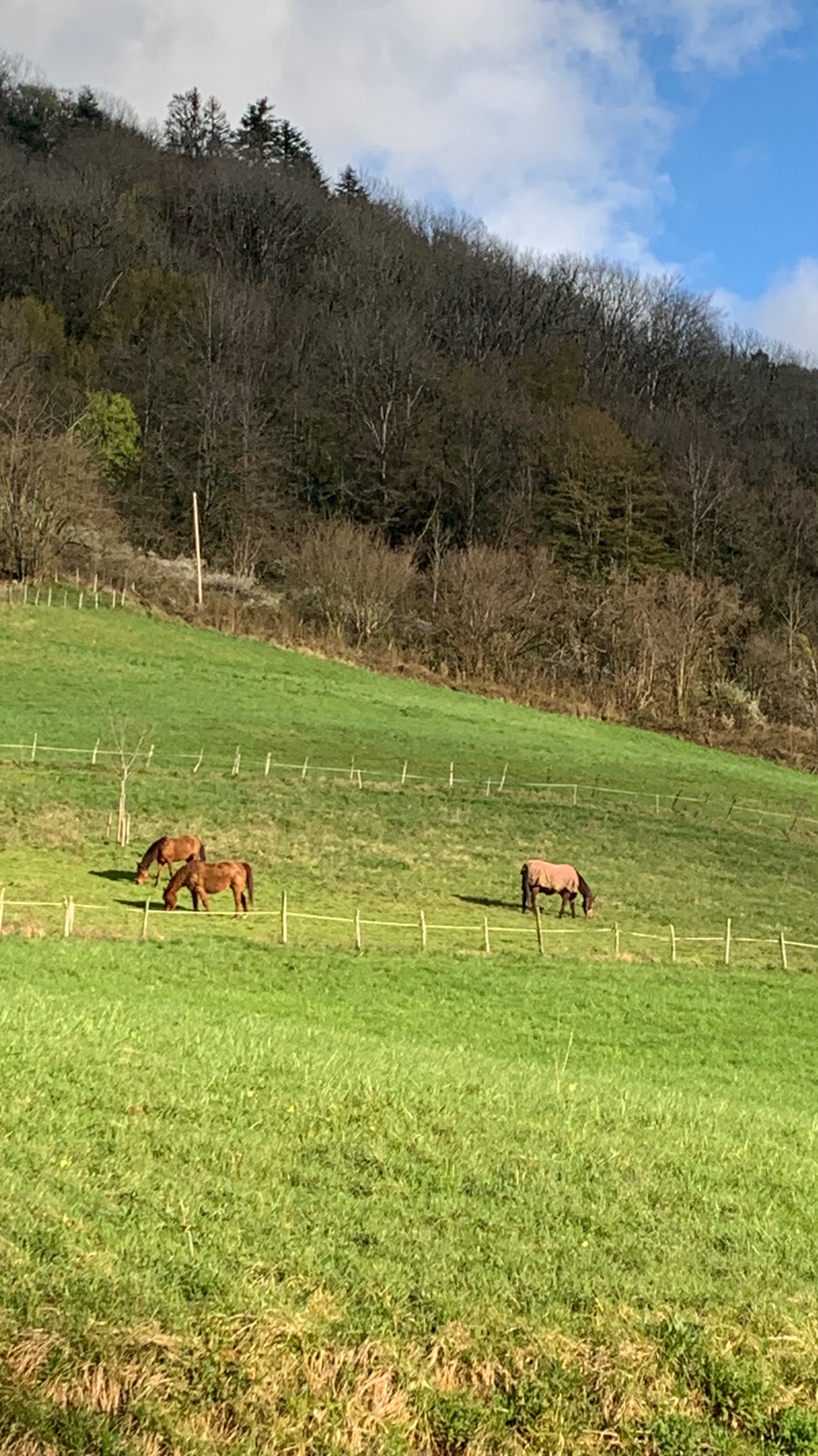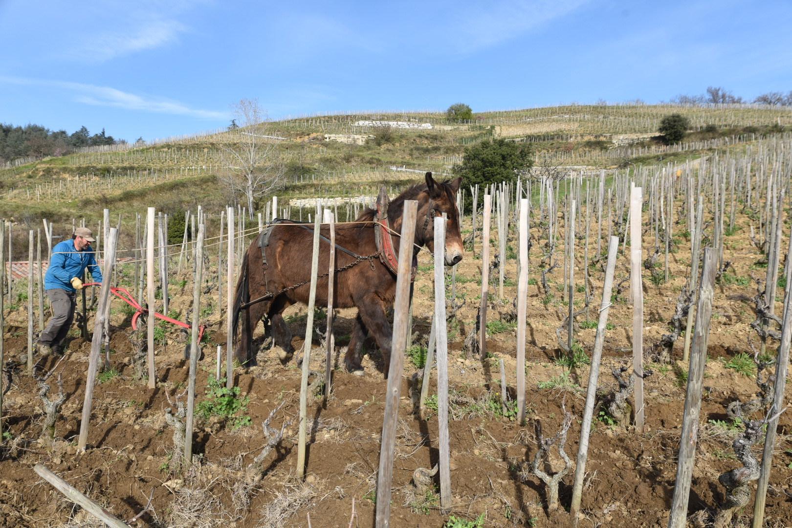 Wat een heerlijk weer en nog steeds mooi uitzicht. We staan bij een wijnboer die nog op de traditionele manier wijn maakt. Vanmorgen werd er geploegd met twee paarden tussen de druiven door. Een geduld werkje.