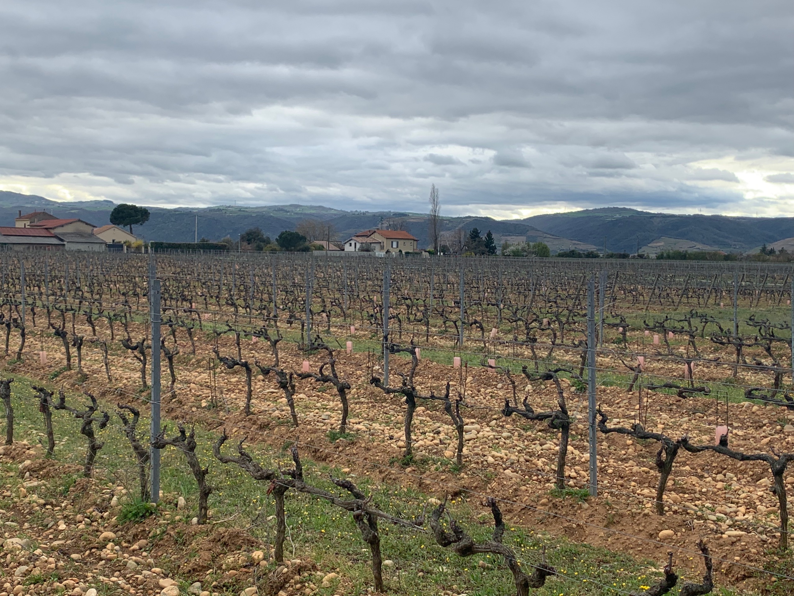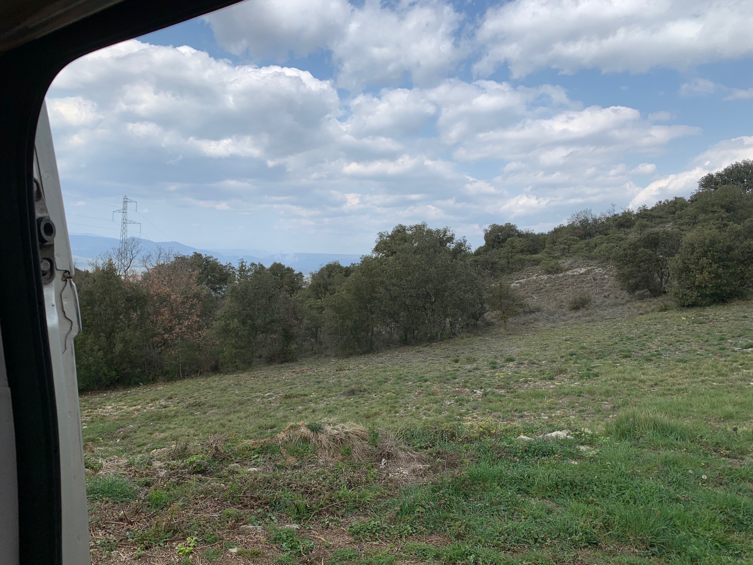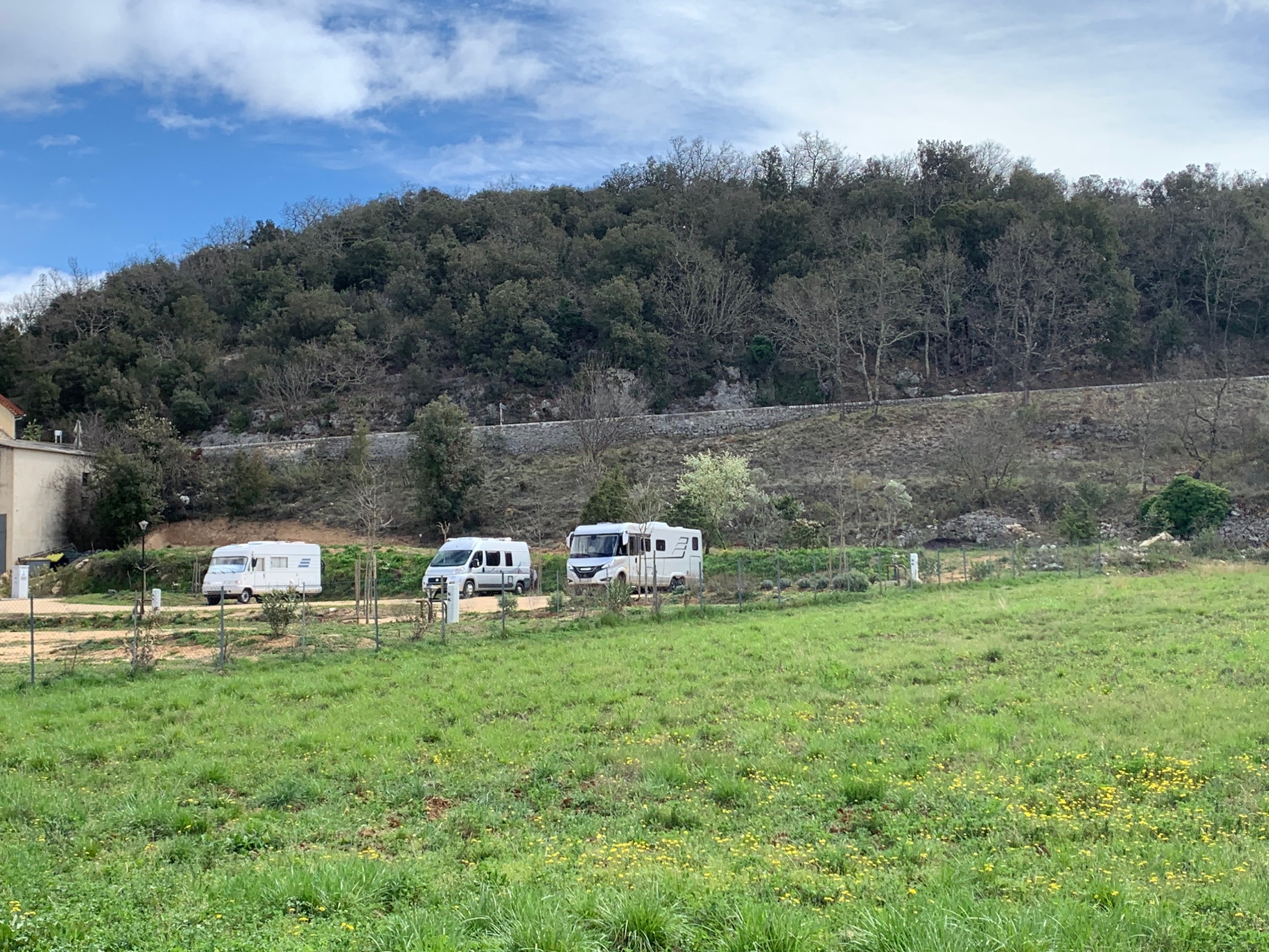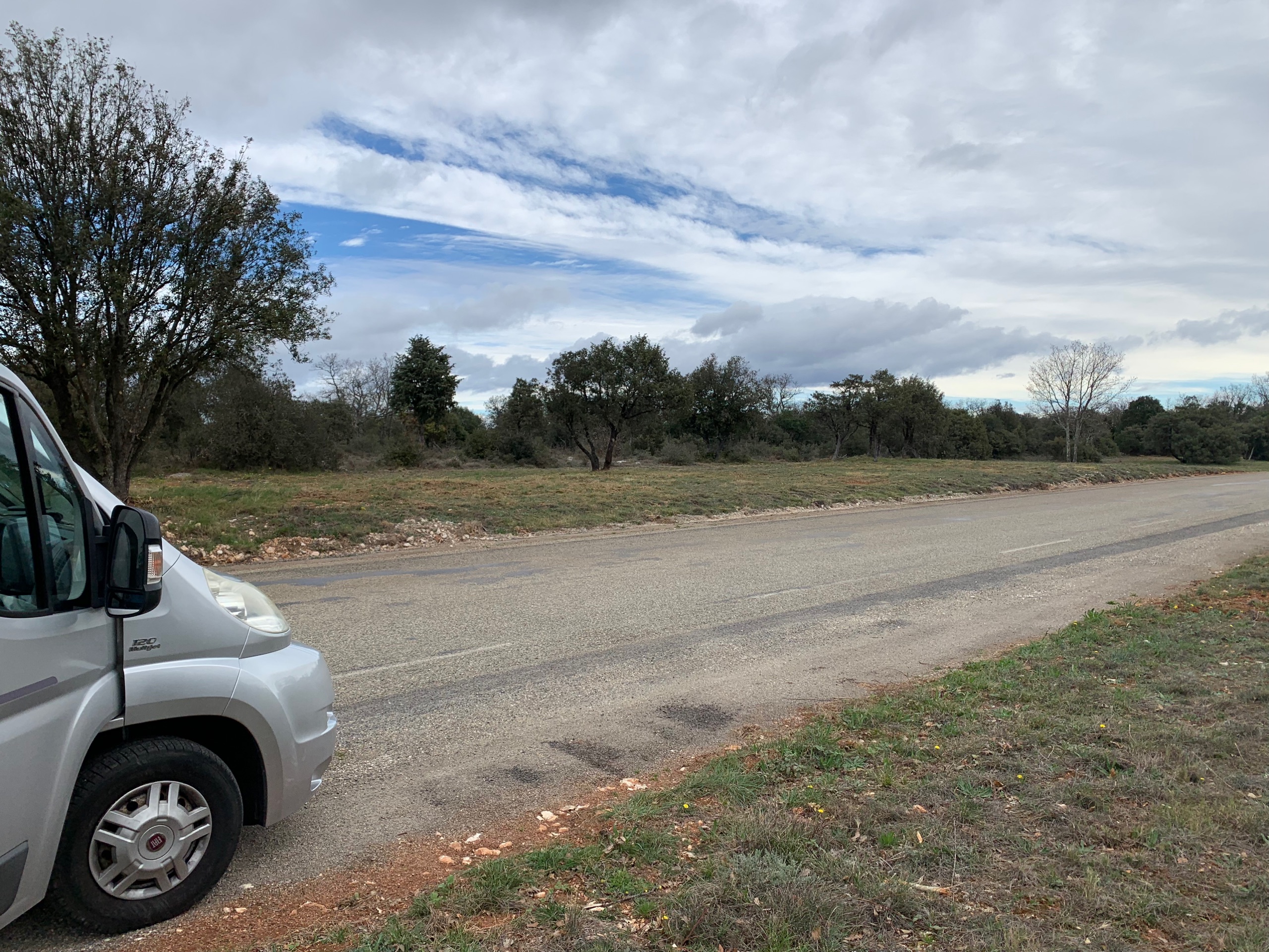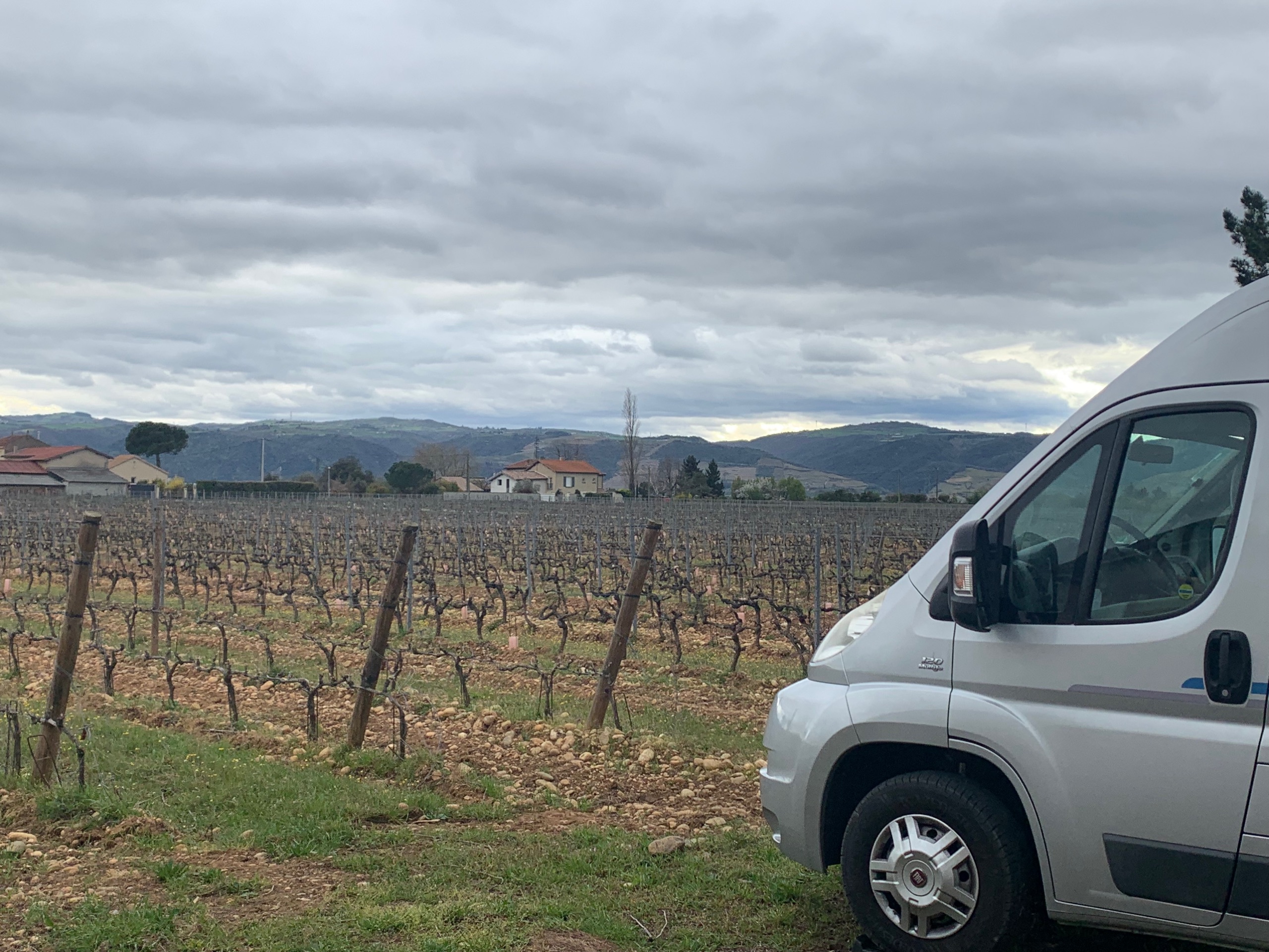 Het is voor nu even koud en somber. Als het goed is komt vanmiddag het zonnetje weer tevoorschijn. We halen een fles wijn van het domein waar we staan en we zetten onze reis voort.