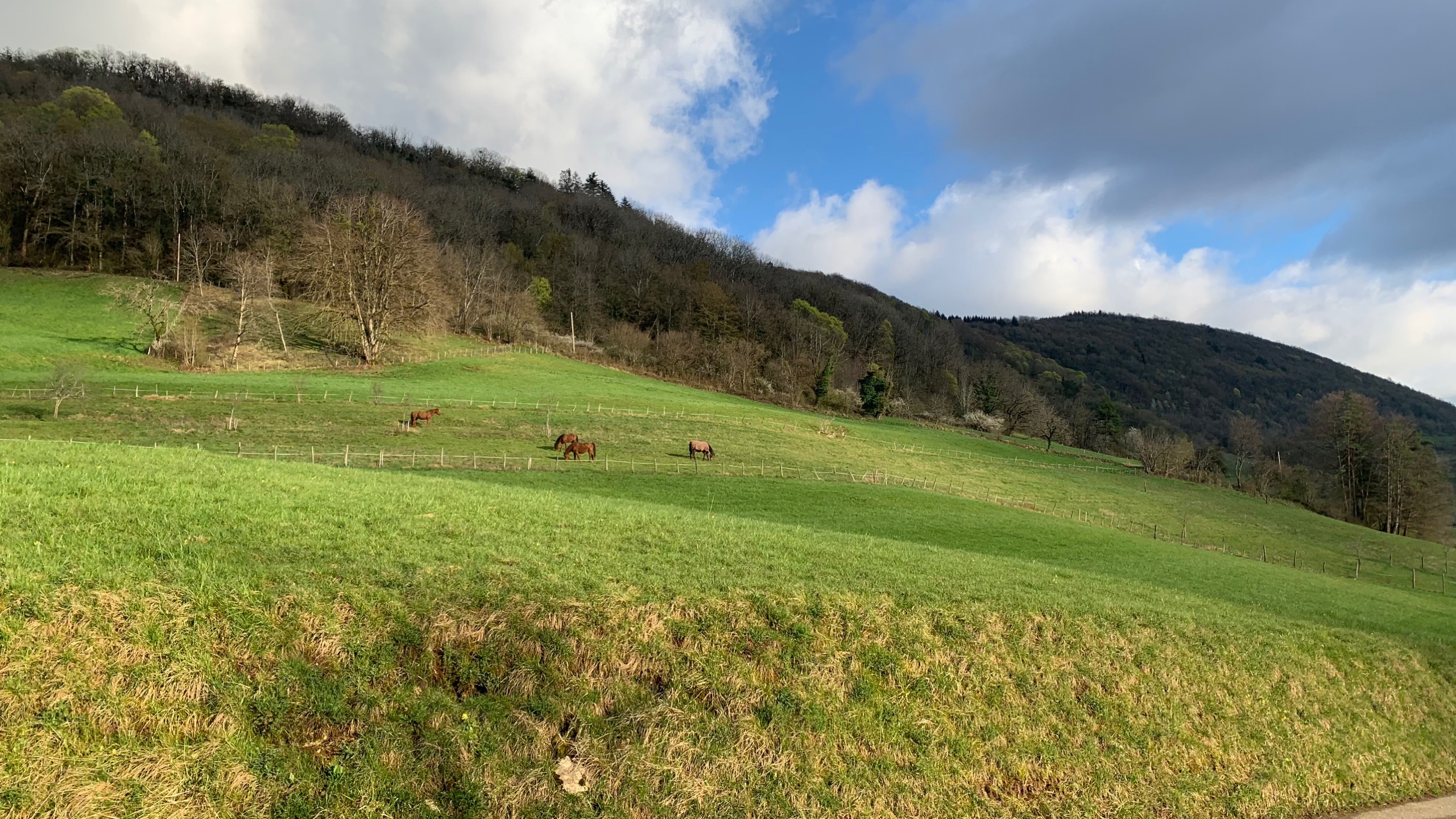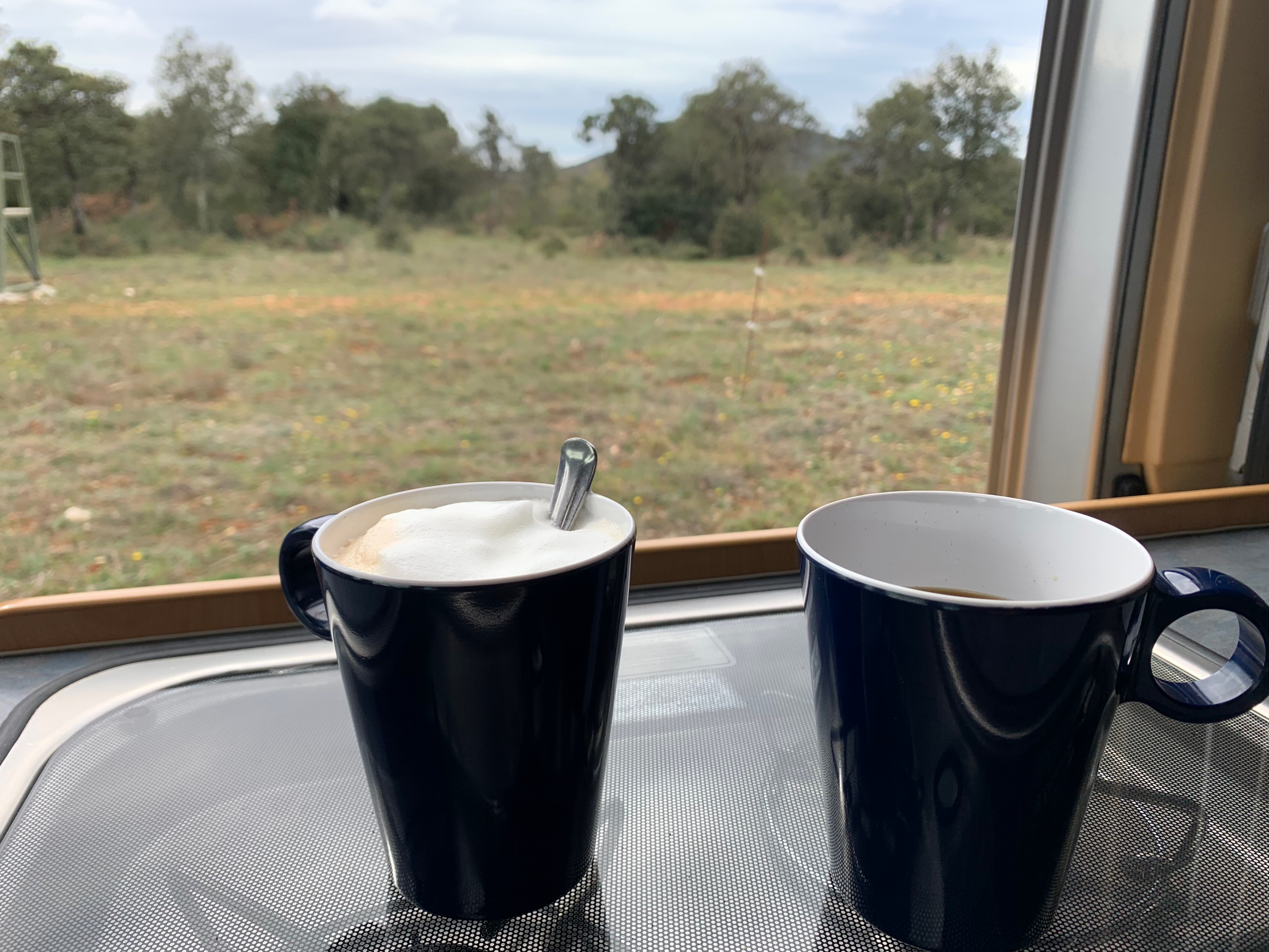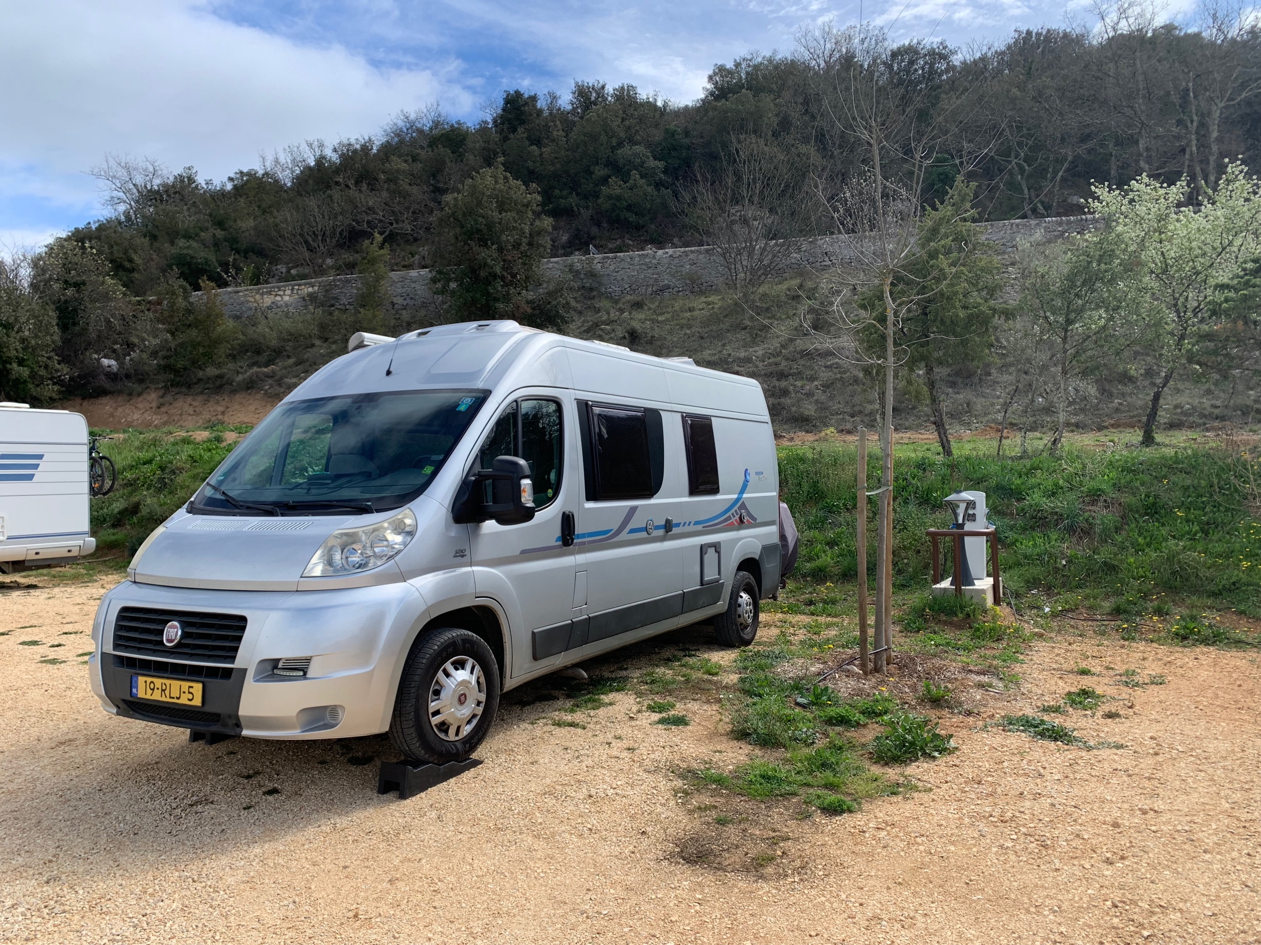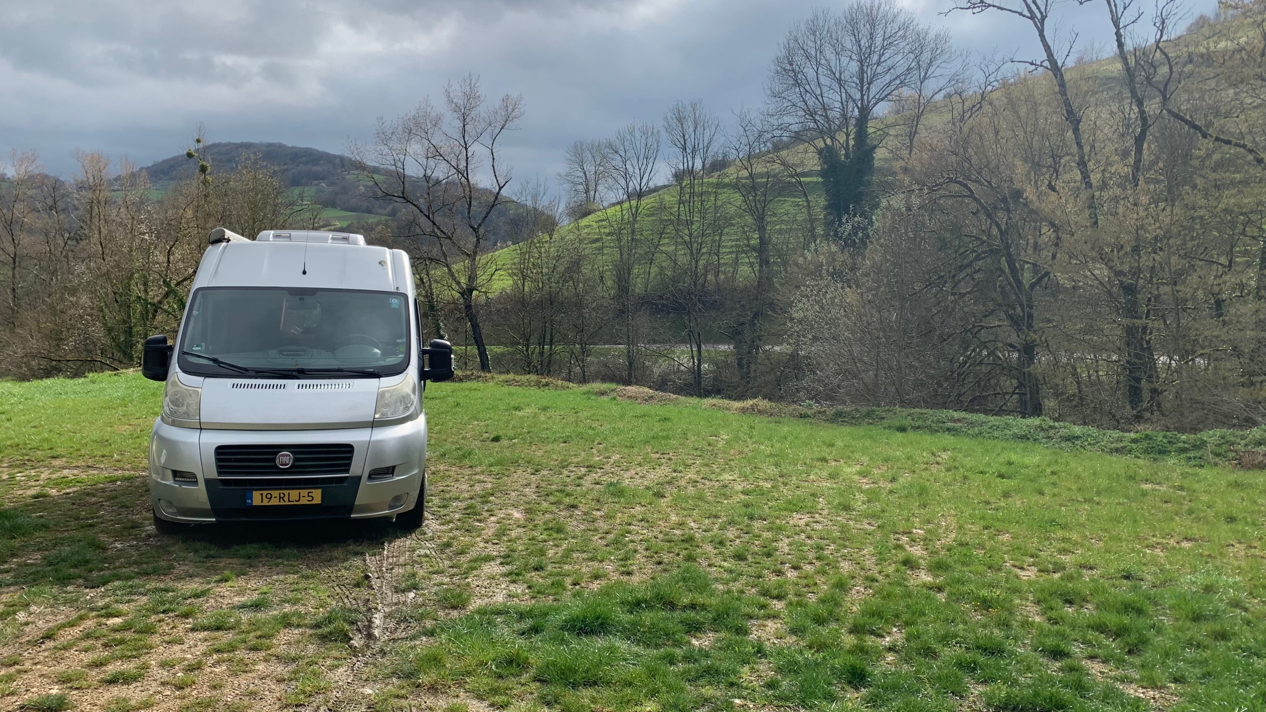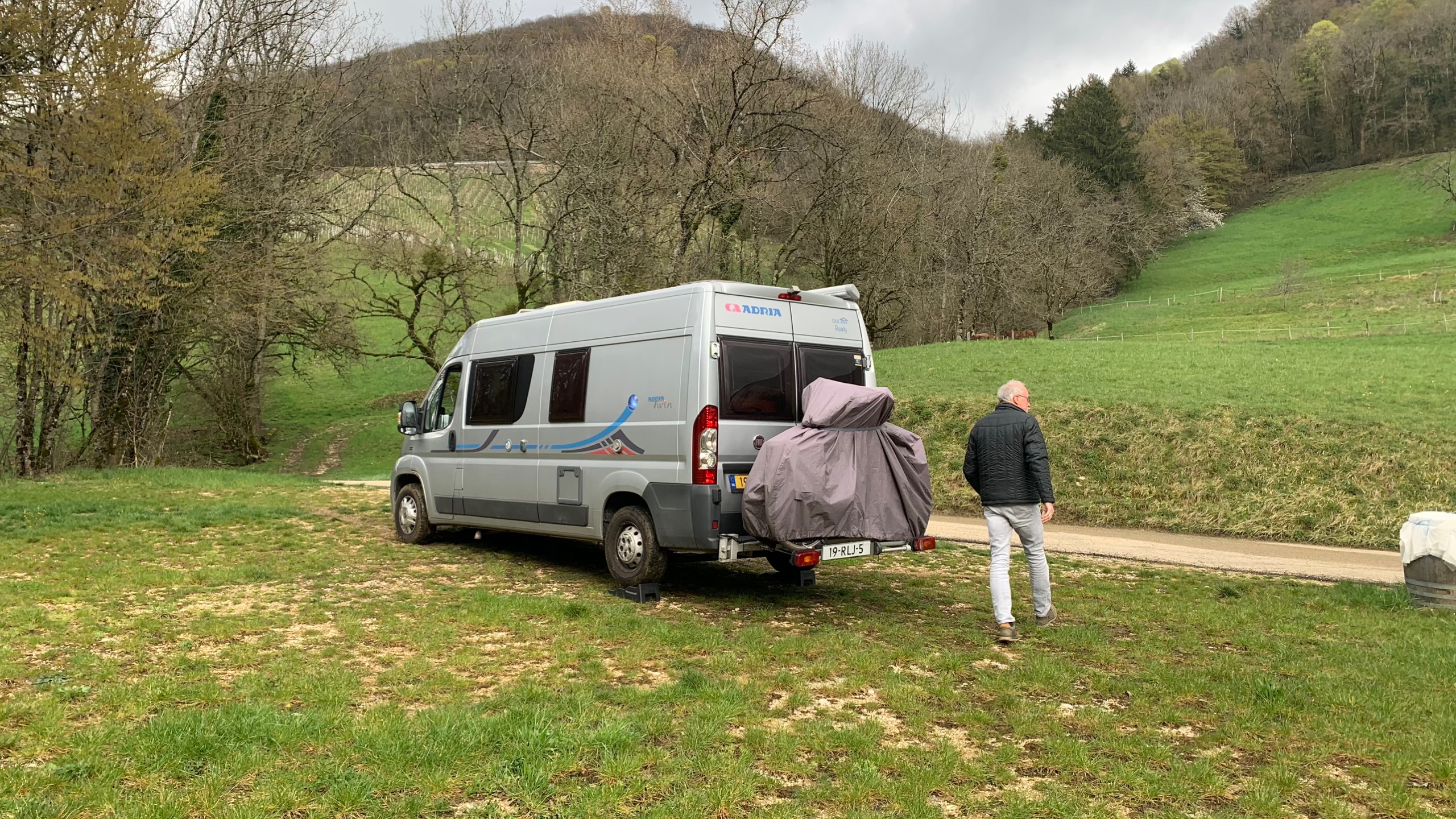 Het is voor nu even koud en somber. Als het goed is komt vanmiddag het zonnetje weer tevoorschijn. We halen een fles wijn van het domein waar we staan en we zetten onze reis voort.