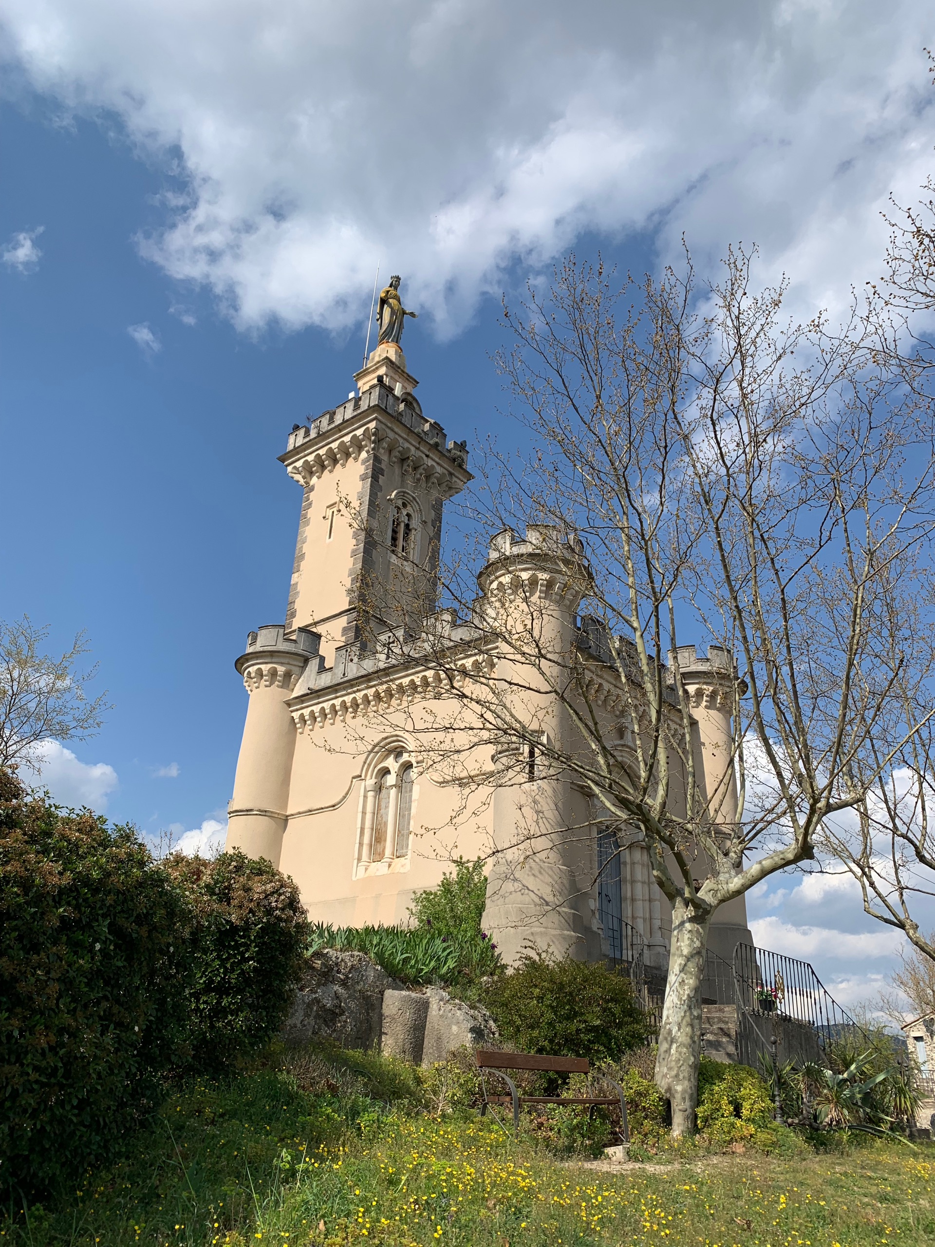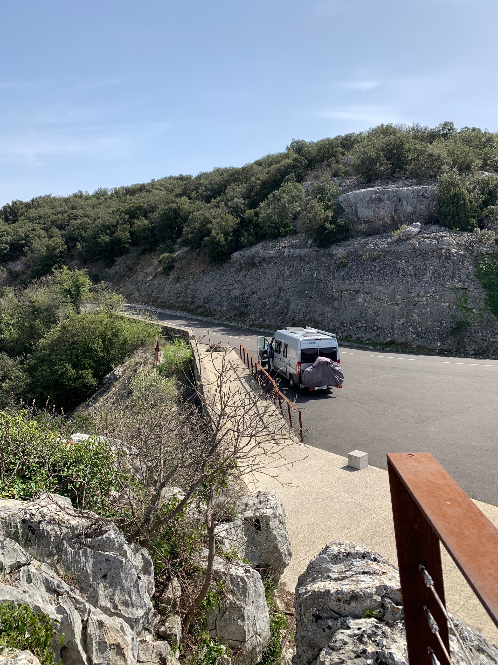 Vandaag rijden we van Ruoms een route via het Defile de Ruoms. Een weg uitgehakt in de rotsen. We rijden daarna richting de rivier de Ceze. Een prachtige route met mooie uitzichten. Voor de nacht stoppen we in Saint-Ambroix. Bij een cave van FP. Een mooi en rustig plekje. We maken een wandeling naar la Chapelle Dugas hoog op een rots boven het stadje.