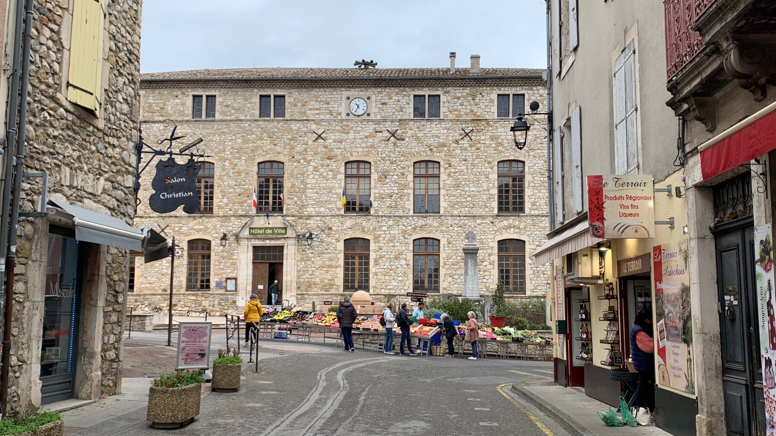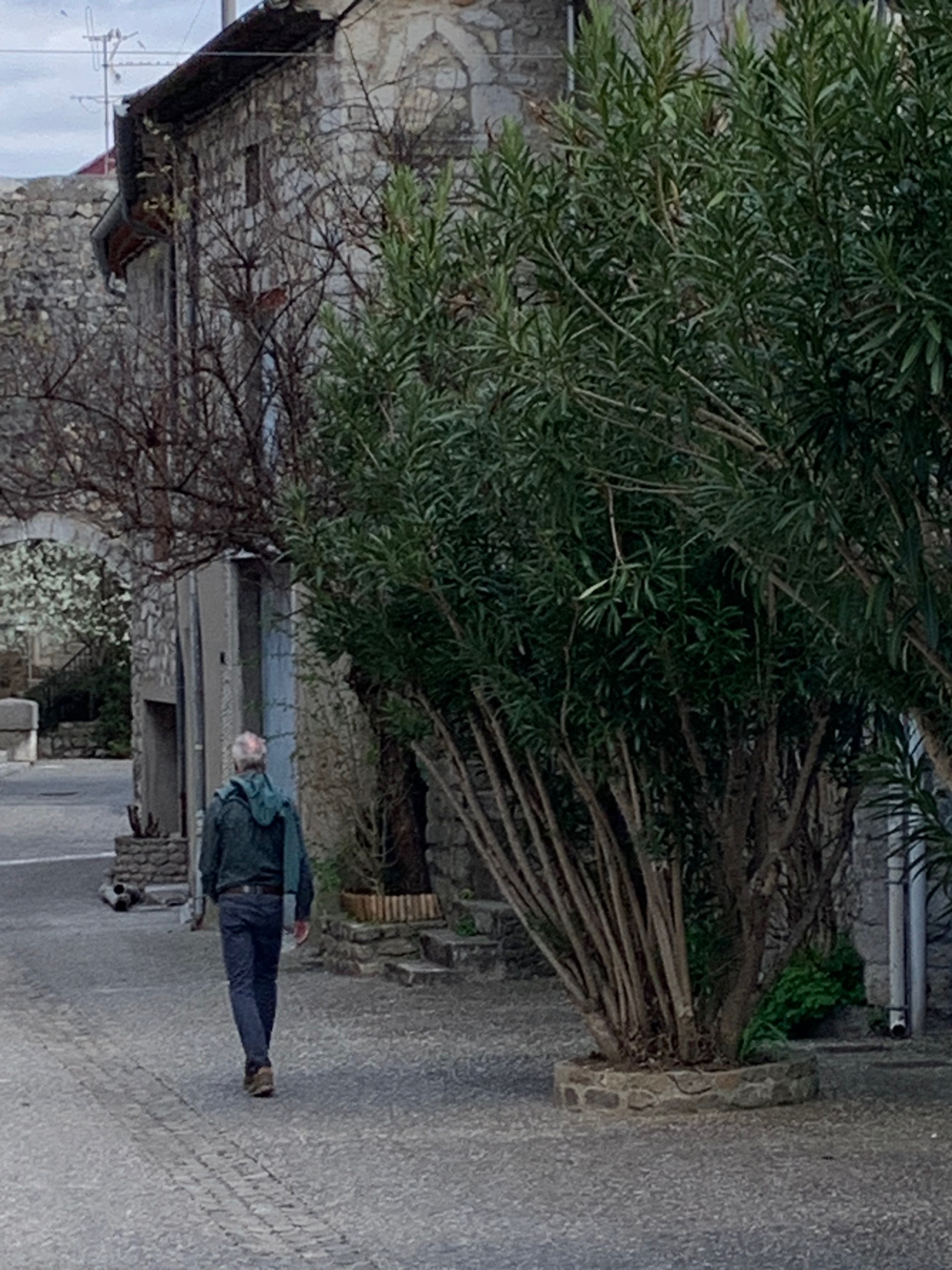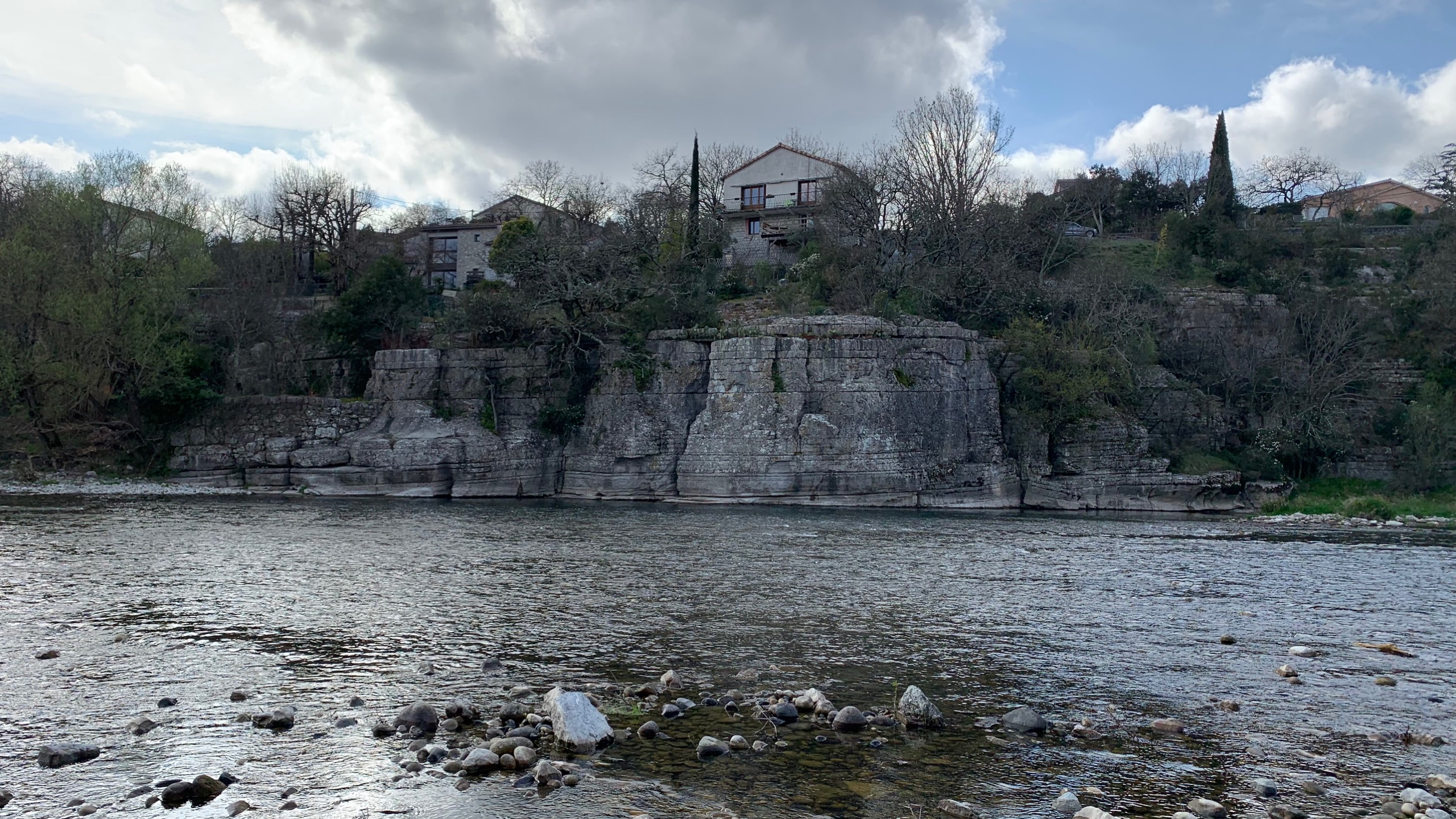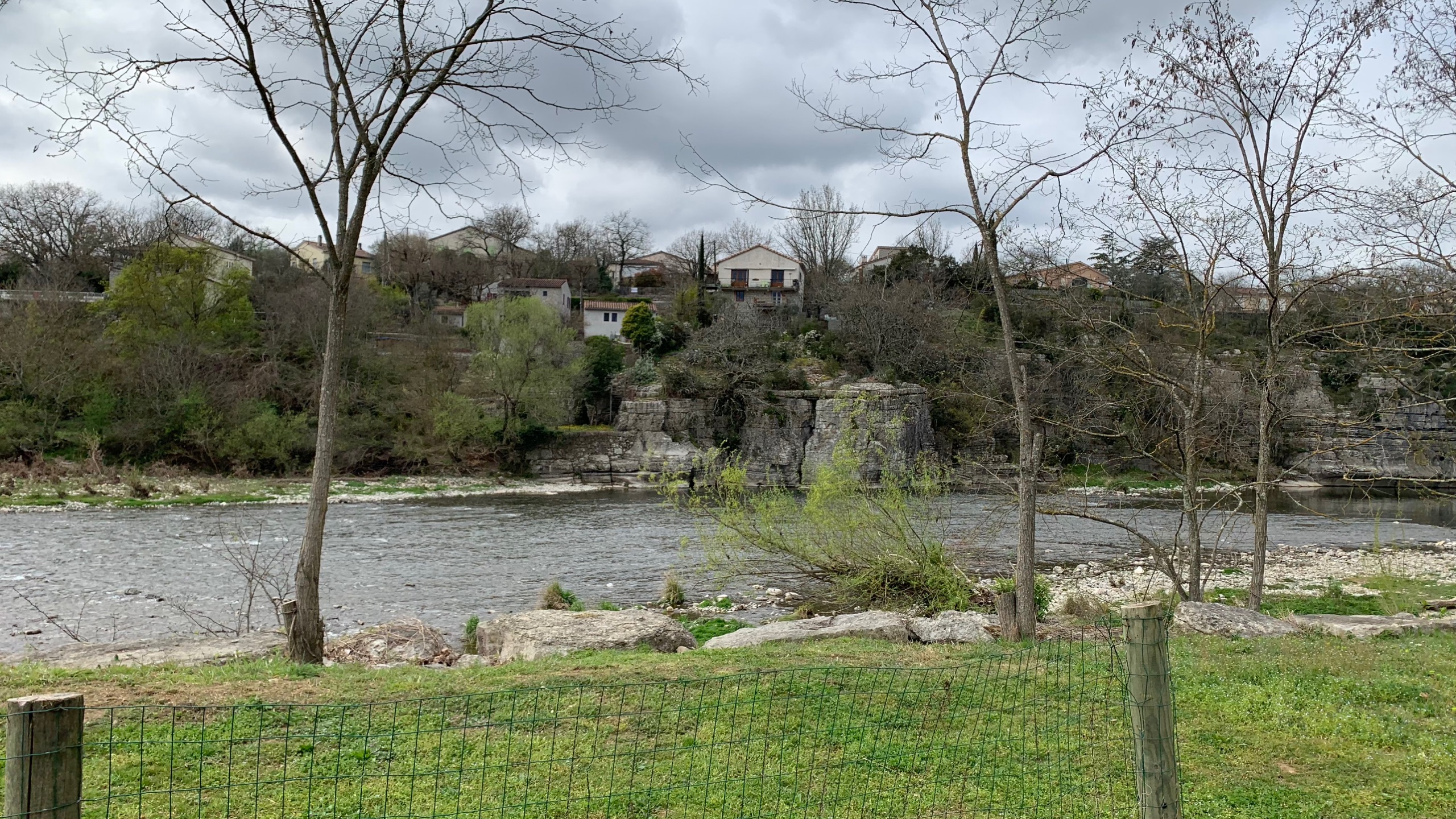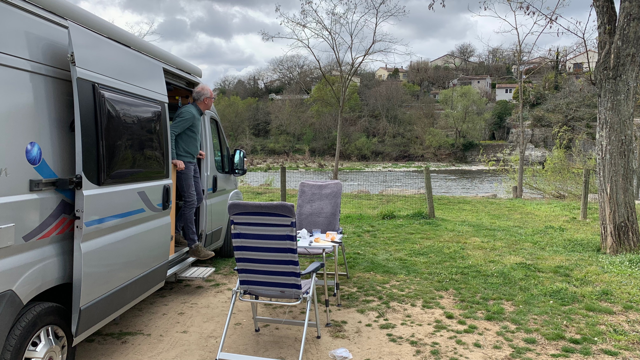 De dag begint bewolkt maar met een prima temperatuur. In de loop van de dag komt het zonnetje door. Het is weer genieten. We halen wat boodschappen bij de Super en gaan bivakkeren op het camperpark in Ruoms. De vroegere municipalcamping waar toen de kinderen rondjes gingen tafeltennissen. Een plekje met mooi zicht op de Ardeche.