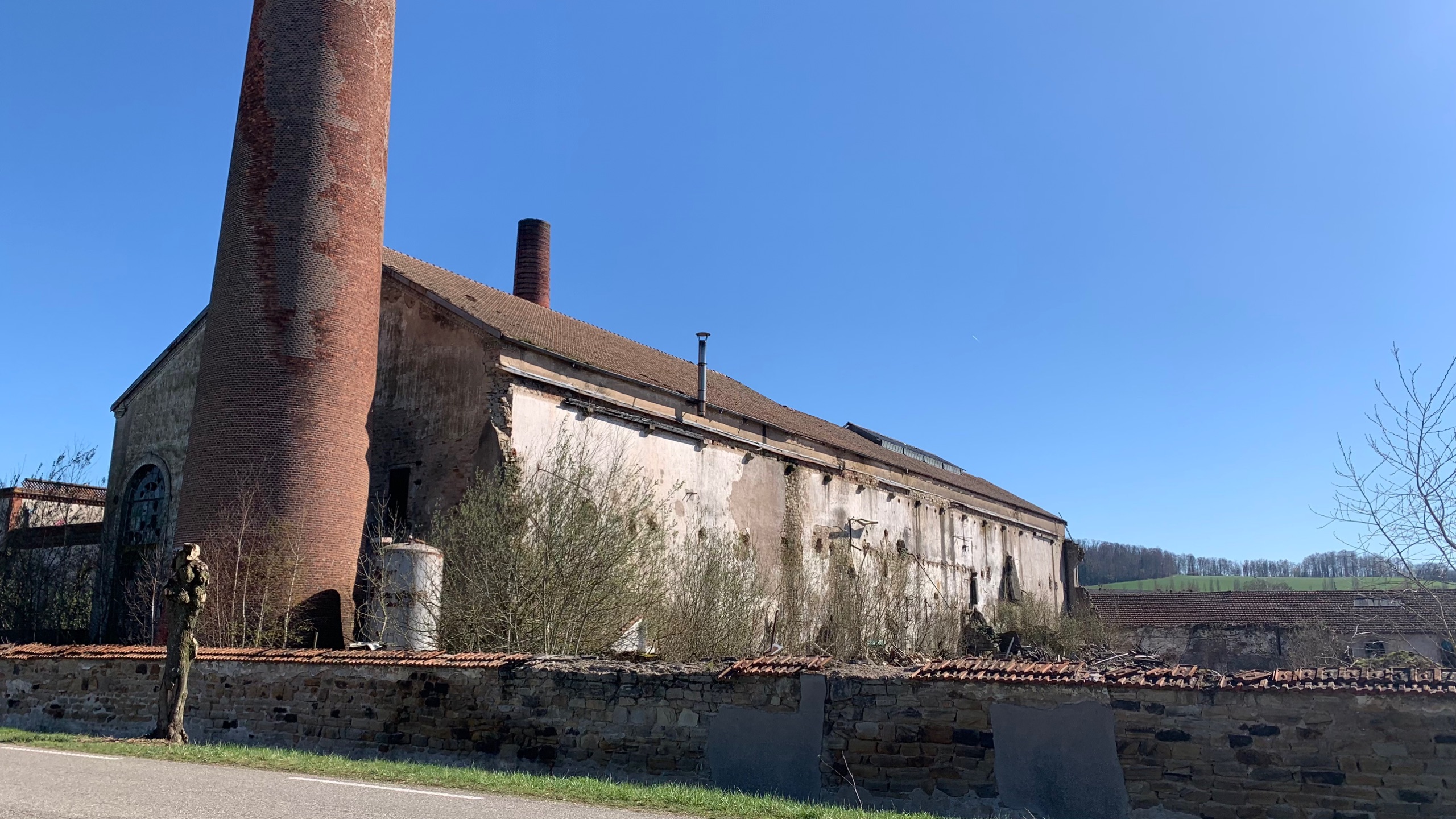 We rijden over mooie wegen en het gaat voorspoedig. Ergens een leuke pauzeplaats aan het Canal des Vosges bij een oude fabriek.