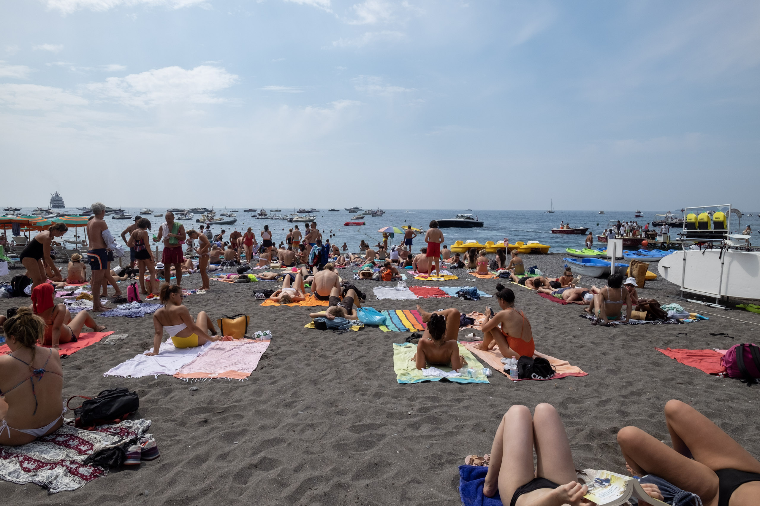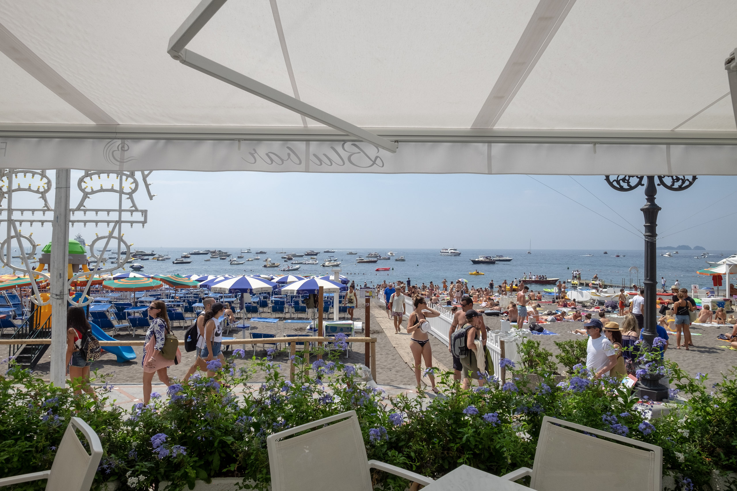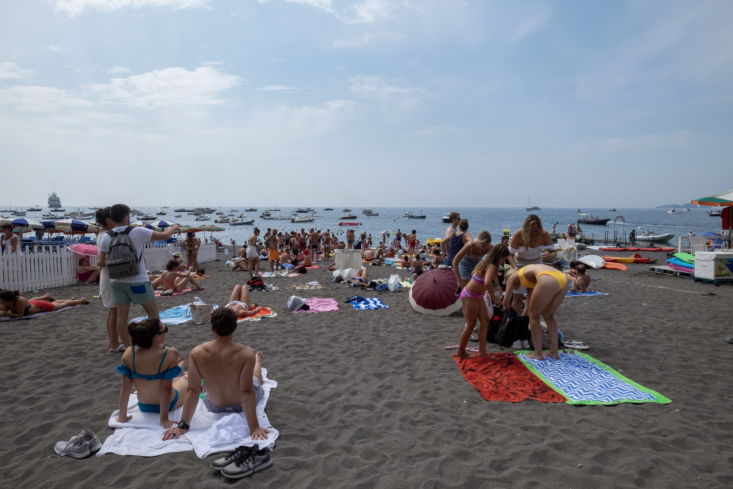 By the time we arrived, the public beach was crowded, and the paid lounge areas were rapidly filling up.