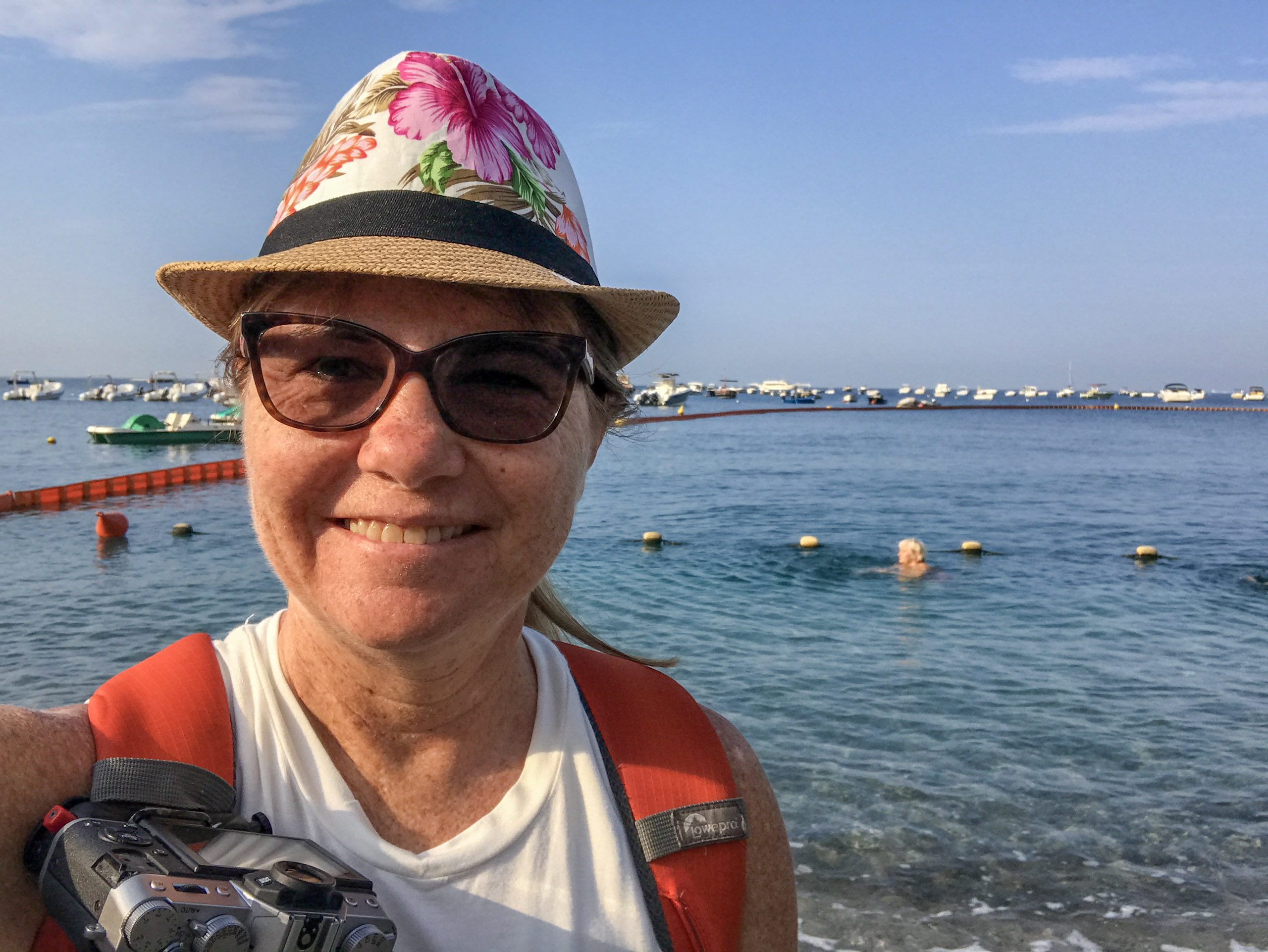 I headed to the beach to put my feet in the Mediterranean Sea. The water was warm and clear. A few locals were already in the water but the tourists hadn’t yet begun to occupy the rows of beach chairs. The sand is dark unlike our Southern California beach sand. I learned later that the black color comes lava rock.