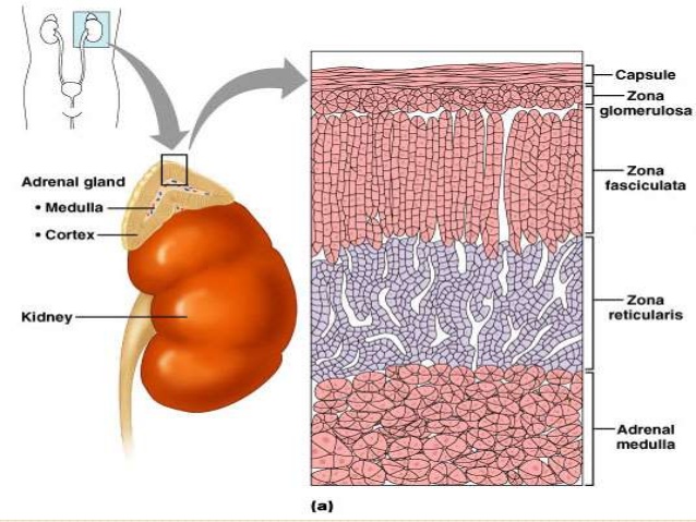 The suprarenal gland (adrenal gland) is located at the top of each kidney; therefore each person has two suprarenal glands. This glands are made up of two distinct parts.....