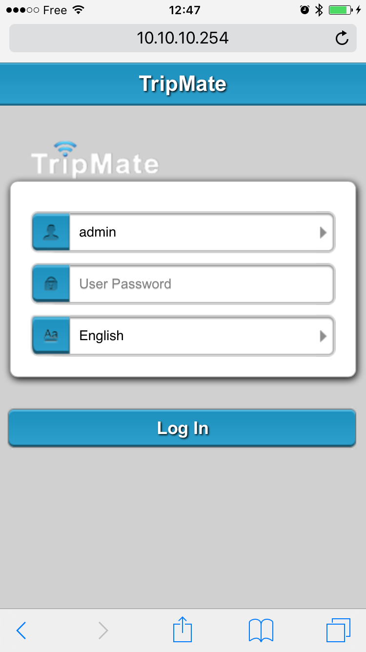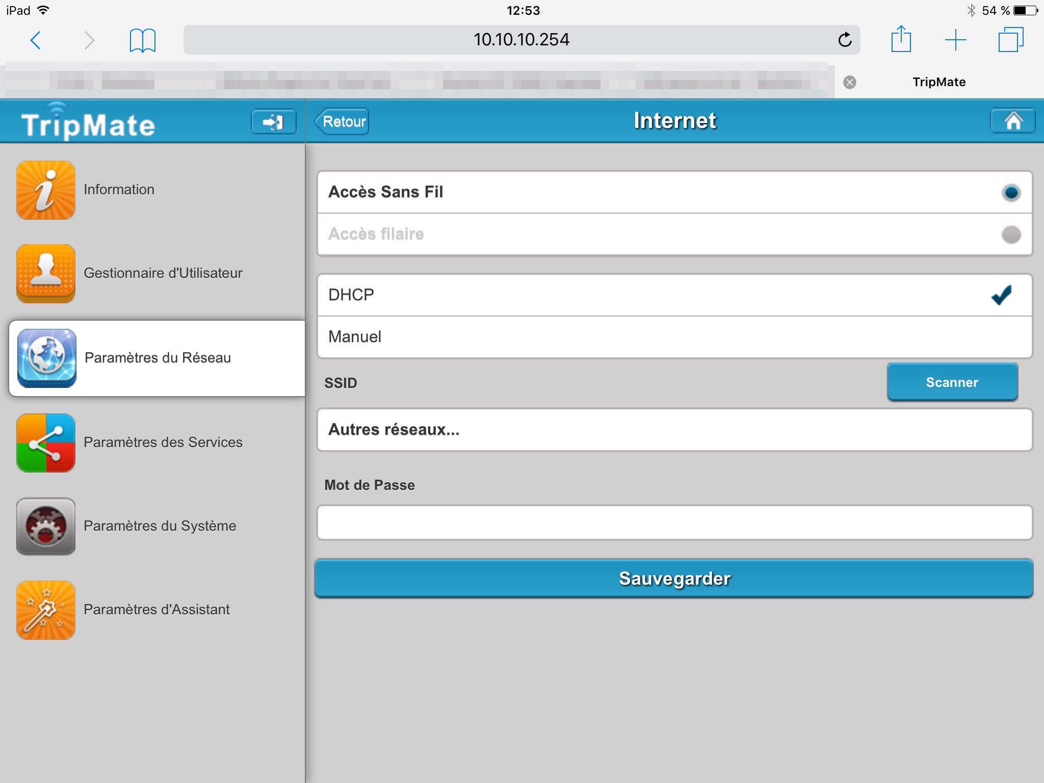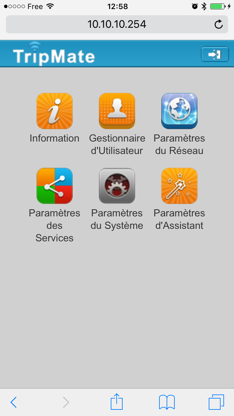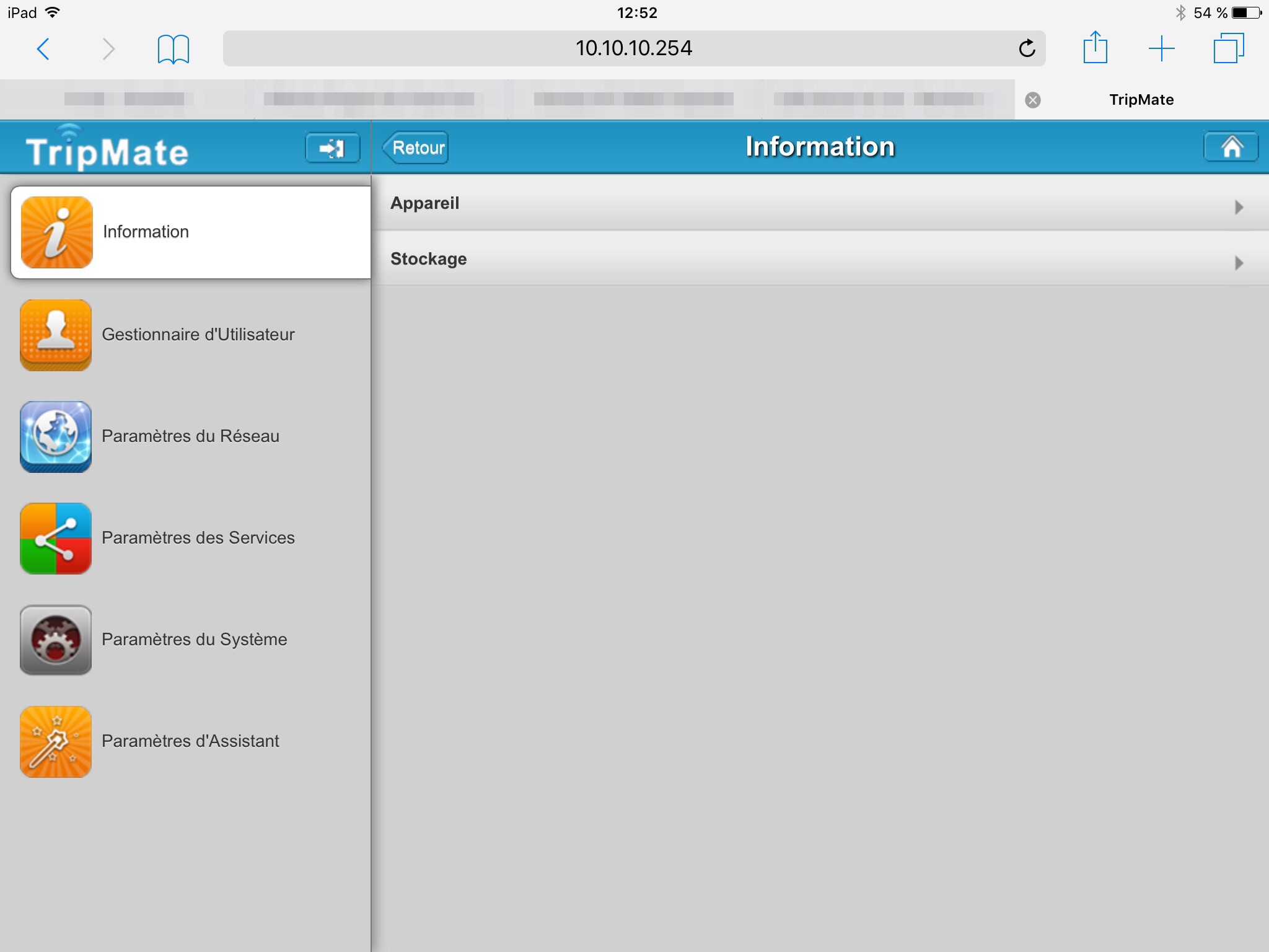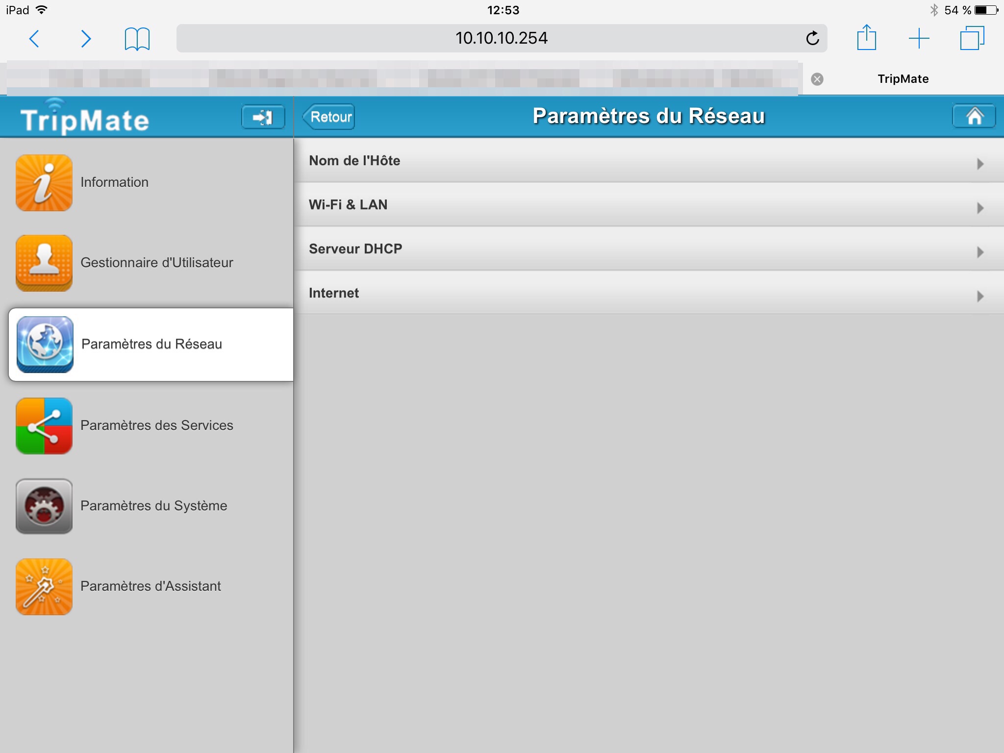 - Dans mon navigateur, je tape l'adresse 10.10.10.254 (la deuxième fois que je l'ai fait, j'ai tapé trip et safari a retrouvé l'adresse seul.)