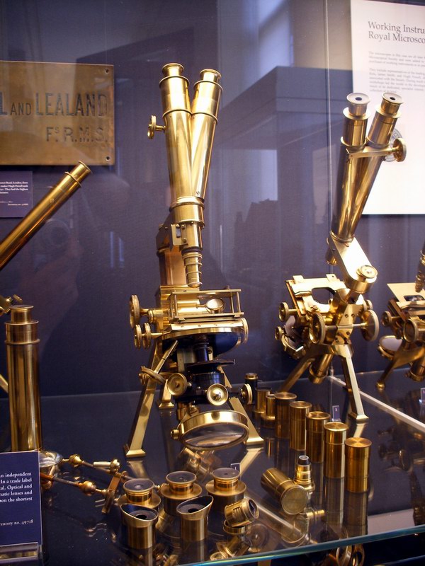 Contribution: Leeuwenhoek's microscope has a pretty basic design. The lens were made from soda lime glass. Using the glass he made tiny spheres the would magnify up to 200x. The object being magnified is placed on the point, then using the screws you would focus and reposition the object.