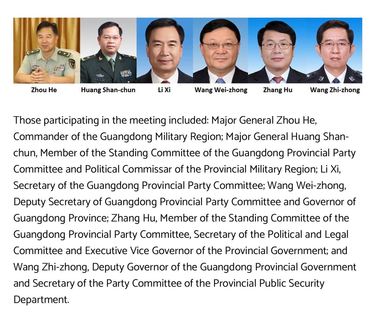 Zhang Hu,(Currently serving as a member of the Standing Committee of the Guangdong Provincial Party Committee, Secretary of the Political and Legal Committee, Executive Vice Governor of the Provincial Government and Deputy Secretary of the Party Group)