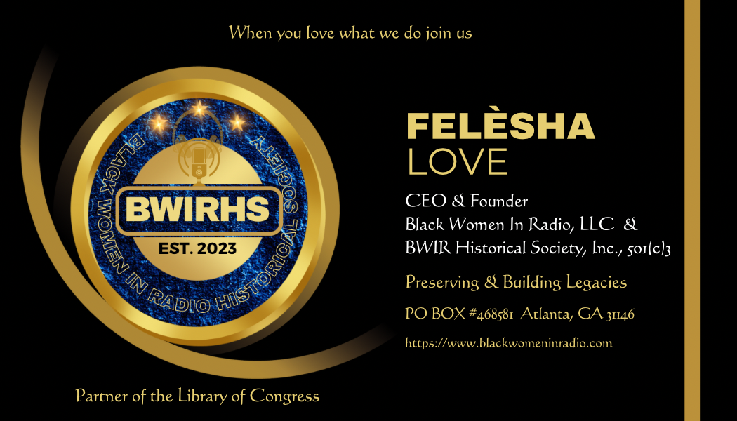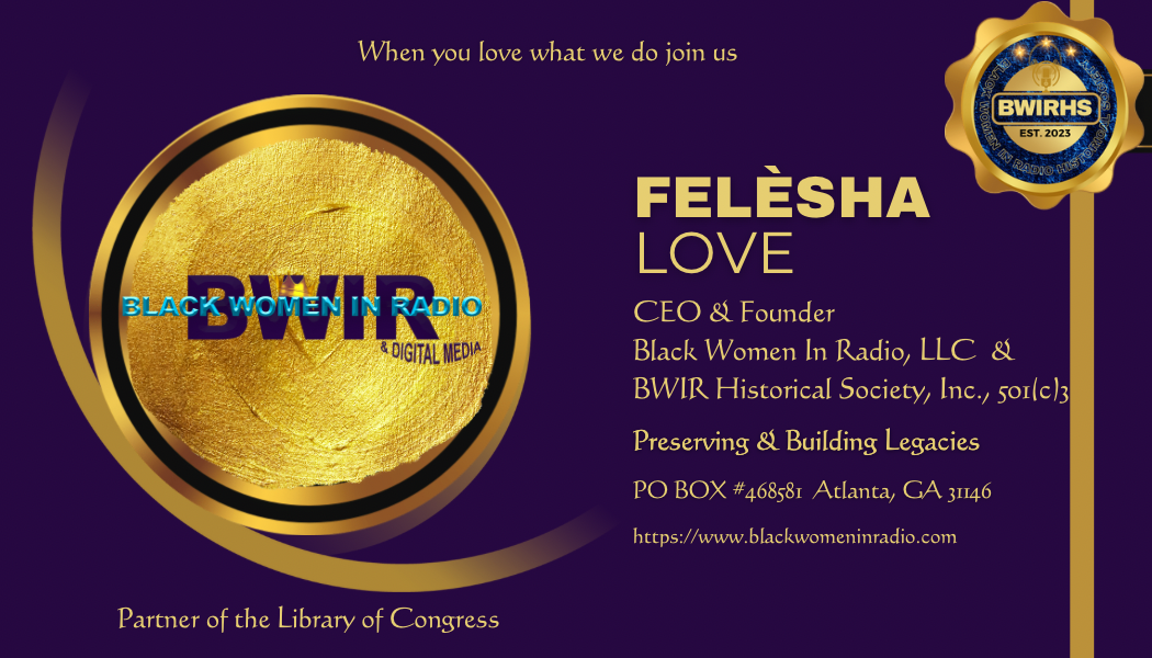 Felèsha Love is Founder and President of Black Women In Radio (BWIR), and its Historical Society 501(c)3 after broadcasting 32 years in Atlanta, St. Louis, Cincinnati and the regional southeast.