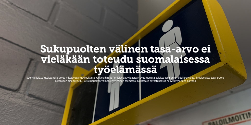 Sukupuolten välinen tasa-arvo ei vieläkään toteudu suomalaisessa työelämässä Suomi sijoittuu useissa tasa-arvoa mittaavissa tutkimuksissa kärkimaihin, ja Pohjoismaat ylipäätään ovat monissa asioissa tasa-arvon edelläkävijöitä. Työelämässä tasa-arvo ei kuitenkaan aina toteudu, ja sukupuolten välinen eriytyminen asemassa, palkassa ja arvostuksessa näkyvät yhä tänä päivänä.
